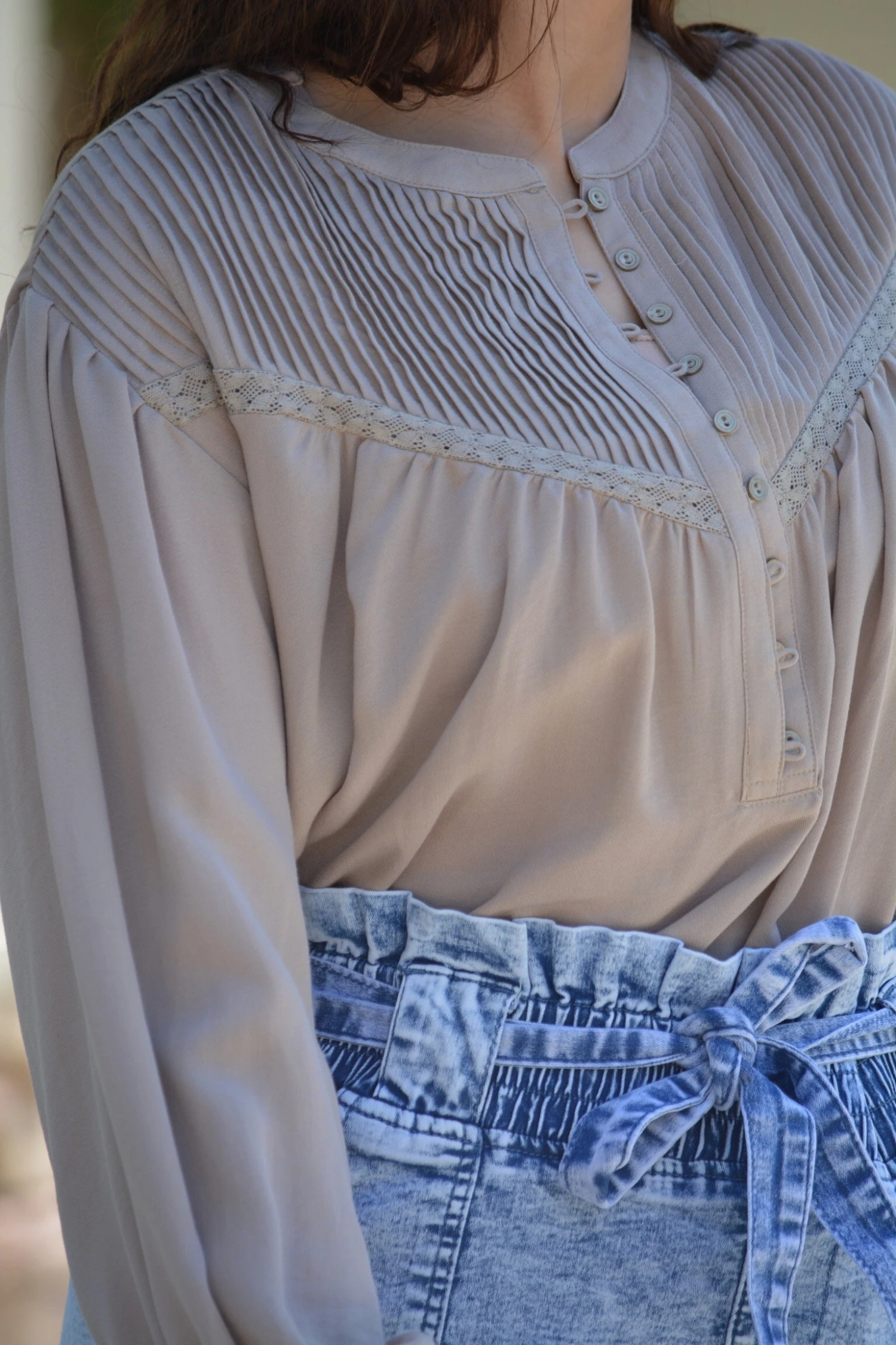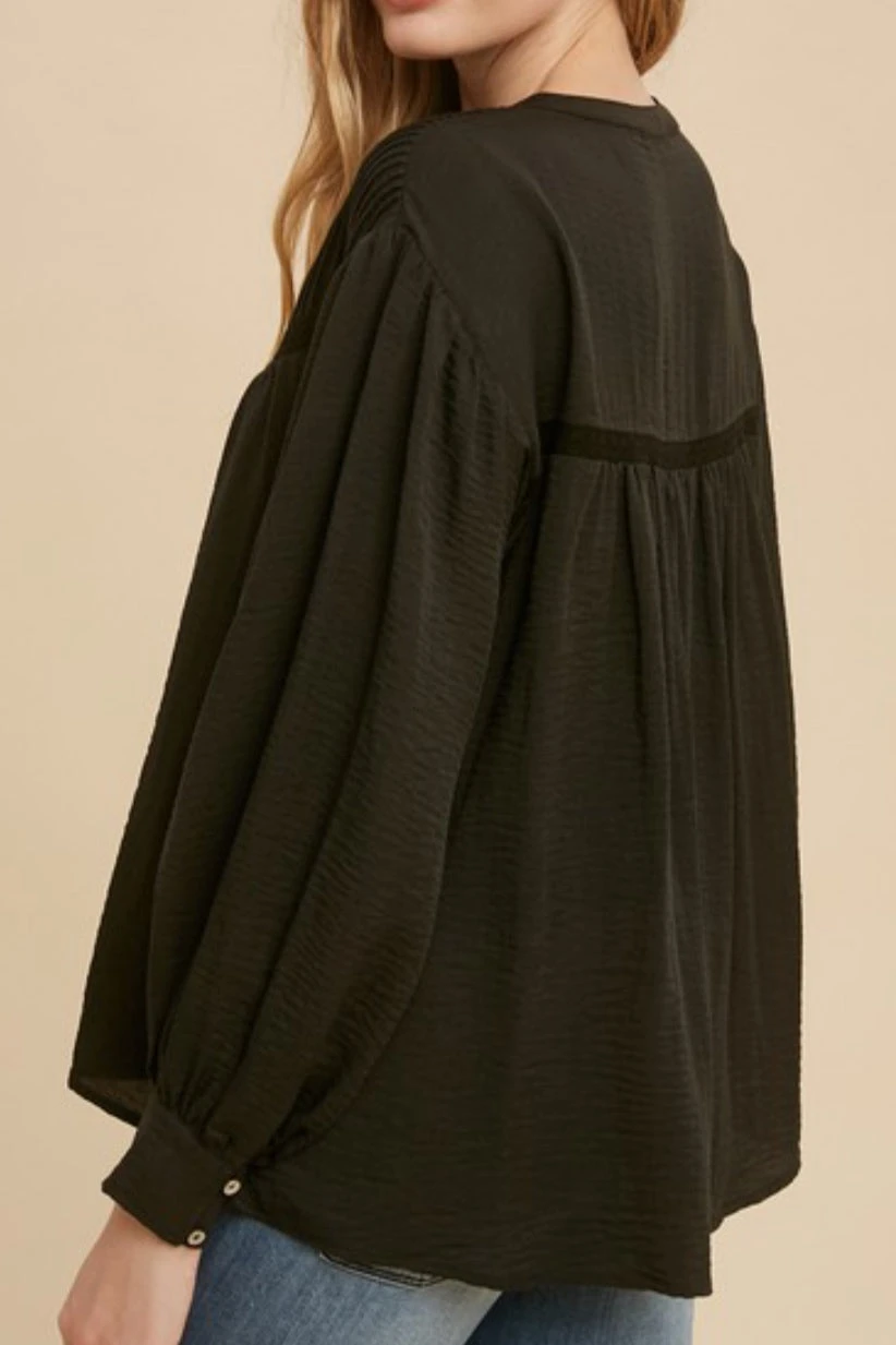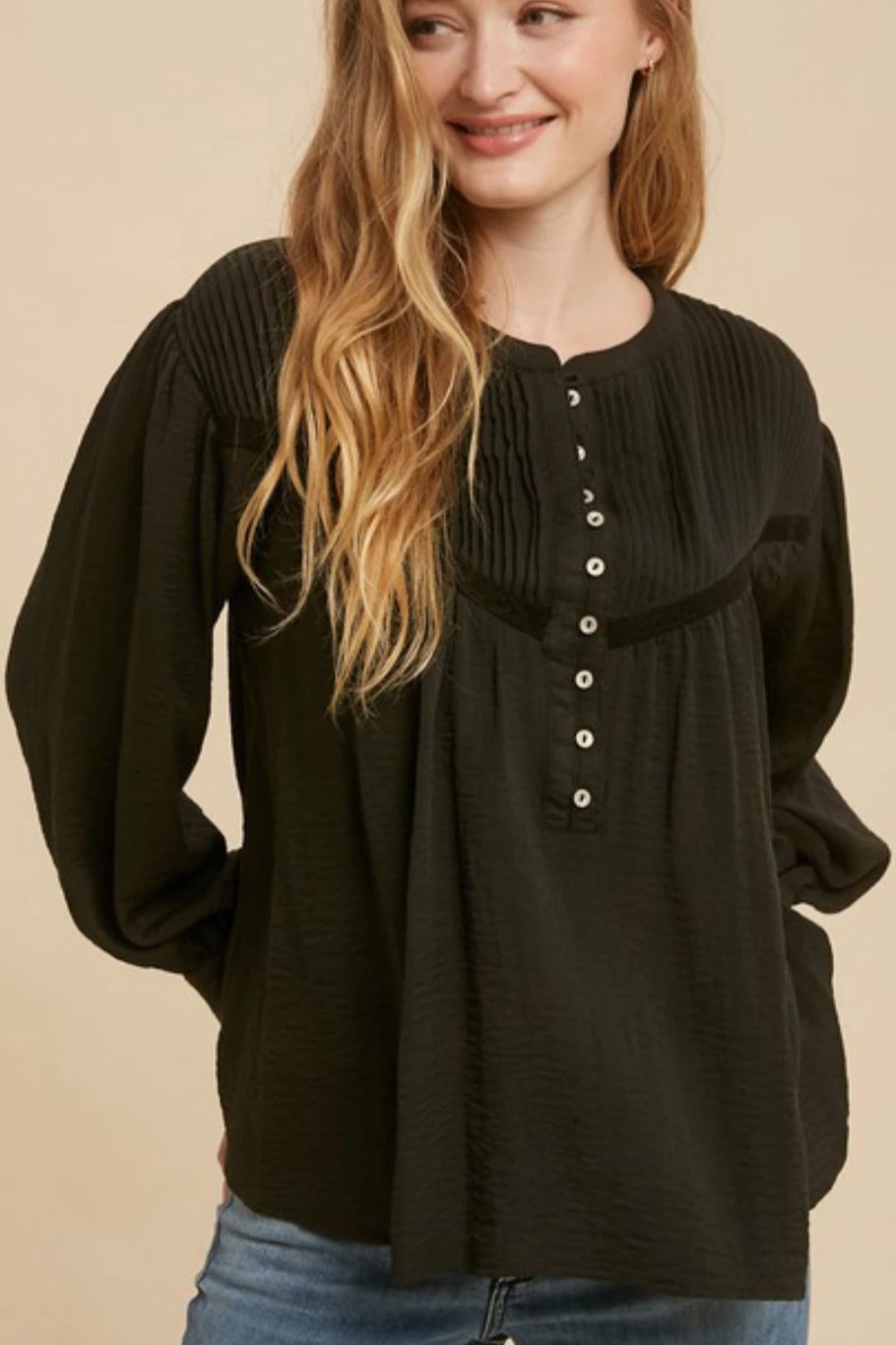 Another dainty top! Crochet is all the rage this spring and summer and we can’t get enough of it. Our Adella  top features beautiful crochet details, pintuck detail, workable front buttons and buttoned cuff sleeves. Pair it with denim or dressy skirt for a cute look! Fabric does not stretch. Modeled in medium.