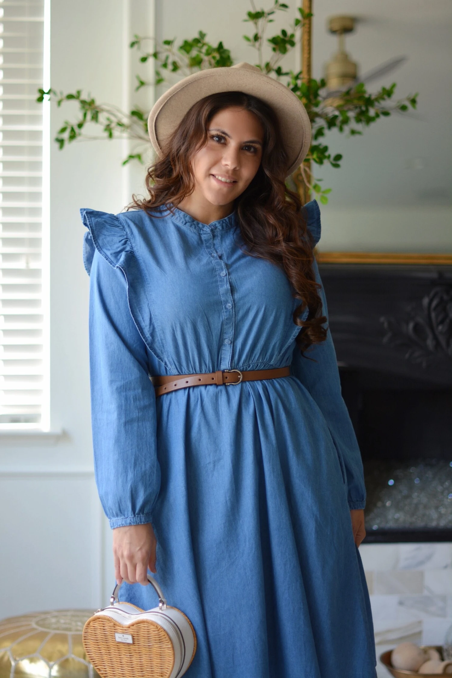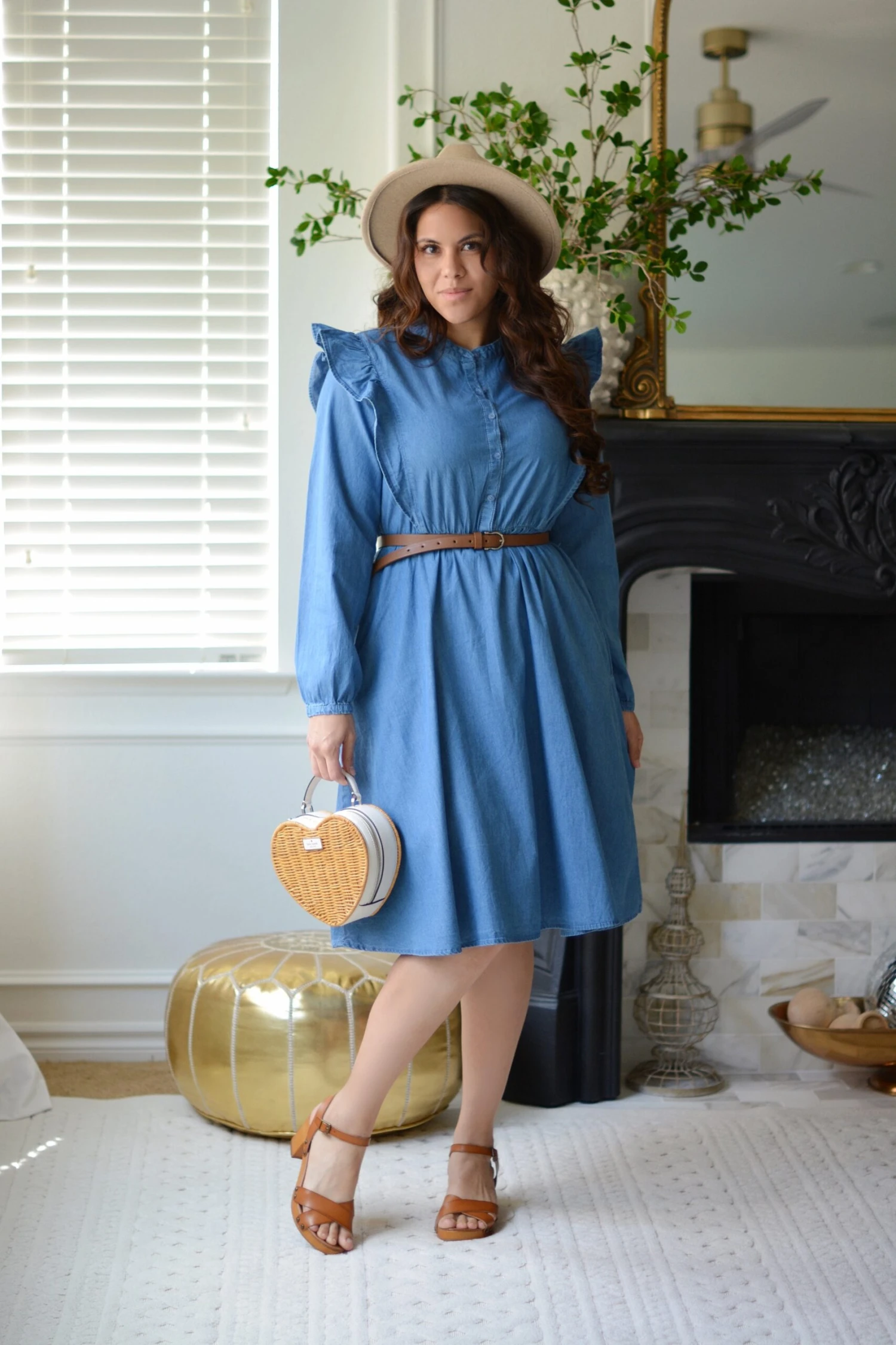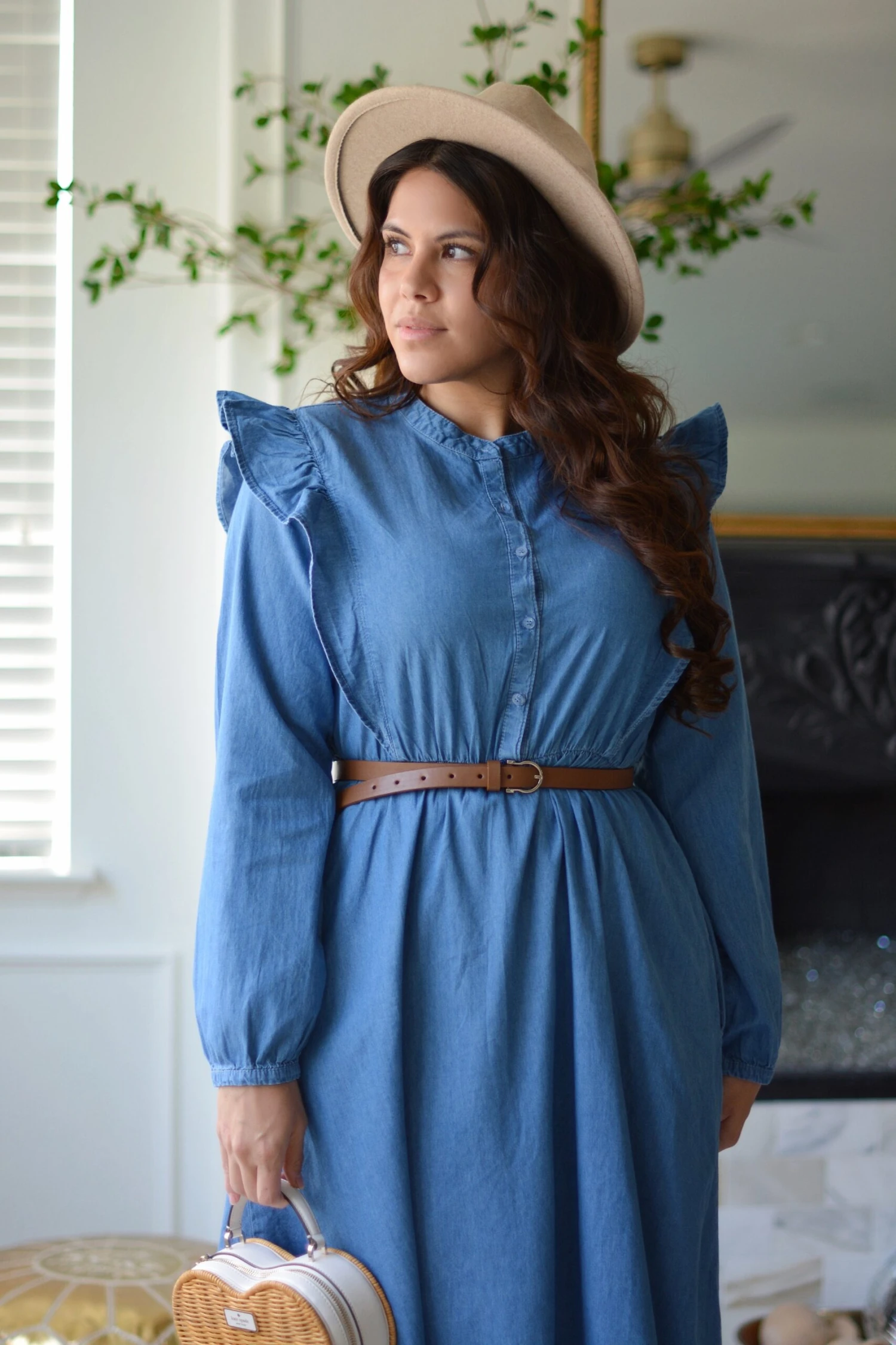 We never get tired of denim! Our Alba dress features a nice stretch cotton, with ruffled shoulders, full buttoned front, elastic waist, pockets, and belt! Modeled in medium 5’6″.Â