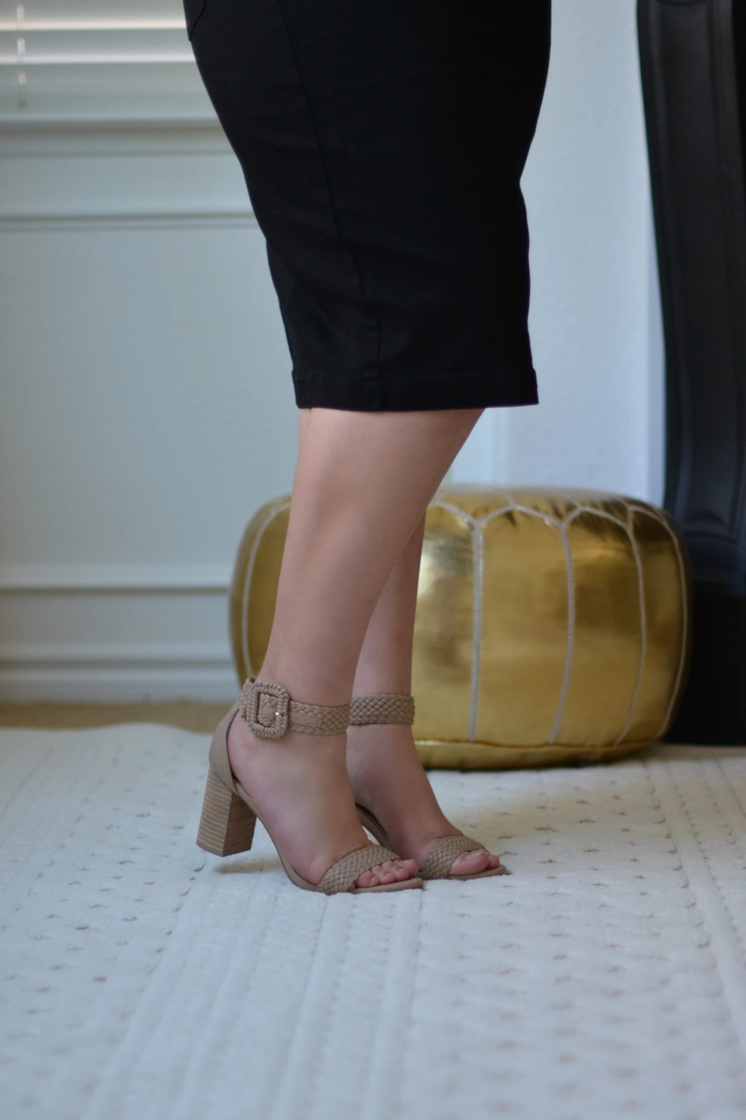 Our Amelia heel features a vegan braided leather upper, anklet, padded footbed, and slightly rounded  toe. Dress up any outfit with this adorable heel.  Heel height is 3 inchesÂ