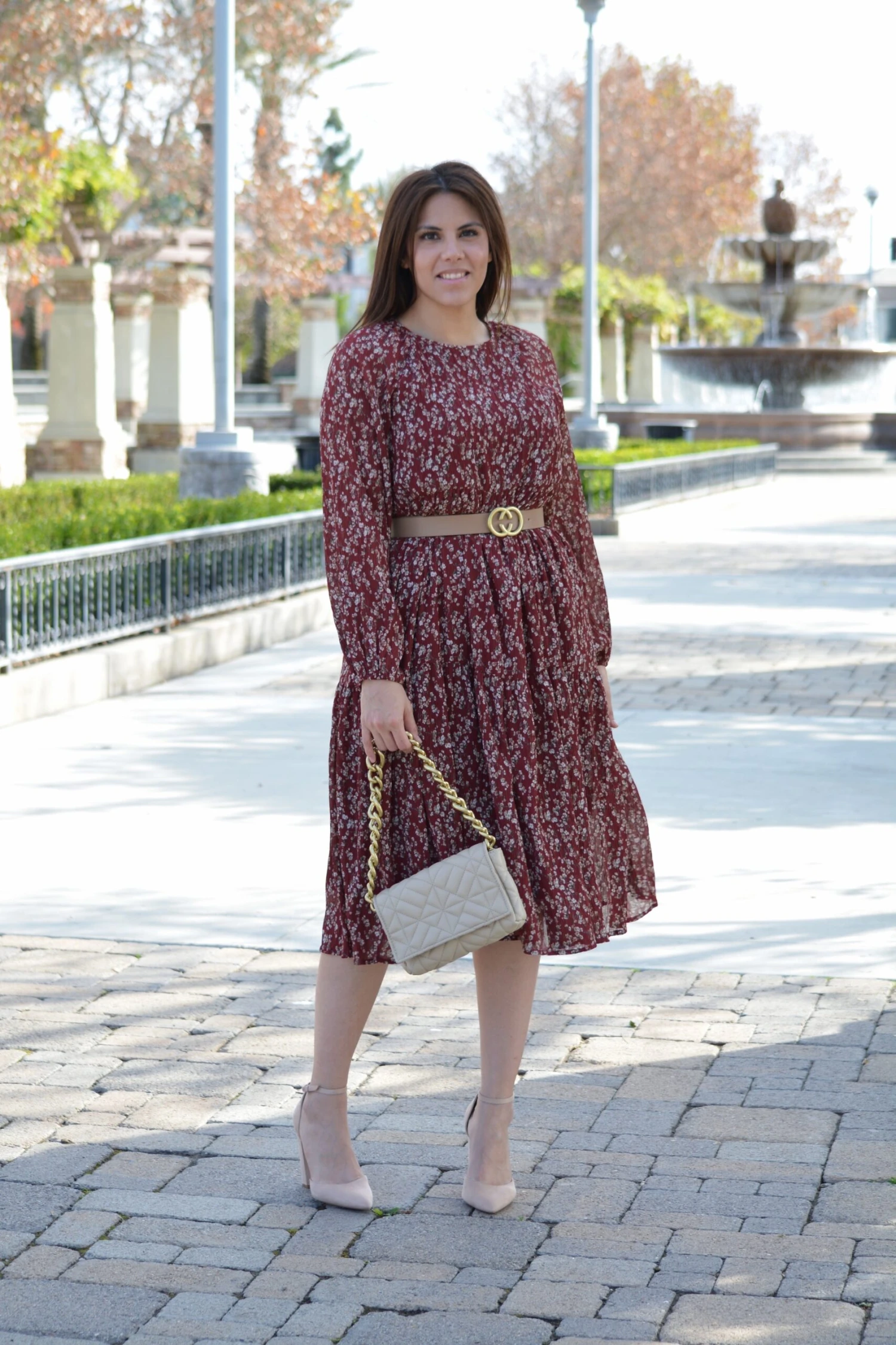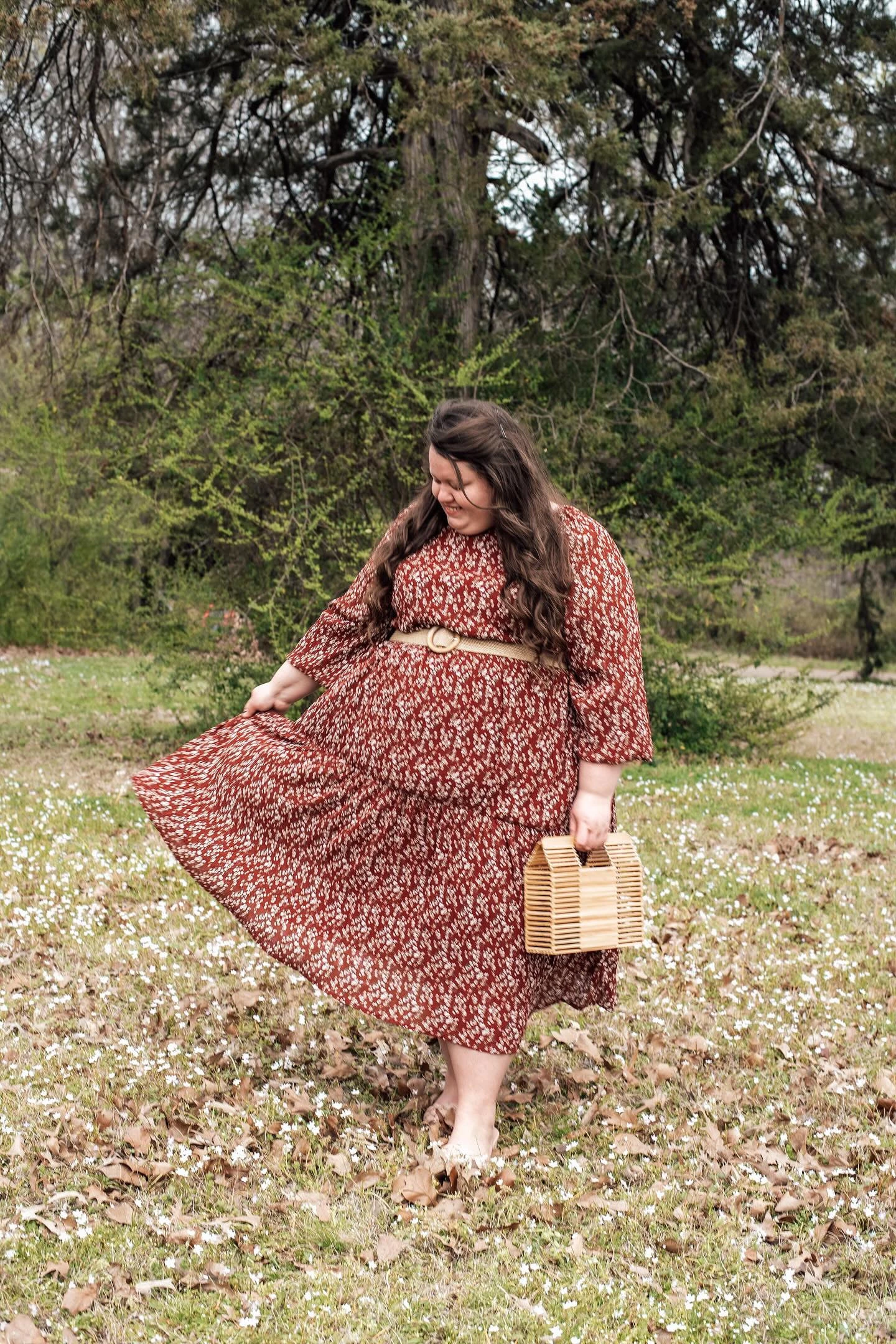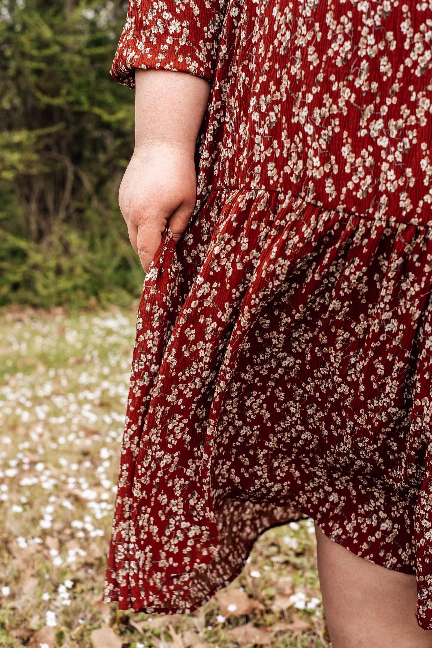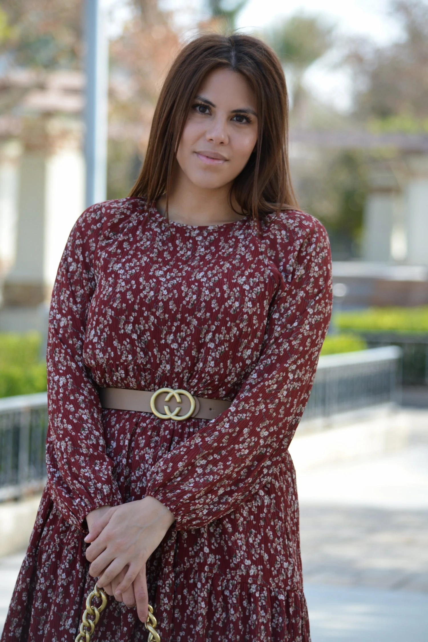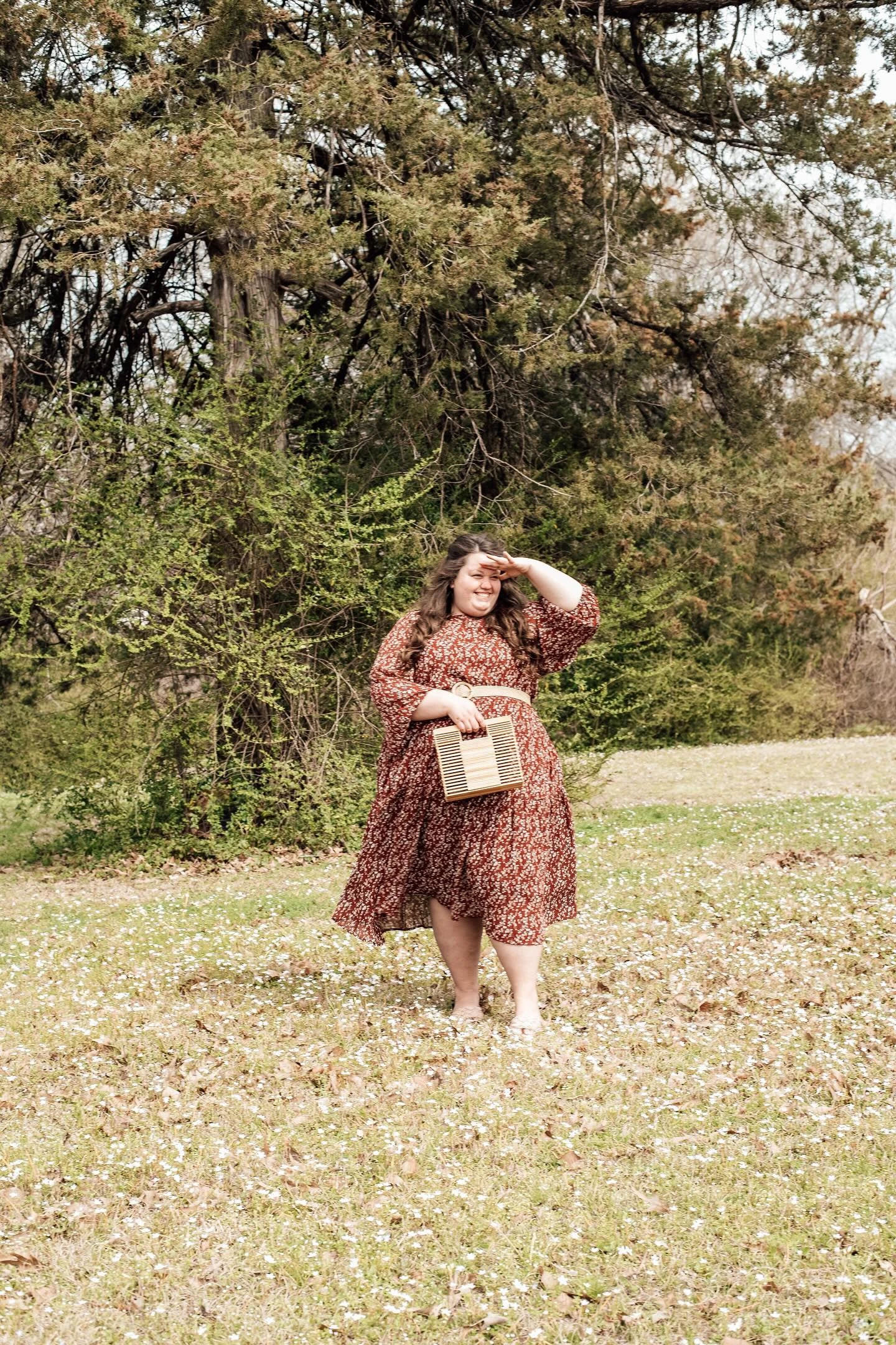 We love this comfy cute dress! Asher features a small tan floral in a stretchy fabric, lining, and pockets. We paired it here with our cognac belt. Modeled in small, 5’6″.