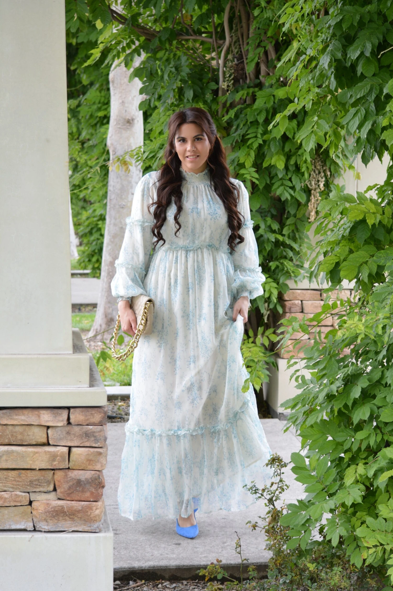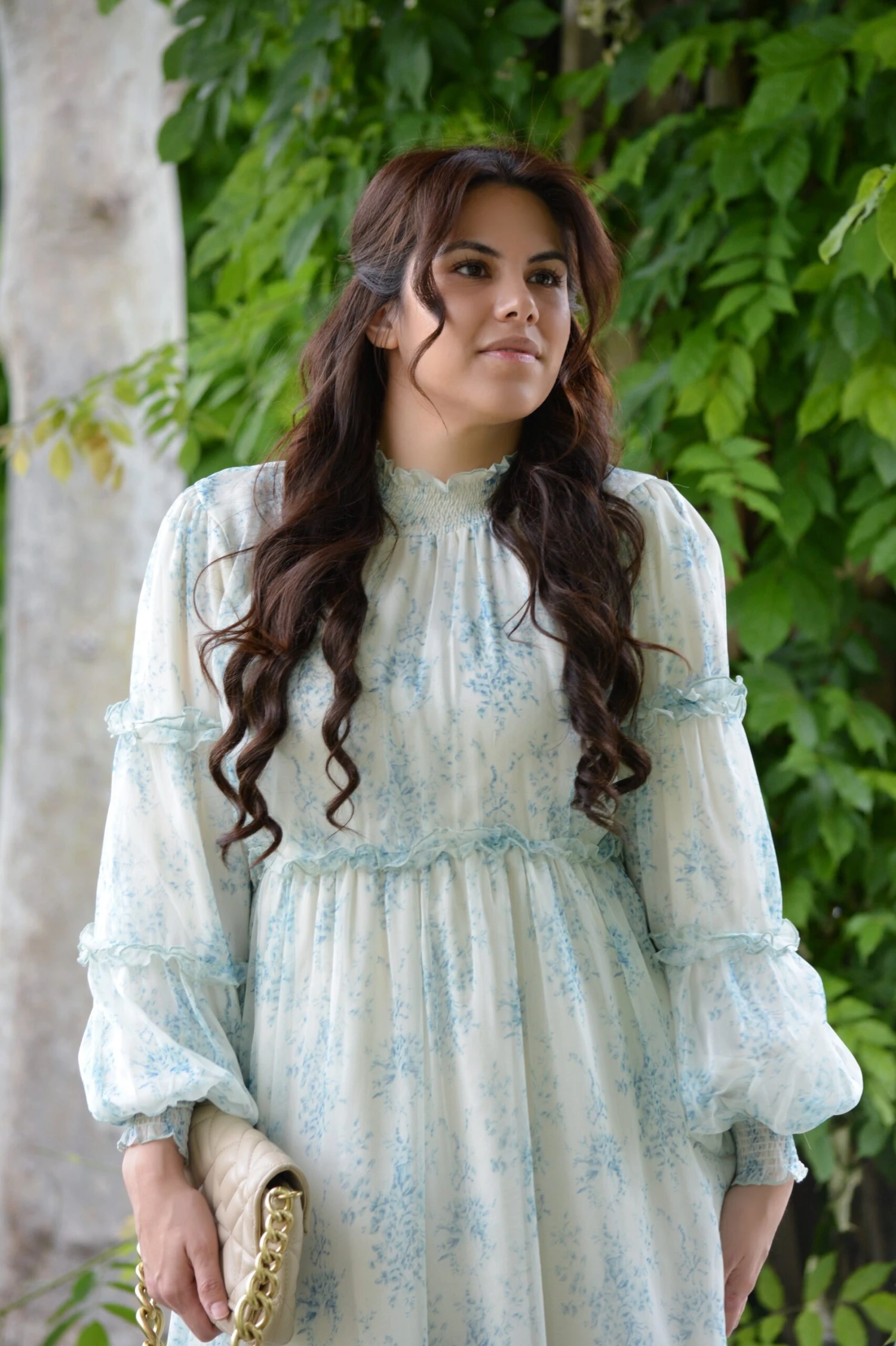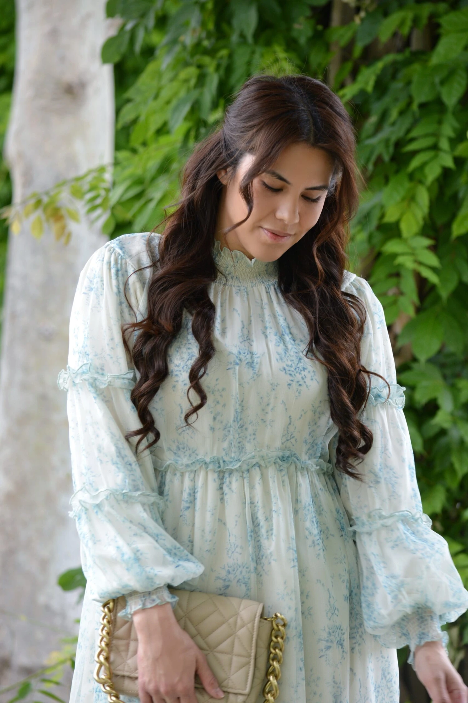 Another beautiful dress for our Pink Label Exclusive Collection! Lovely for spring and summer gatherings. Barcelona features an upgraded full lining, side zipper, lovely ruffled details, and smocked neckline and cuff. Florals consist of shades of teal. Fabric does not have stretch.