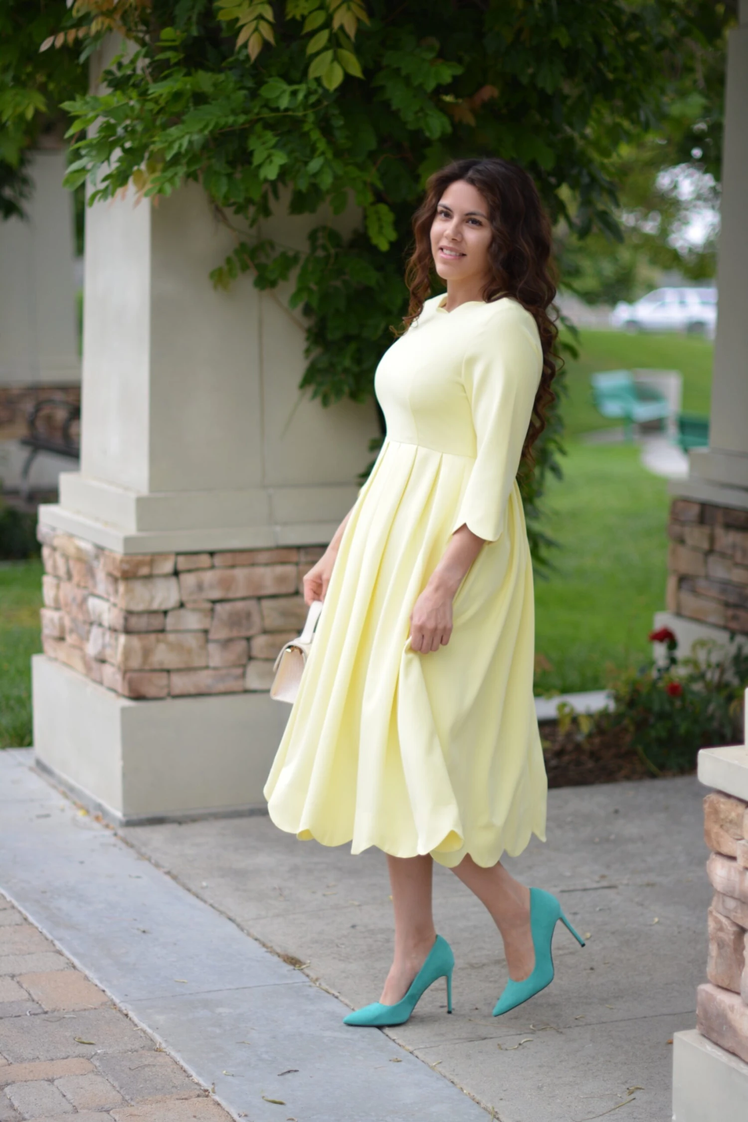 Our Berlin dress is by far our most favorite dress ever! The quality is gorgeous and the design is perfection! Featuring a modest scalloped neckline, sleeve, hand hem this beauty will last a lifetime! Fully lined full skirt and back zipper, this dress is stunning, perfect for any special event or bridal party! Modeled in large, fit is small. We suggest sizing up! These are FINAL SALE Â NO EXCEPTIONS.