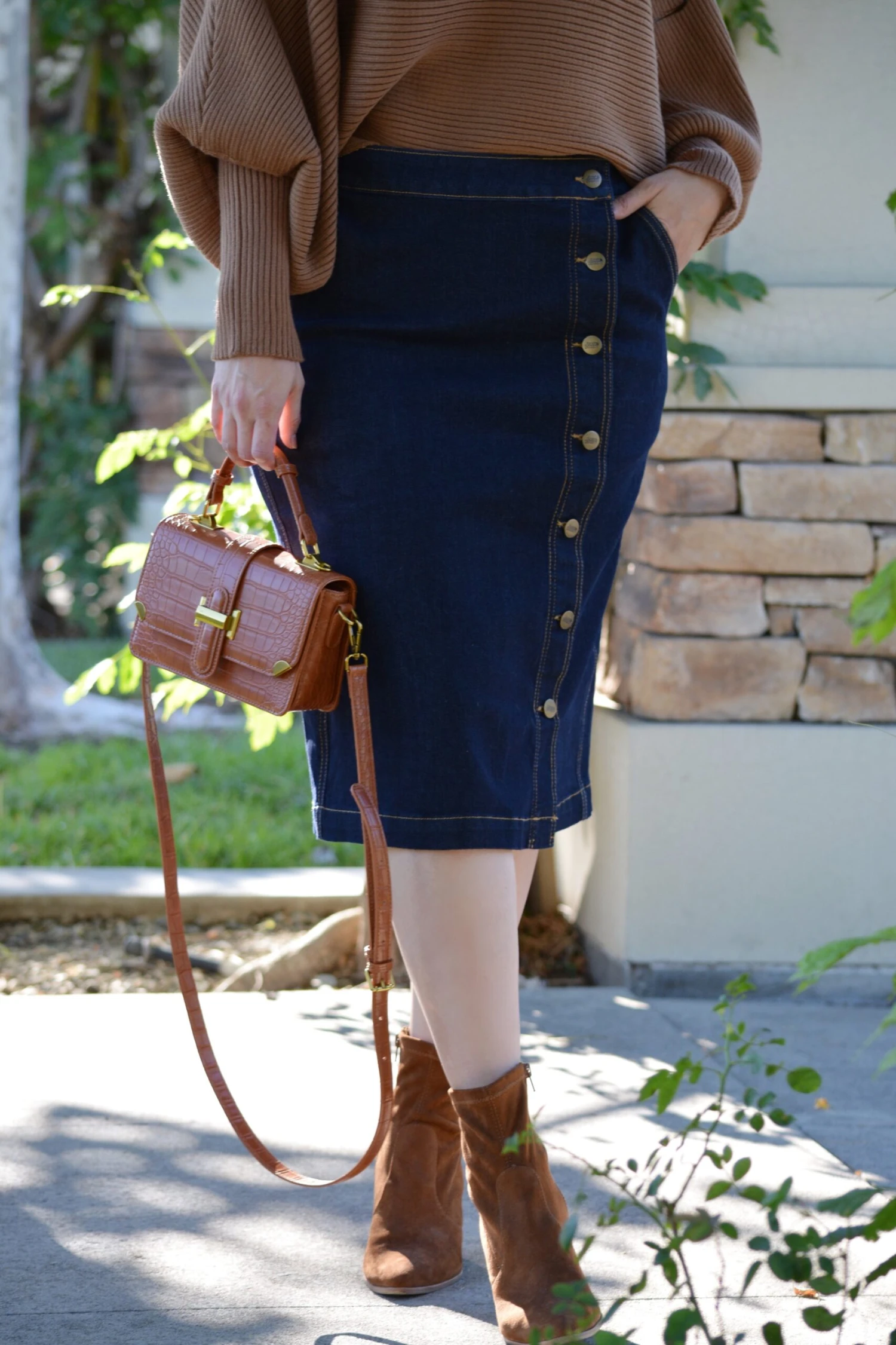 We are so excited to bring more exclusive quality pieces to our Pink Label. We love our new buttoned denim skirt! Chania features a dark wash in a soft stretchy denim, back elastic waist, and typical 5 pocket design, minus the small coin pocket. And yes, it does not have a slit. Top three buttons open, all the others are sewn shut. This will be one of your most comfy denim skirts. Modeled in medium, 5’6”.
