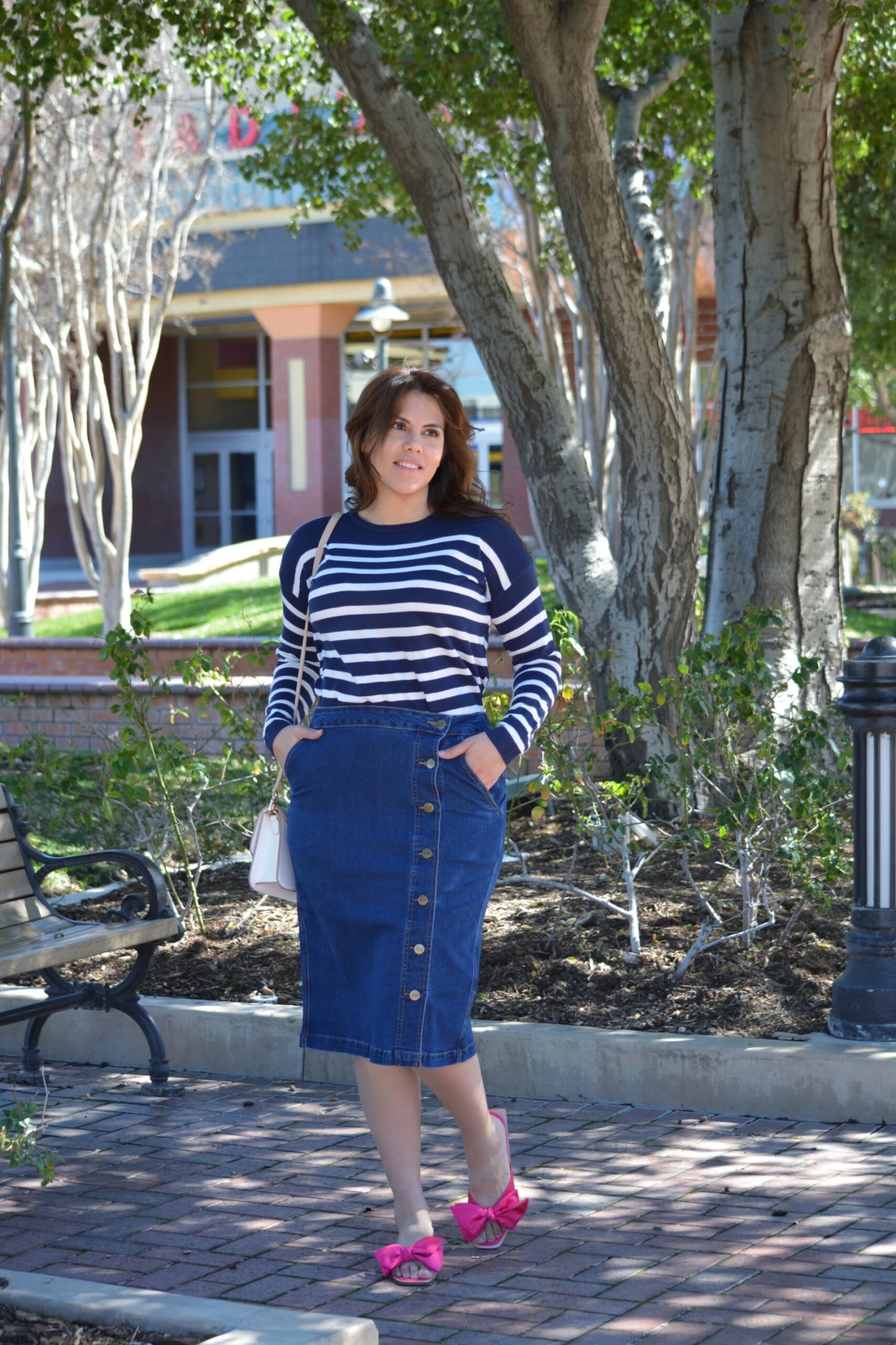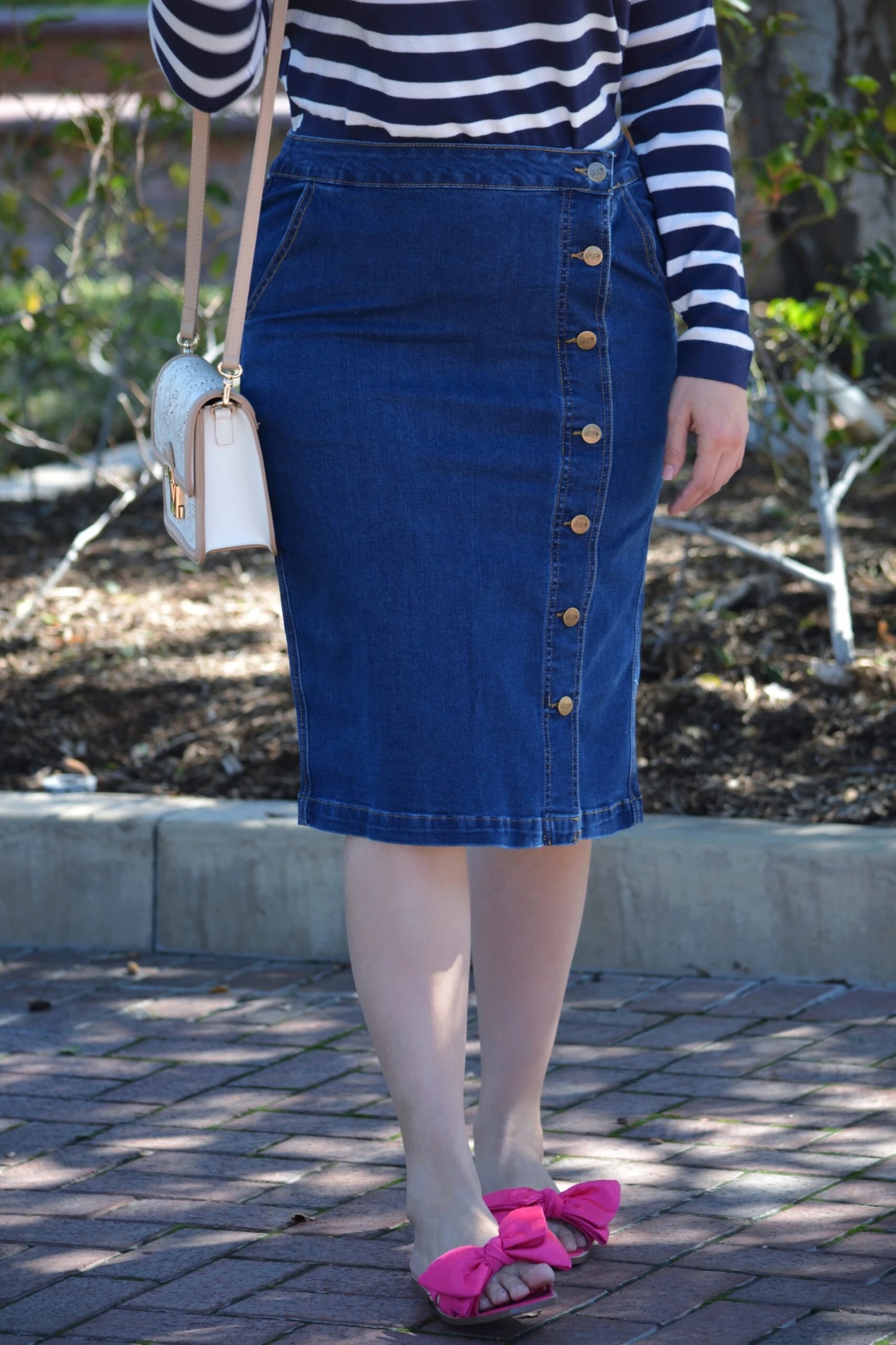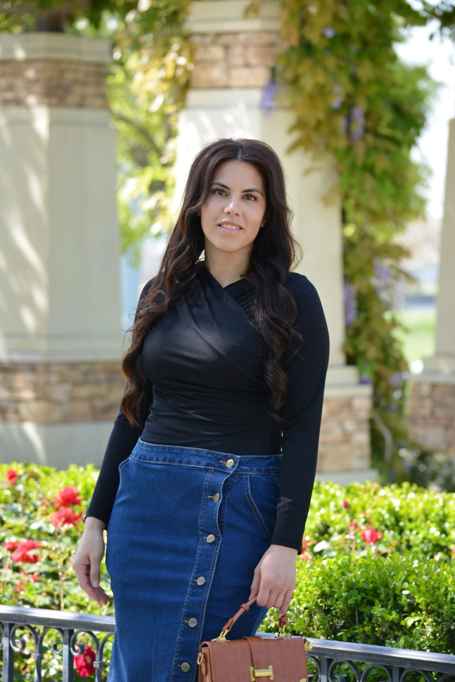 We are so excited to bring more exclusive quality pieces to our Pink Label. We love our new buttoned denim skirt! Chania features a indigio wash in a soft stretchy denim, back elastic waist, and typical 5 pocket design, minus the small coin pocket. And yes, it does not have a slit. Top three buttons open, all the others are sewn shut. This will be one of your most comfy denim skirts. Modeled in medium, 5’6”.