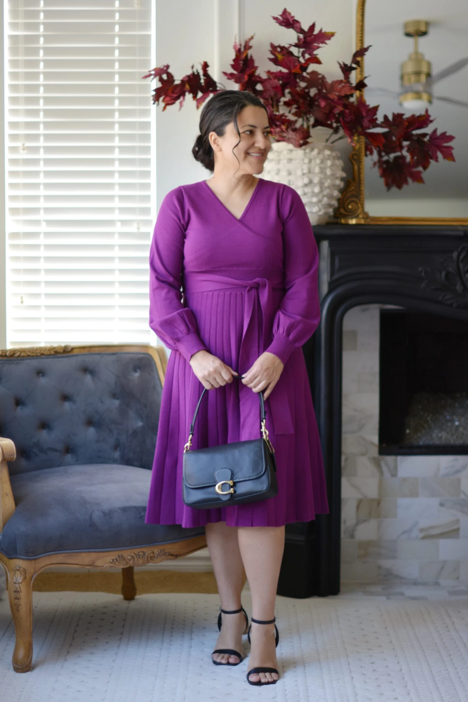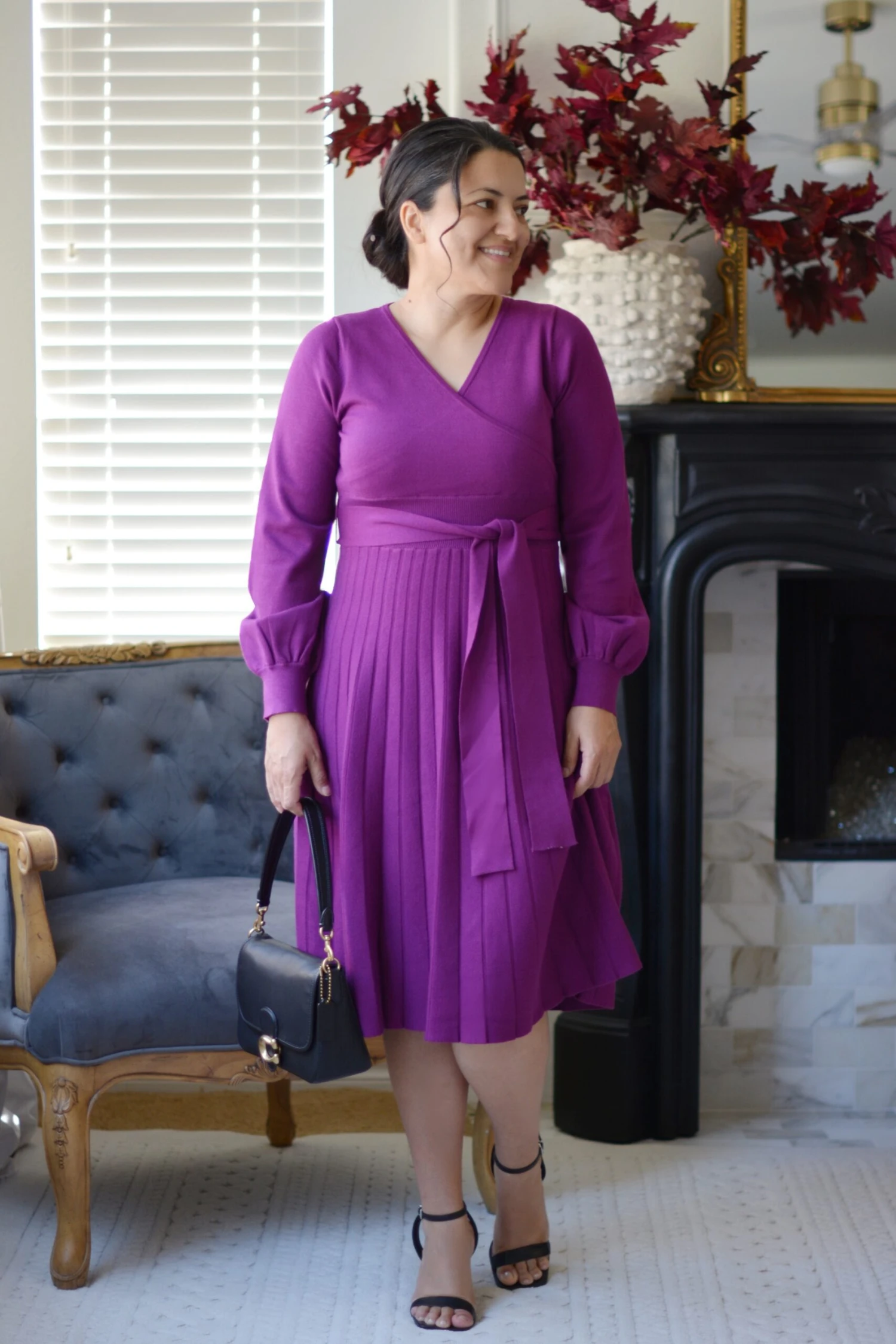 It’s back again and in a new color! Chantal will keep you cozy and modest during the chilly days to come! This dress is beautiful quality! Featuring a lovely knit fabric, ribbed pleated look skirt, balloon sleeves, and removable matching belt. Fabric has a nice stretch. Modeled in large, 5’5.5”.