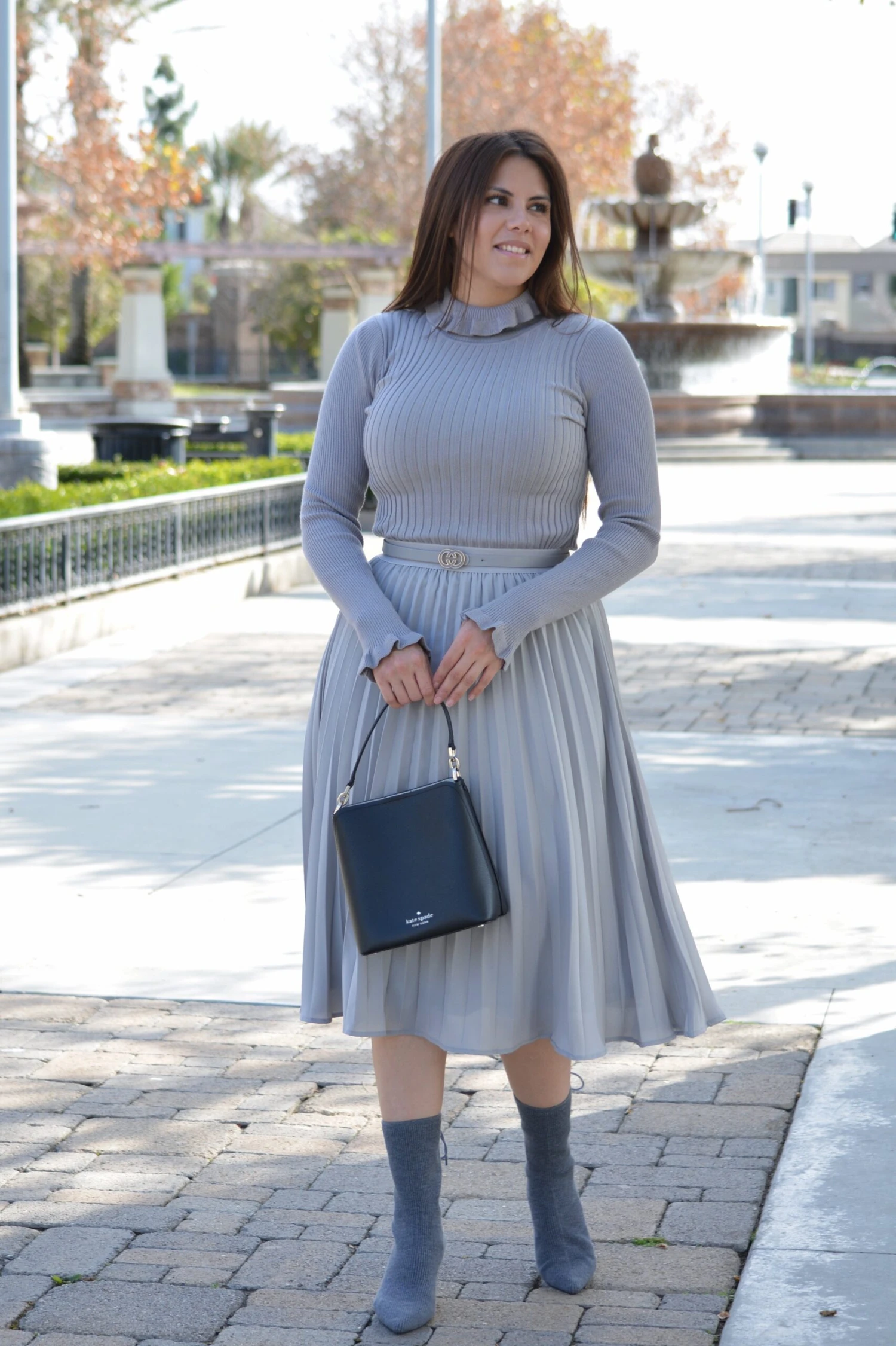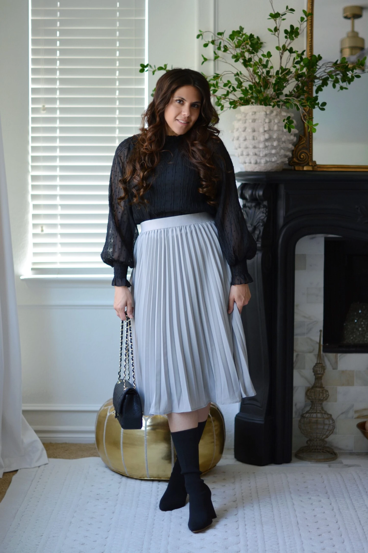 Stunning pleats and fully lined with an elastic waist. Our Cheri pleated skirt is both feminine and modest. Elastic, and has a nice stretch, modeled in medium 5’6″. Paired with our Ambrie top.