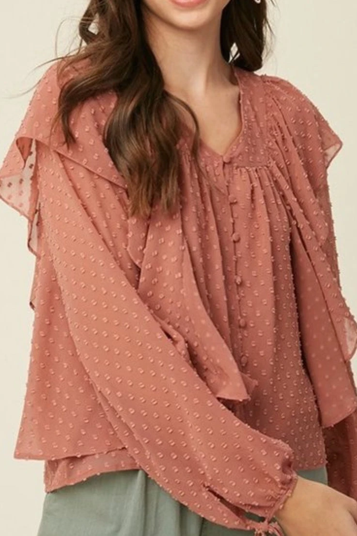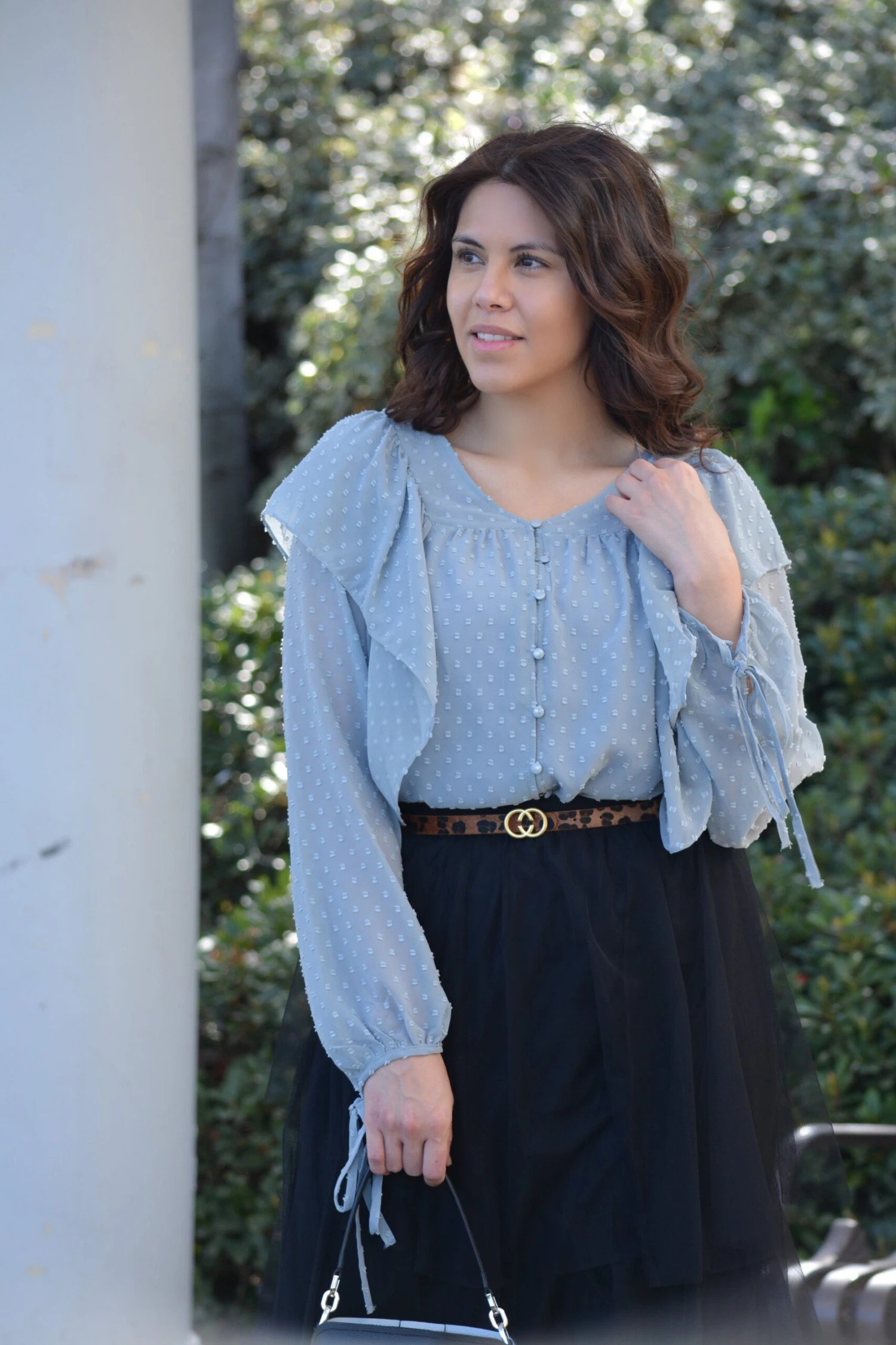 We just love our new Claire top! Featuring a darling ruffle throughout, buttoned front, and lining in a beautiful swissdot fabric. Modeled in Medium and paired with our Katheryn black skirt. 5’6″. Last photo shows length.