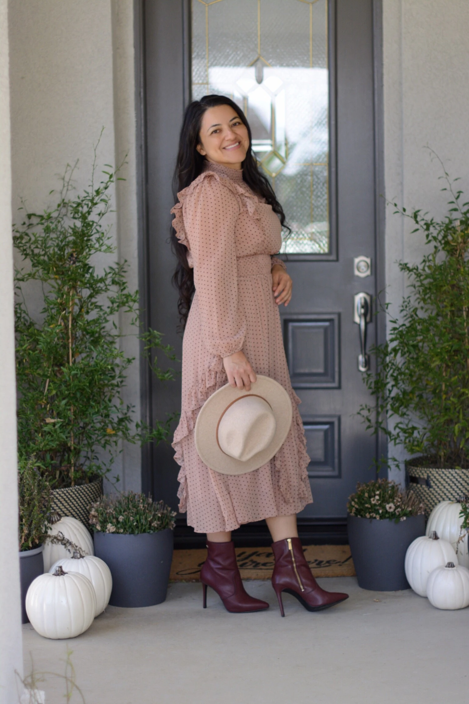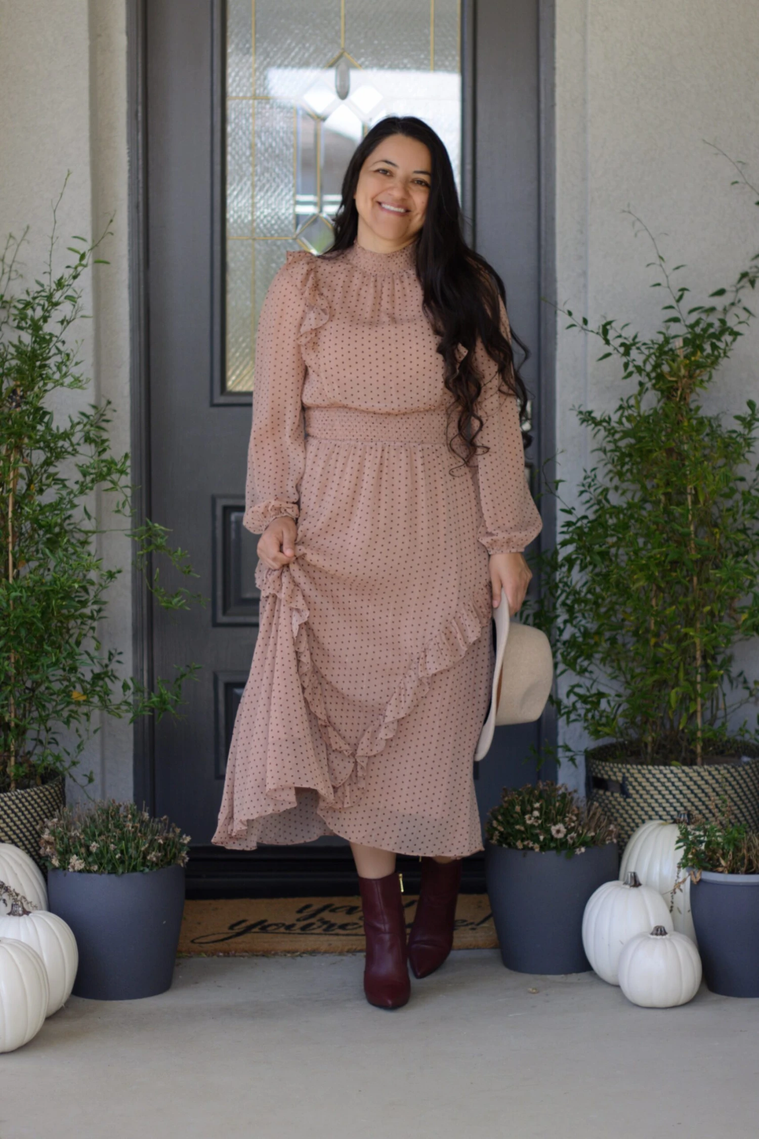 Francine features a mock neck, ruffled details, and lining. Fabric has small burgundy dots. Perfect for the holidays! Modeled in medium 5’5.5″.