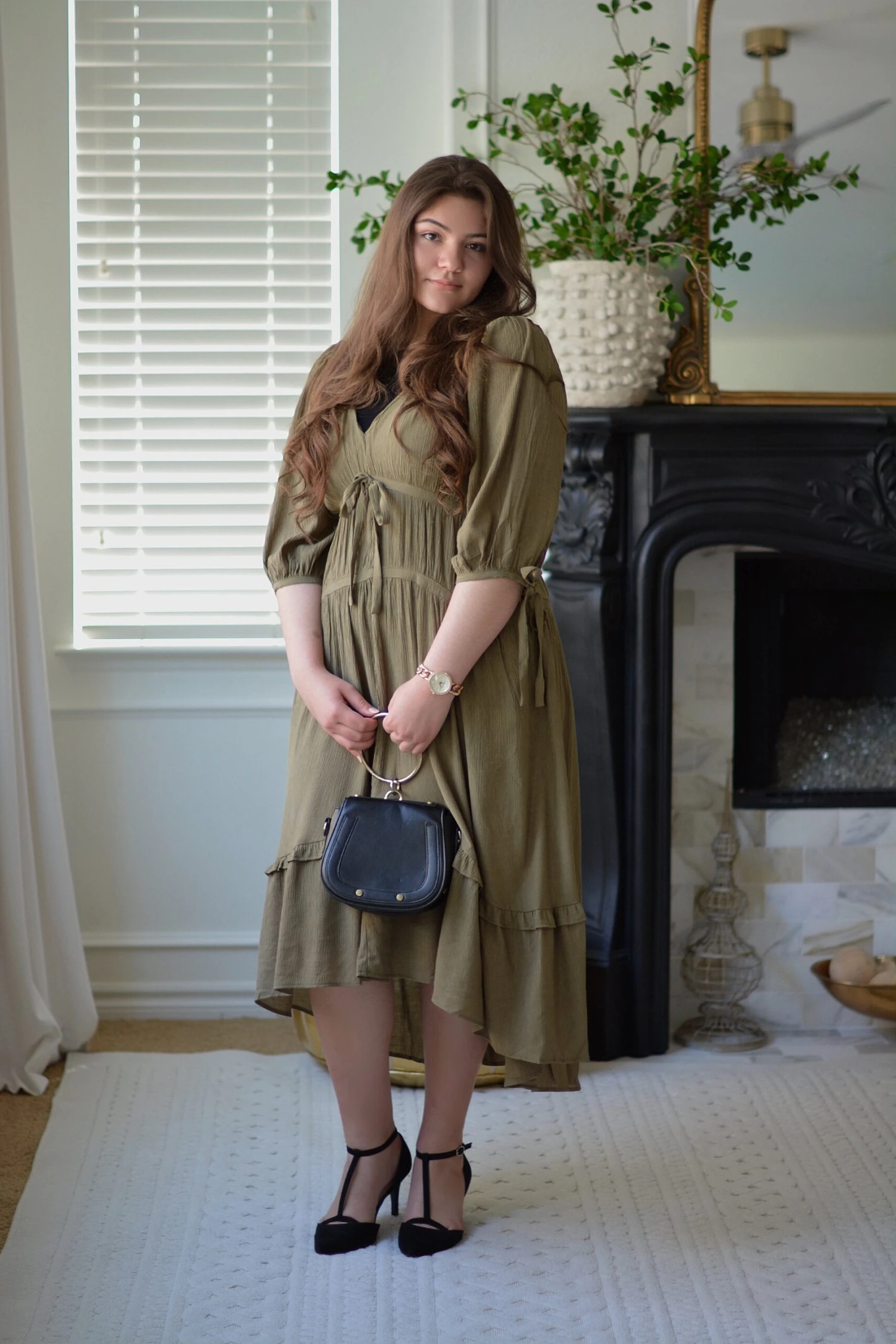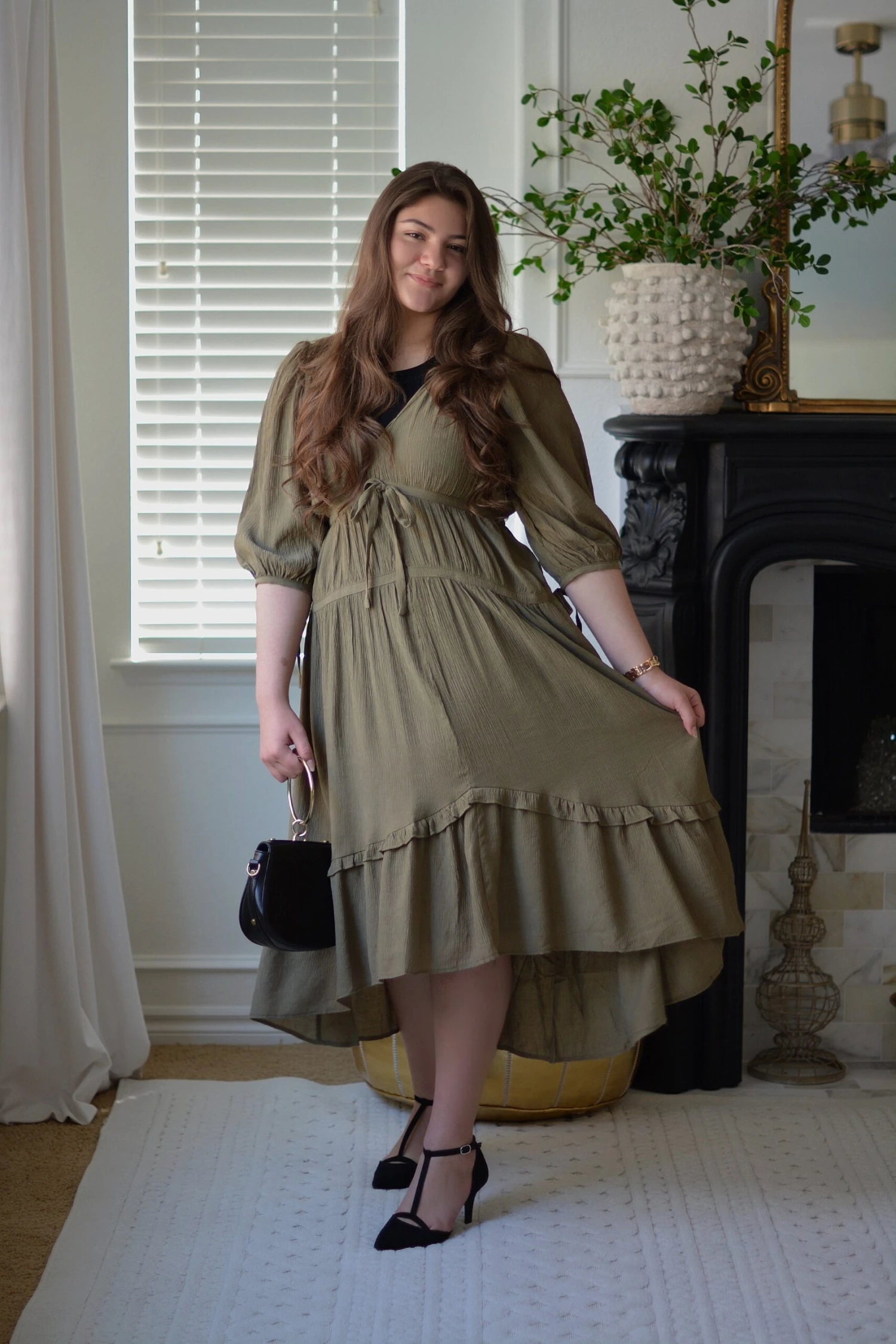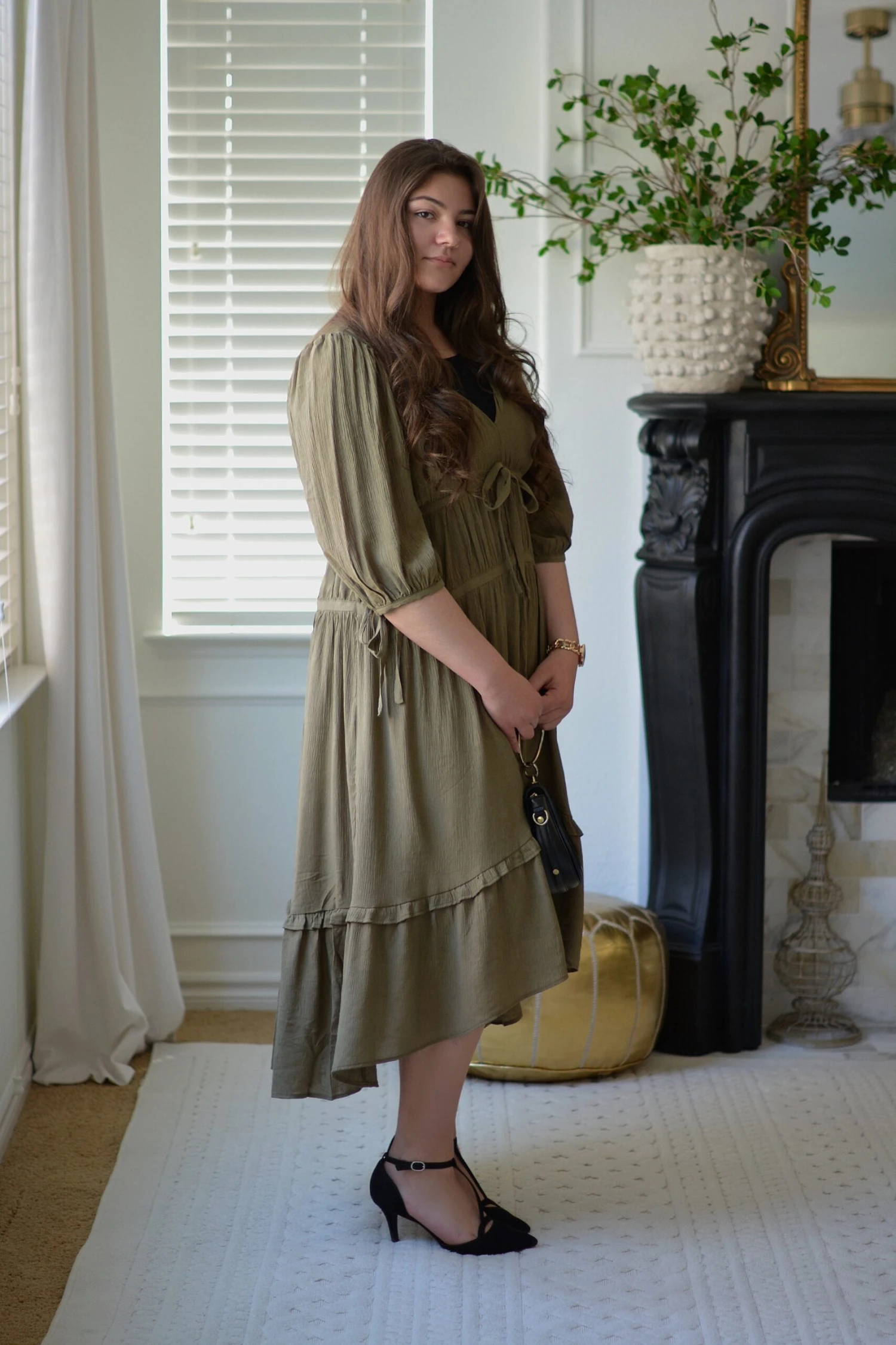 Hollie features a beautiful textured crepe fabric, drawstring empire waist, elastic back waist, ruffled hem, and lining. Fabric has some stretch. Modeled in medium 5’6”.