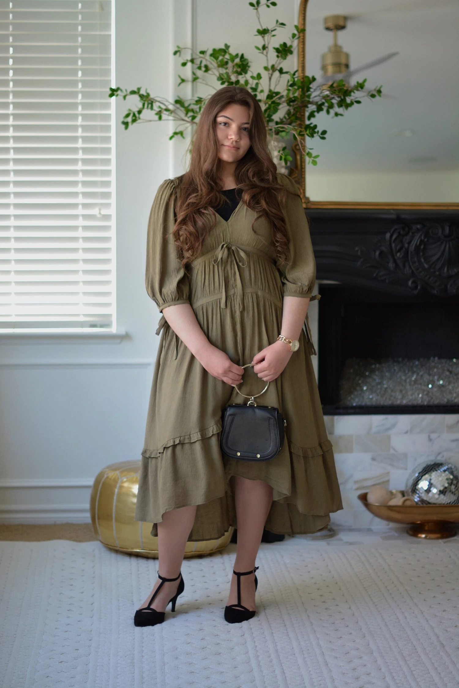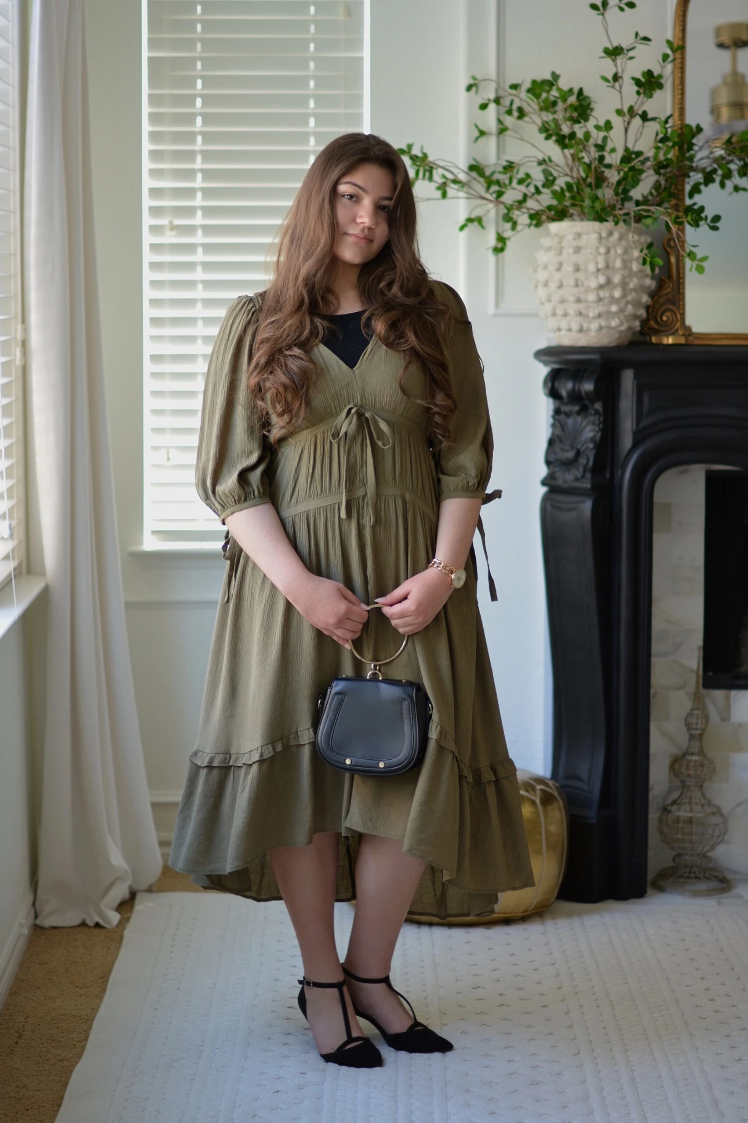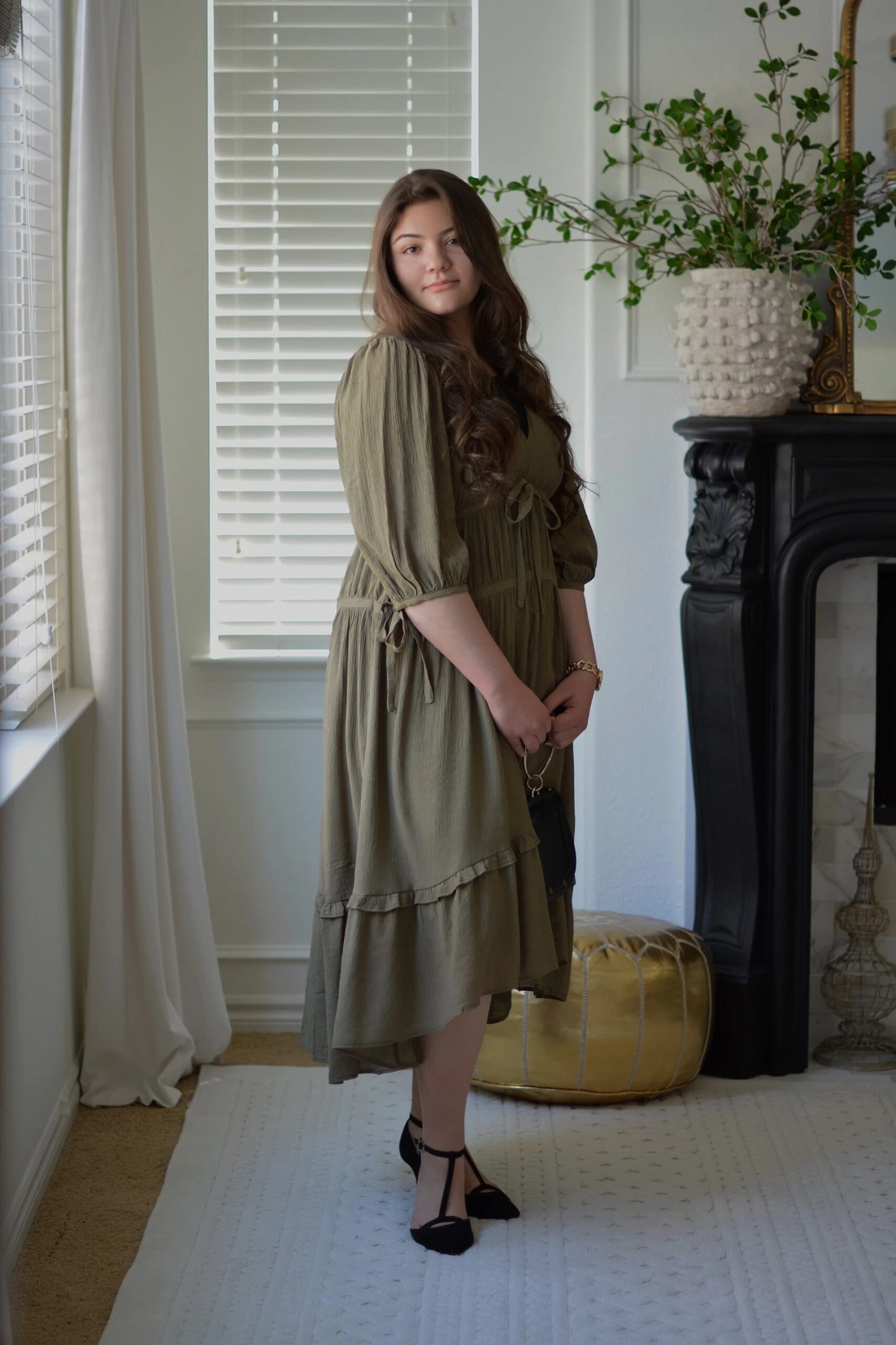 Hollie features a beautiful textured crepe fabric, drawstring empire waist, elastic back waist, ruffled hem, and lining. Fabric has some stretch. Modeled in medium 5’6”.