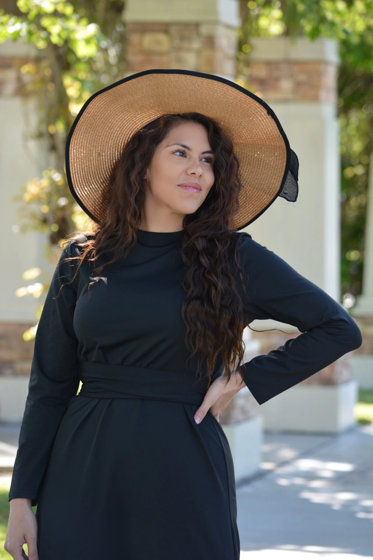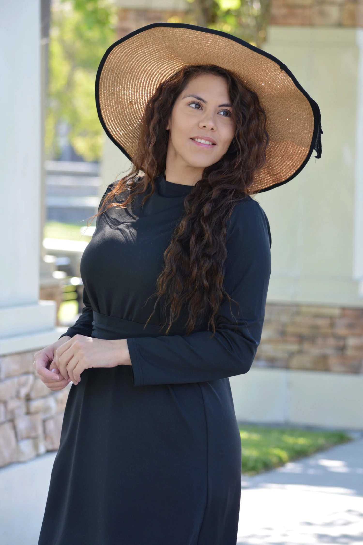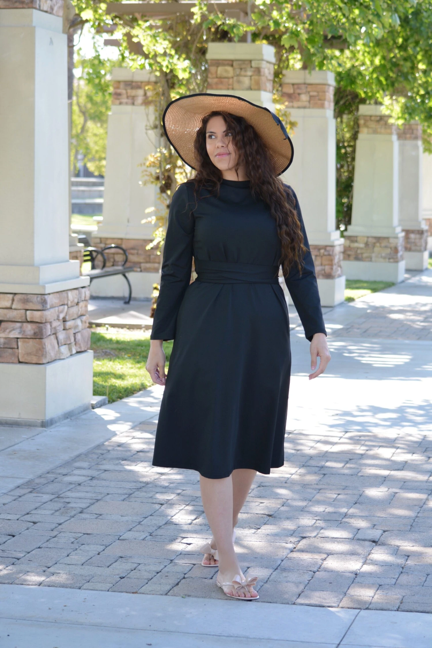This dress has attached belt that you can tie any way you desire. We share it crisscrossed in the back on the black dress and tied on the side on the teal dress.
