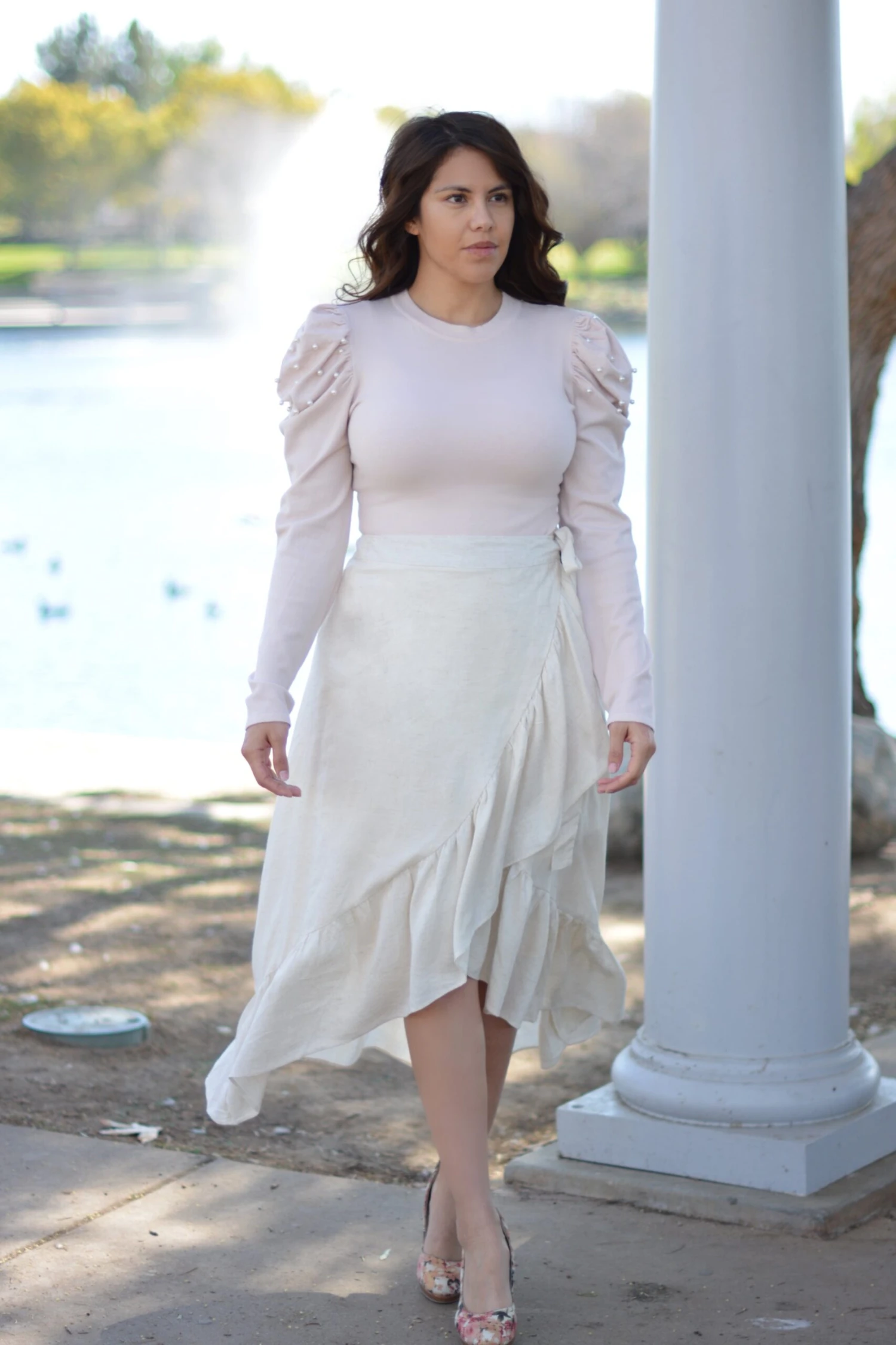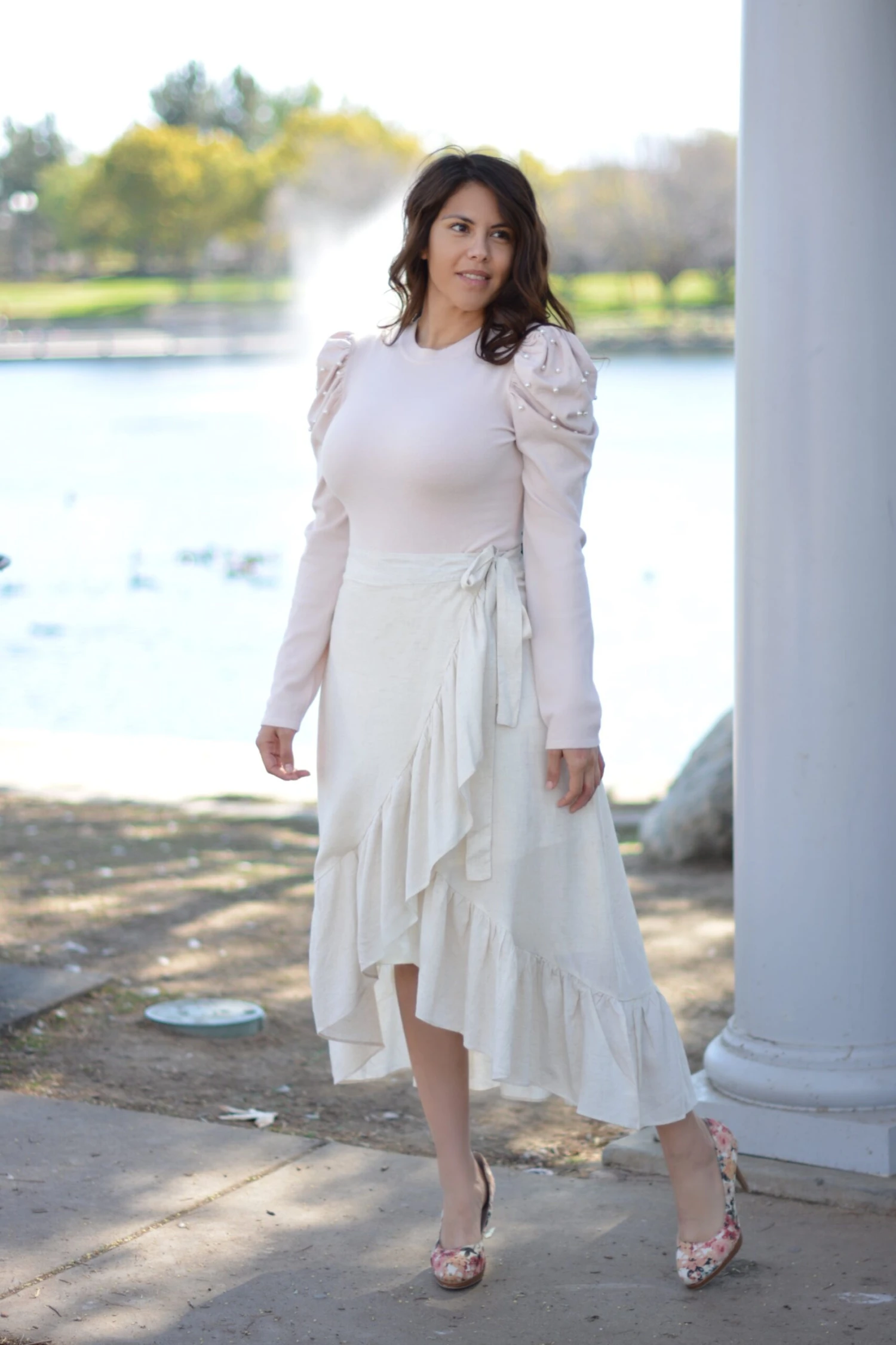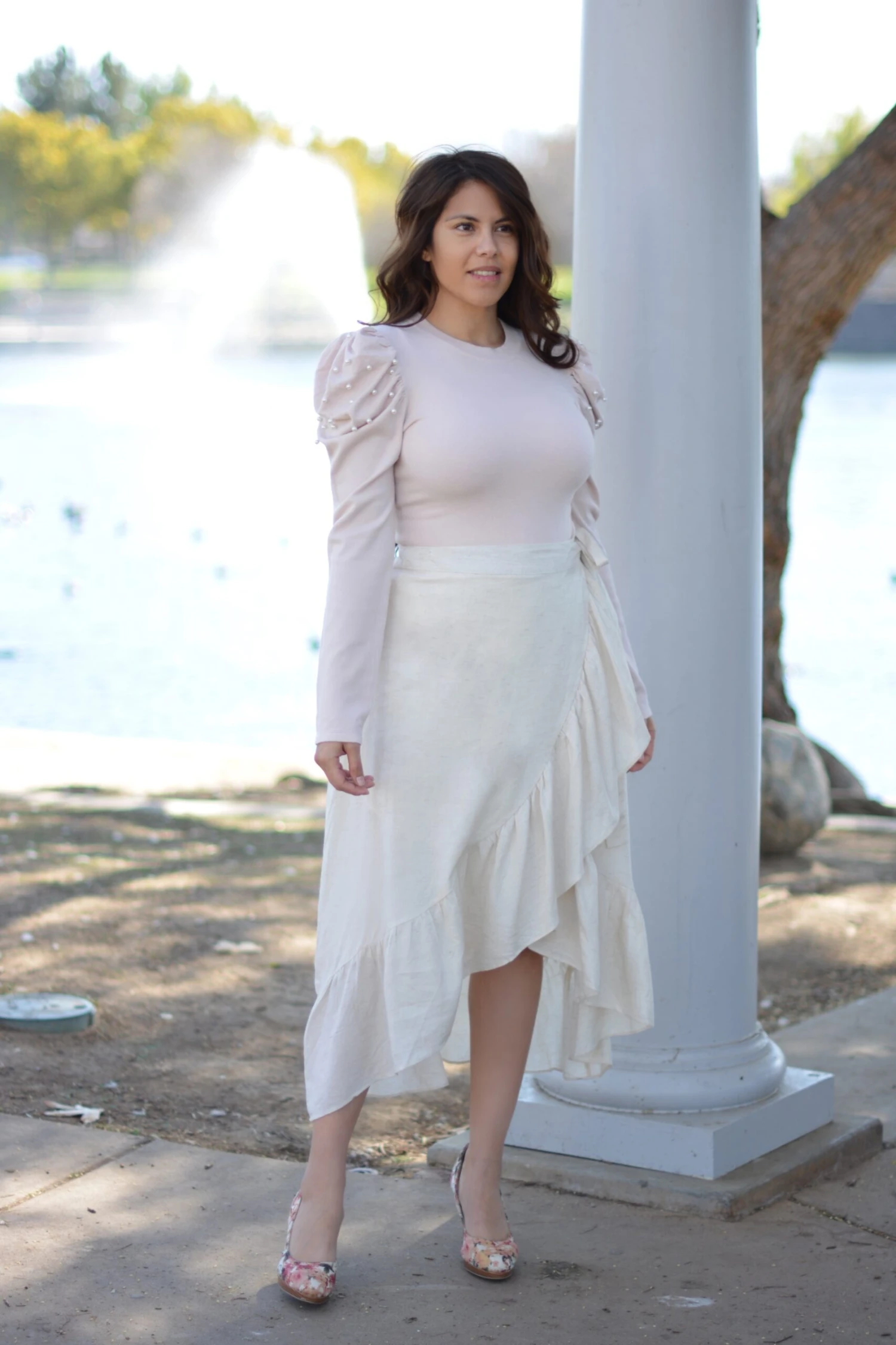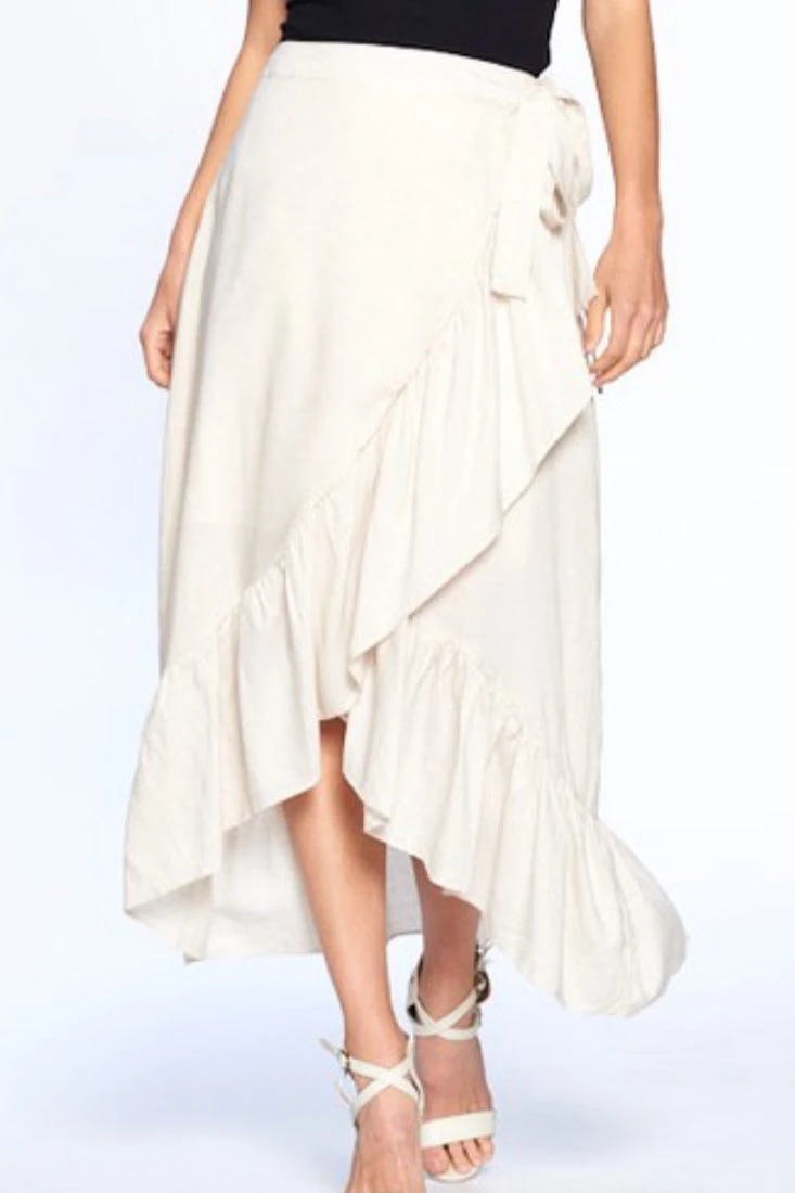 Beautiful wrap skirt in a neutral beige, yes please! Jada is perfection! Featuring a true wrap style with a ruffled hem, the waist is fully customizable. Skirt is lined and fabric does not have stretch and fit is true to size. Modeled in medium 5’6″. Paired with our blush Prim and Pearls top.