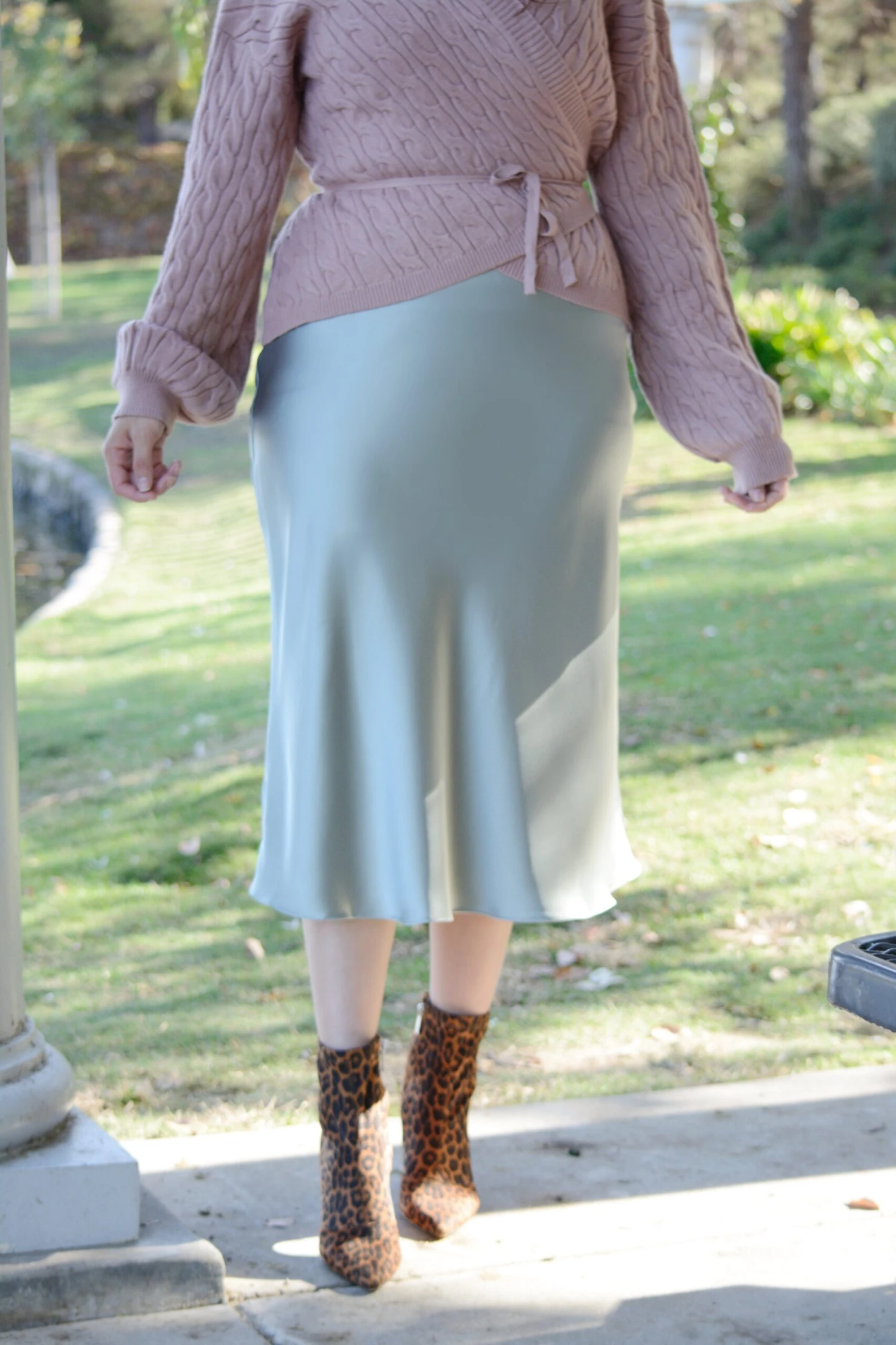 Ok this one is a winner in our book! Laney features an elastic waist in a satin like stretch fabric. We love pairing these with over sized sweaters. Modeled in large 5’5.5″. Paired with our new Holly cardigan.