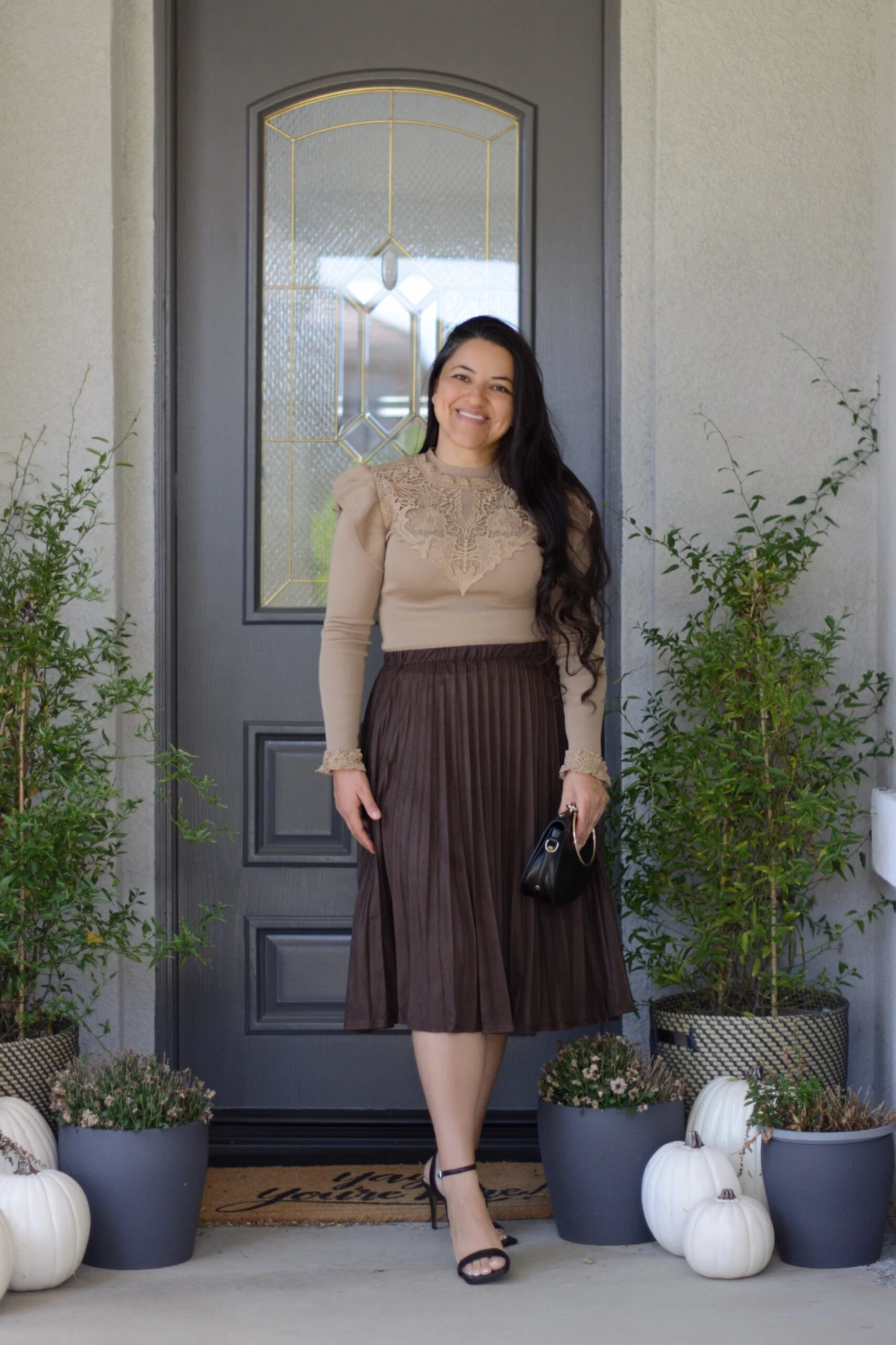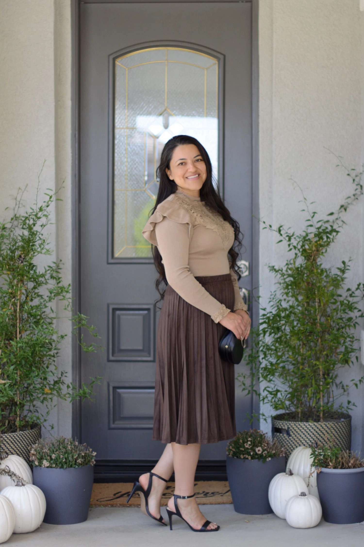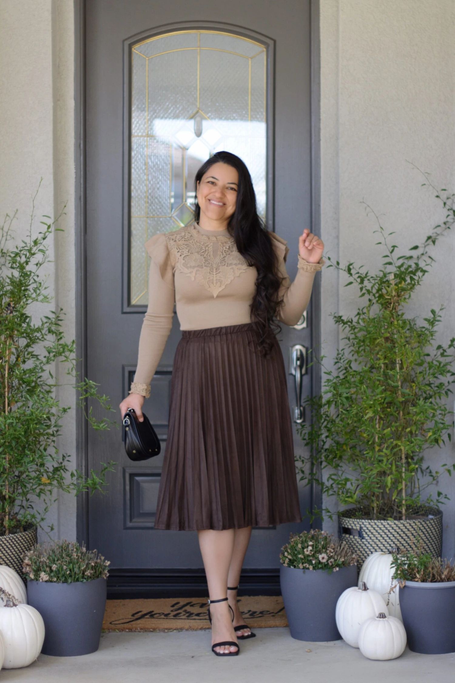 Lennon features a brown faux suede, in a knife pleat and elastic waistband. Dress it up or wear it casual! Modeled in large, and paired with our new Ashlyn knit top.