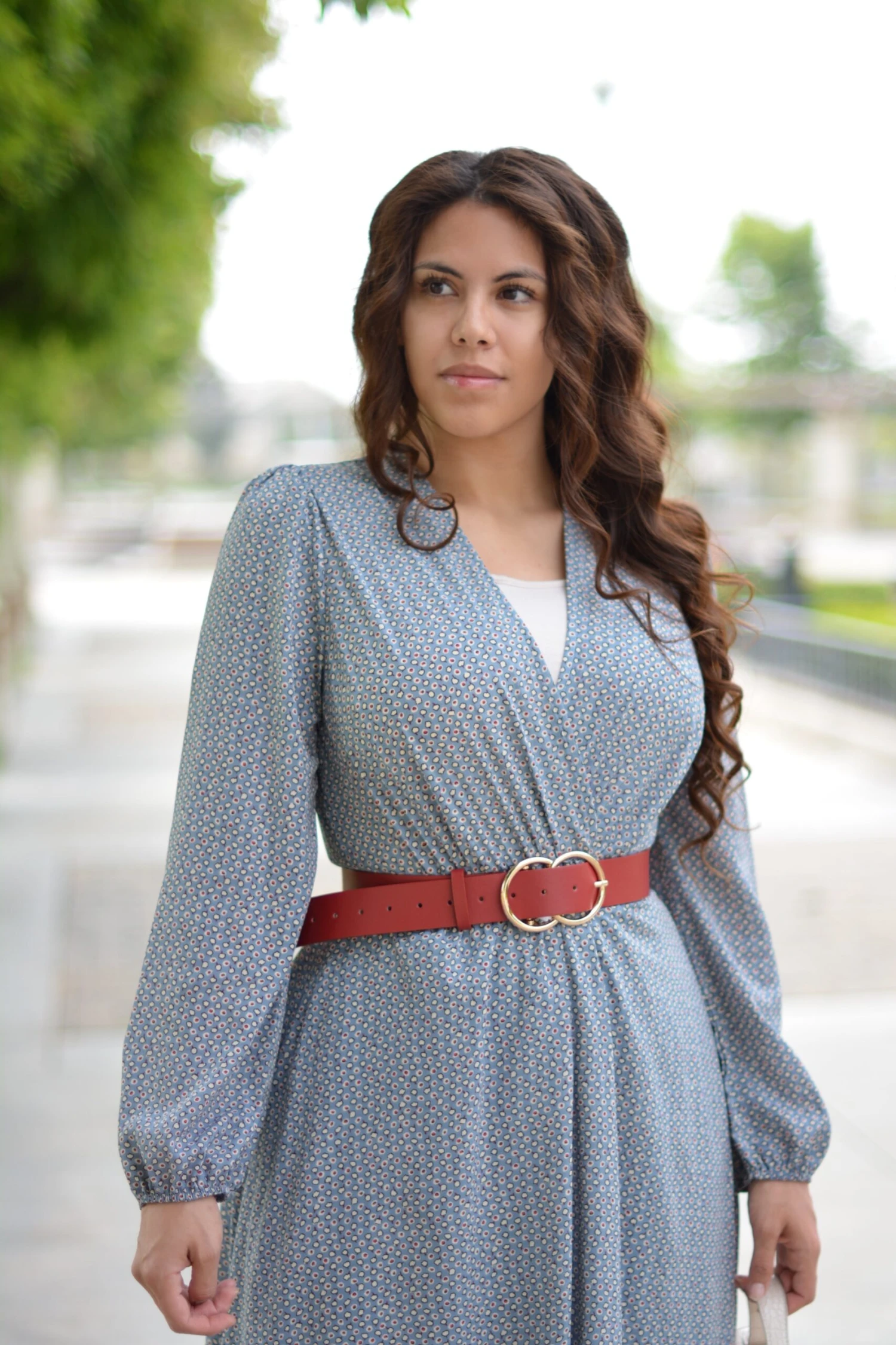 Add a little retro to your closet with our adorable Libby dress. Libby features a light blue woven fabric with an empire waist, long sleeve, side zipper, and skirt lining. This dress does not have stretch in fabric or at waist so please use measurements provided. Fit is small, size up, modeled in large 5’6″. Paired here with our Eva red belt.
