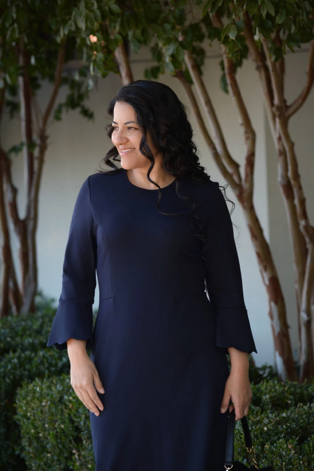 Meet Lille! One of our newest designs for 2019 is this gorgeous little creation. Our Lille dress is another perfect dress for the office, church, or gathering. The classic, simple design features a scalloped hem and sleeves. The scallops are hemmed and have a lining to ensure they will not fray. Made from a high quality stretchy ponte fabric, the Lille dress is flattering, comfortable and classic. Dress does not hug hips. Modeled in large 5’5.5″.