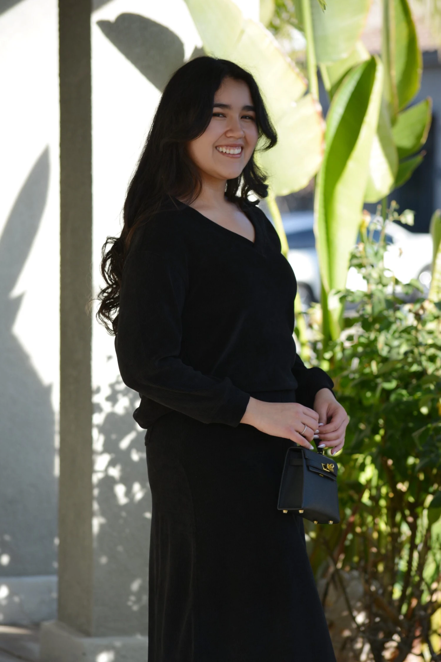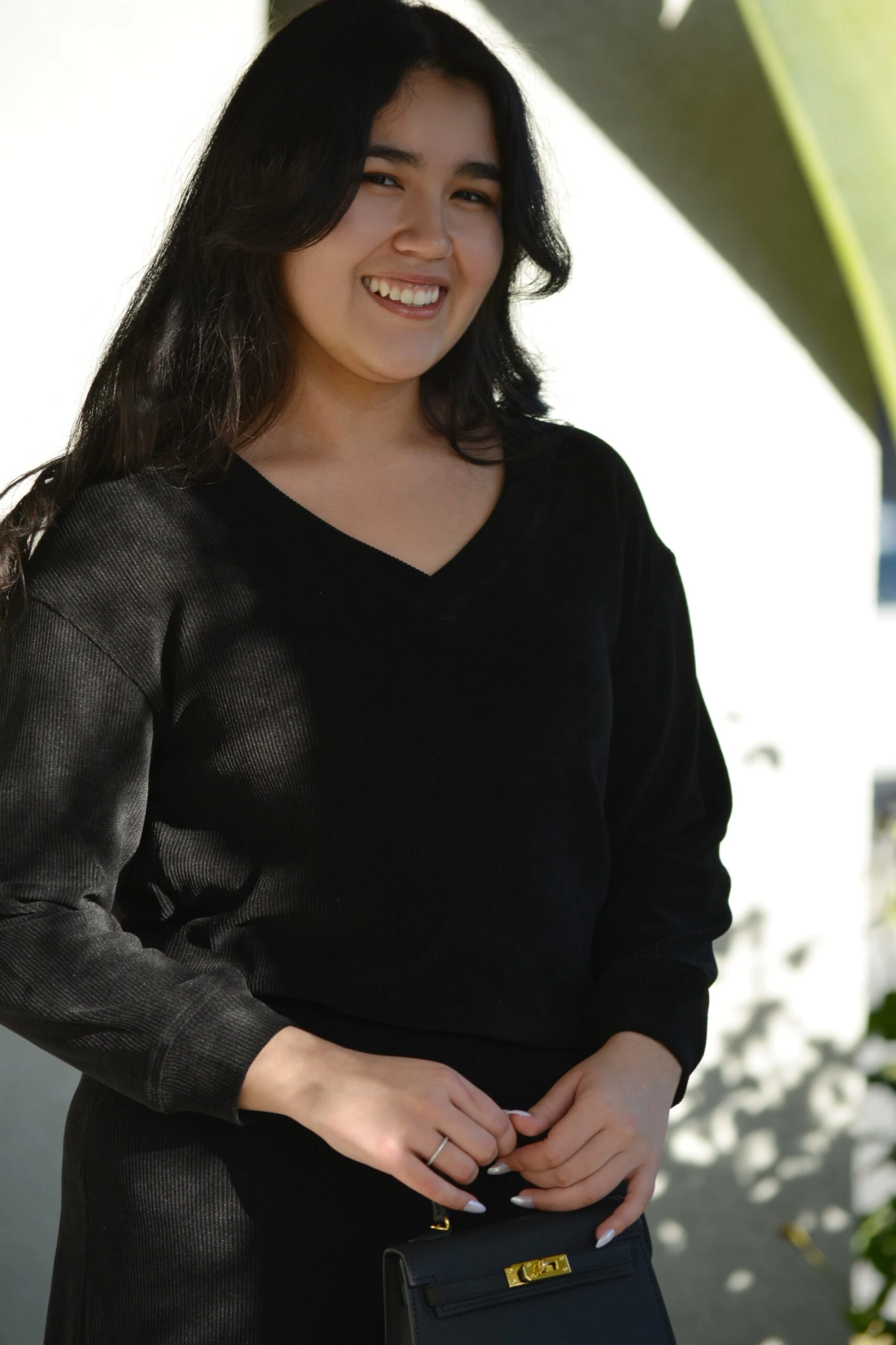 Say hello to your new favorite set! This is exactly like our warm blue just in black. I love every detail about this, from the classic style to the warm corduroy fabric.