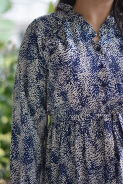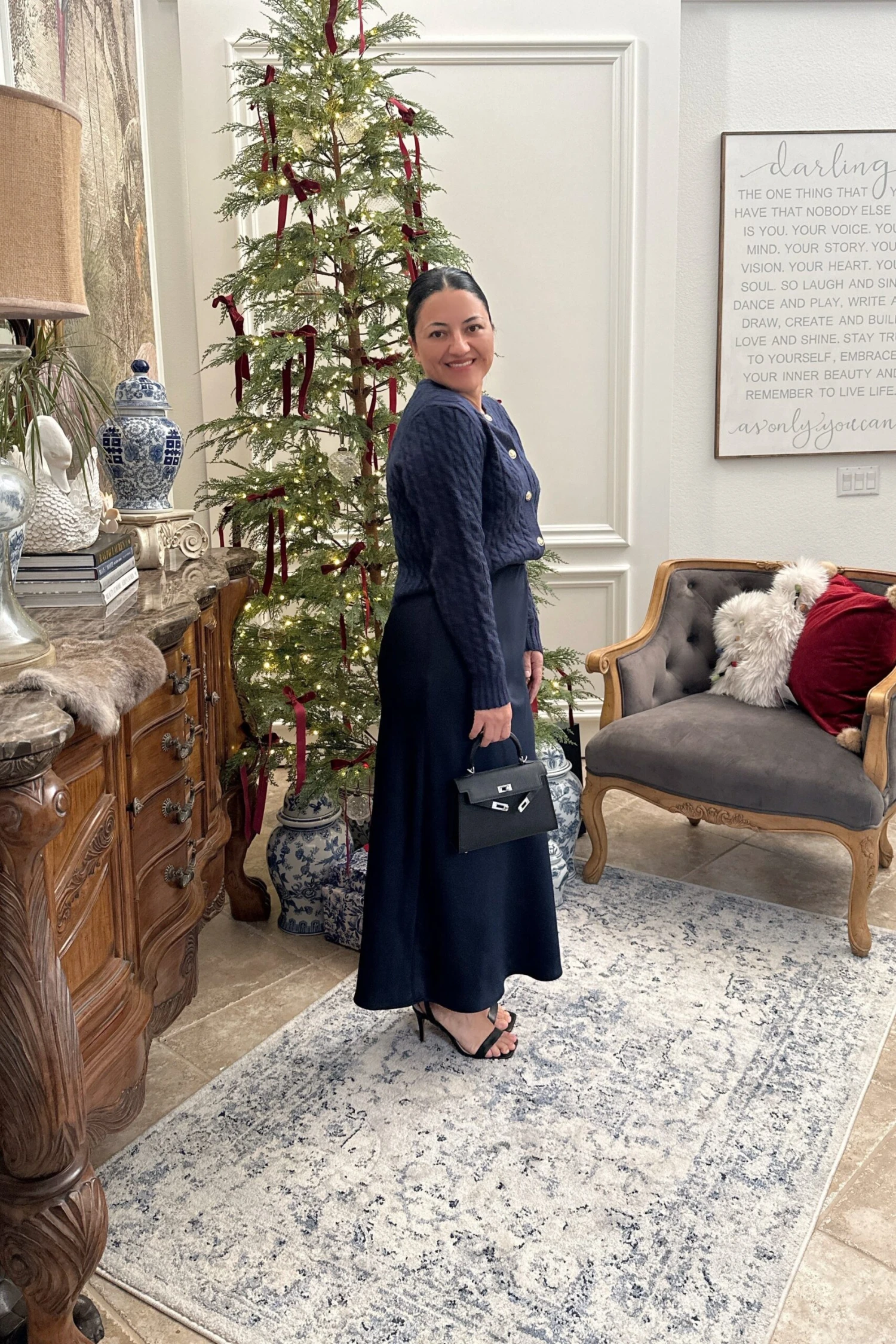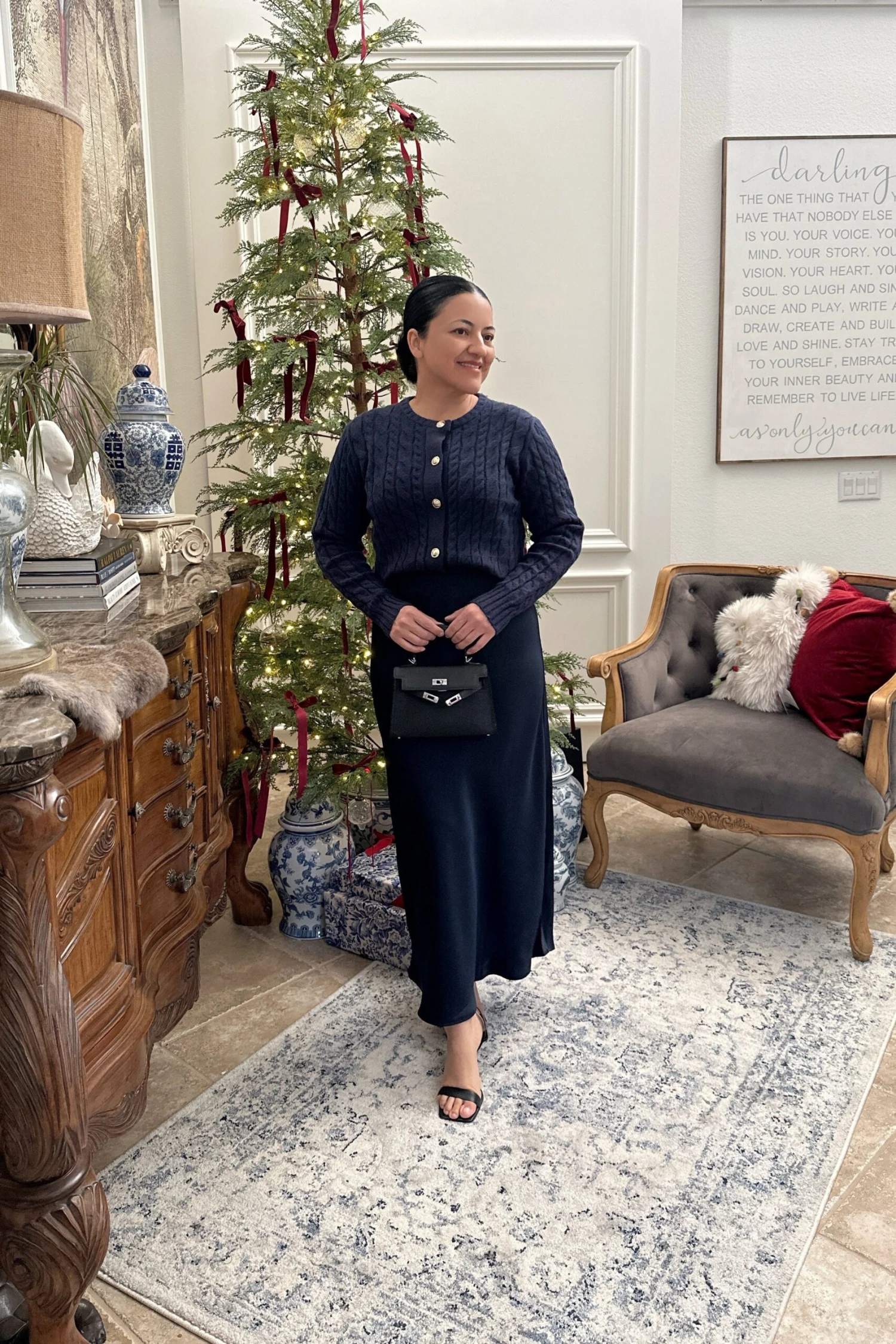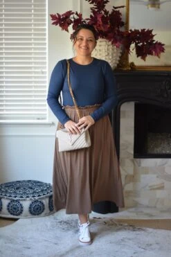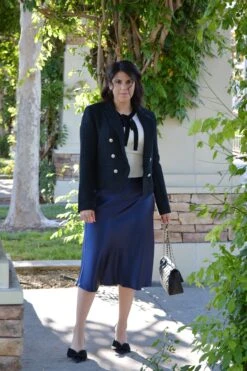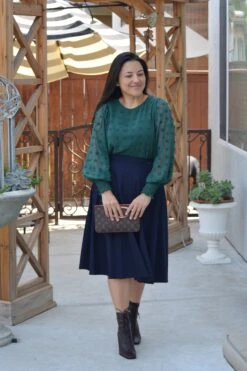 Modeled in medium 5’5.5″ paired with our Rebeka navy maxi skirt