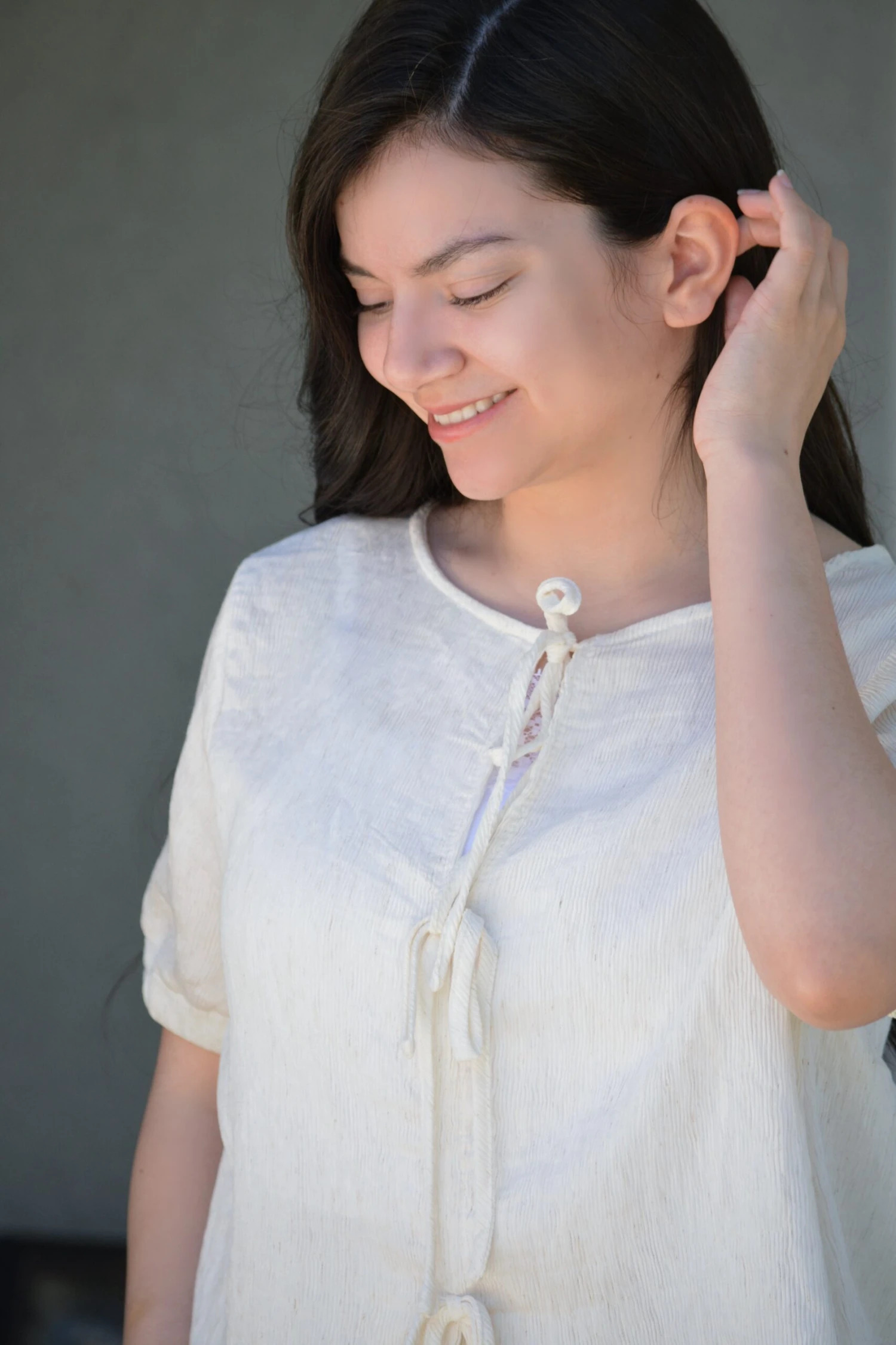 Modeled in large 5’5.5” and small 4’10” (worn with bows to the front)
