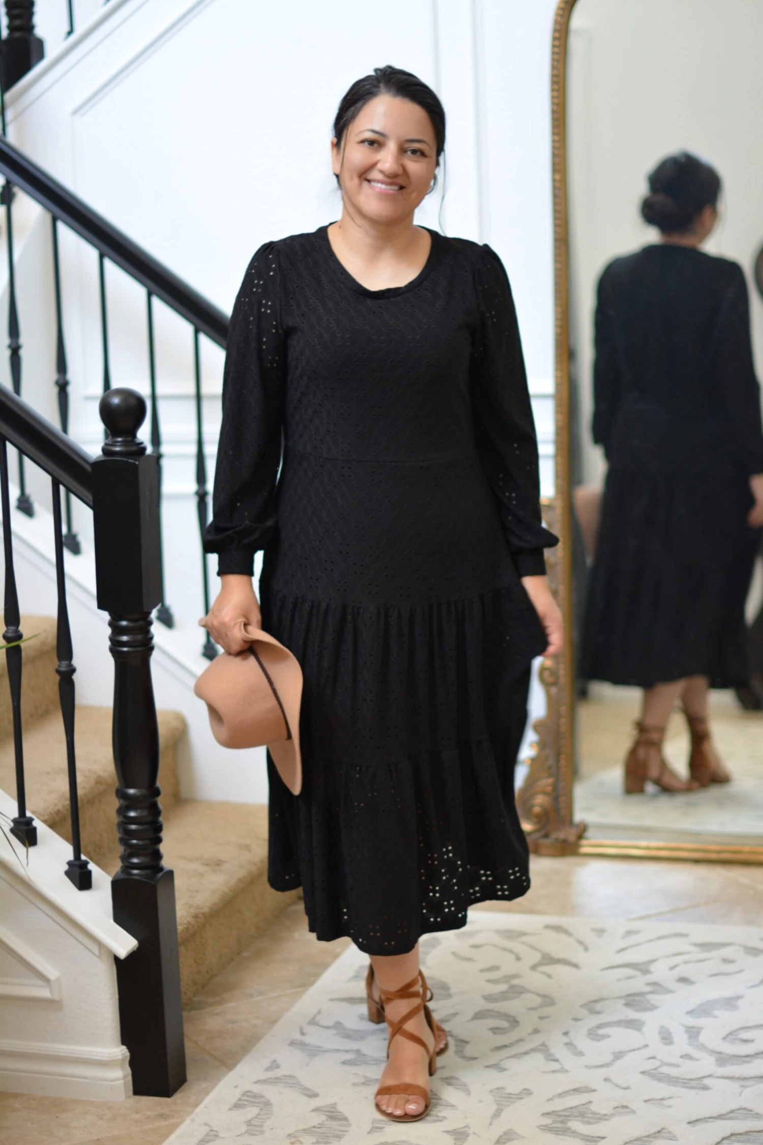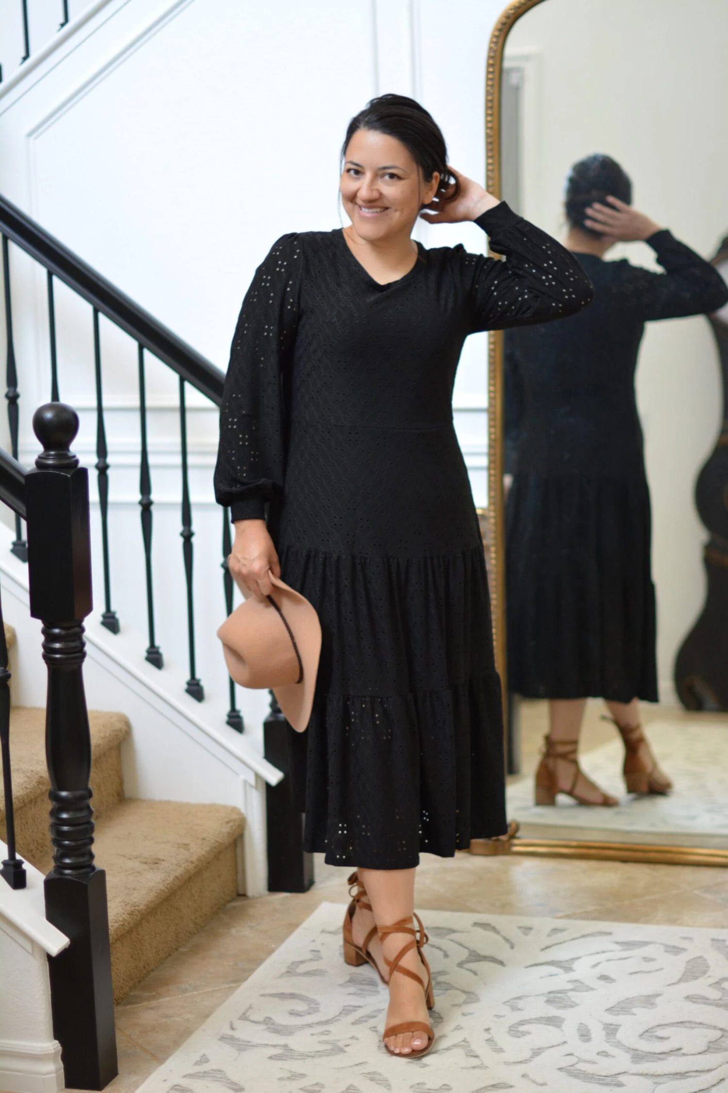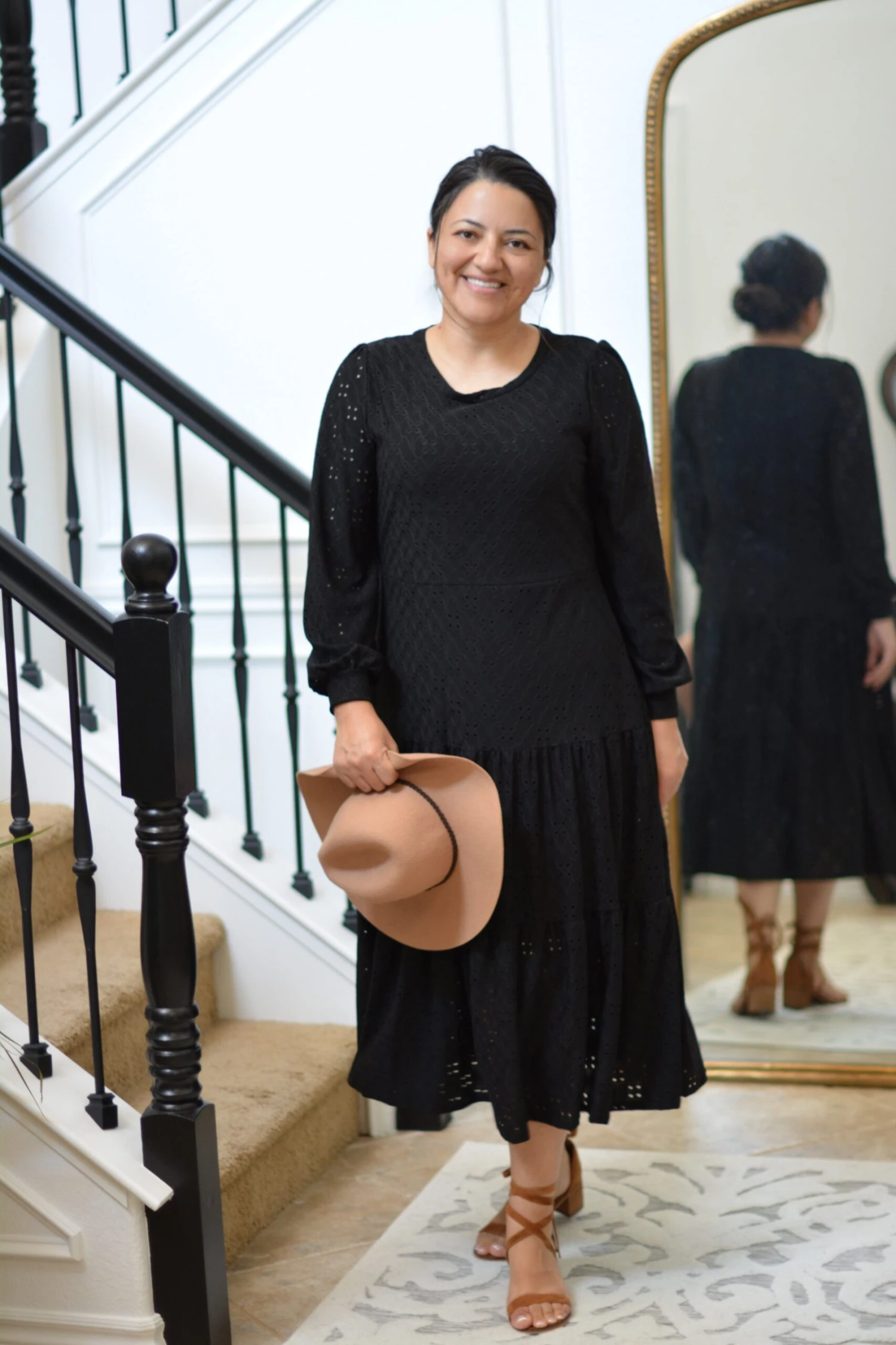 Octavia features a gorgeous lined  black in eyelet fabric, tiered style, and cuff sleeve. Fabric has a nice stretch and fit is small size up. Modeledin large 5’6″.Â