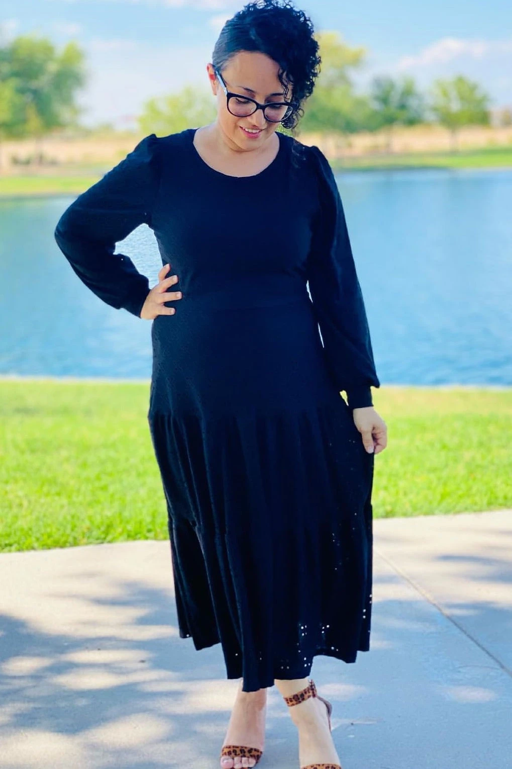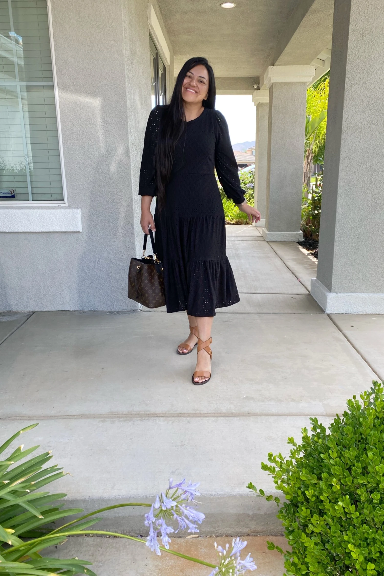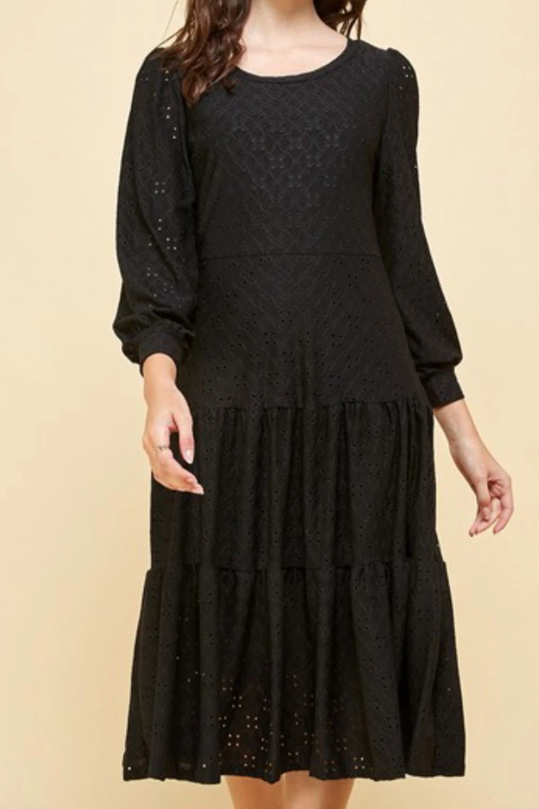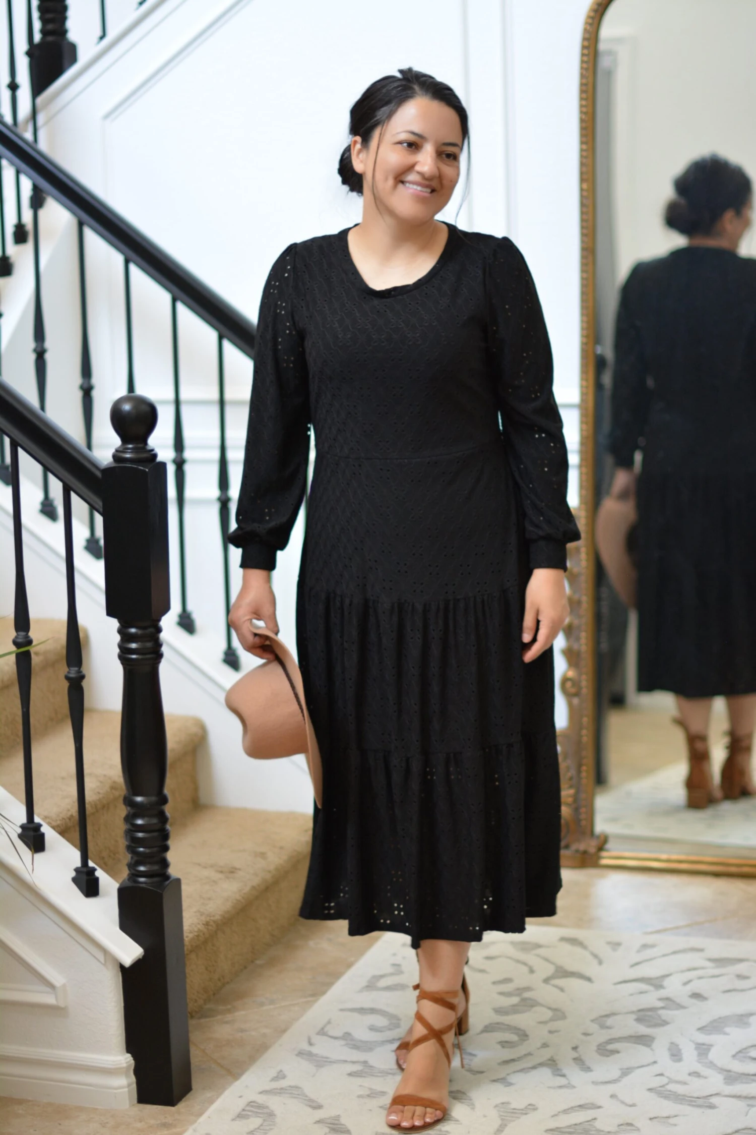 Octavia features a gorgeous lined  black in eyelet fabric, tiered style, and cuff sleeve. Fabric has a nice stretch and fit is small size up. Modeledin large 5’6″.Â