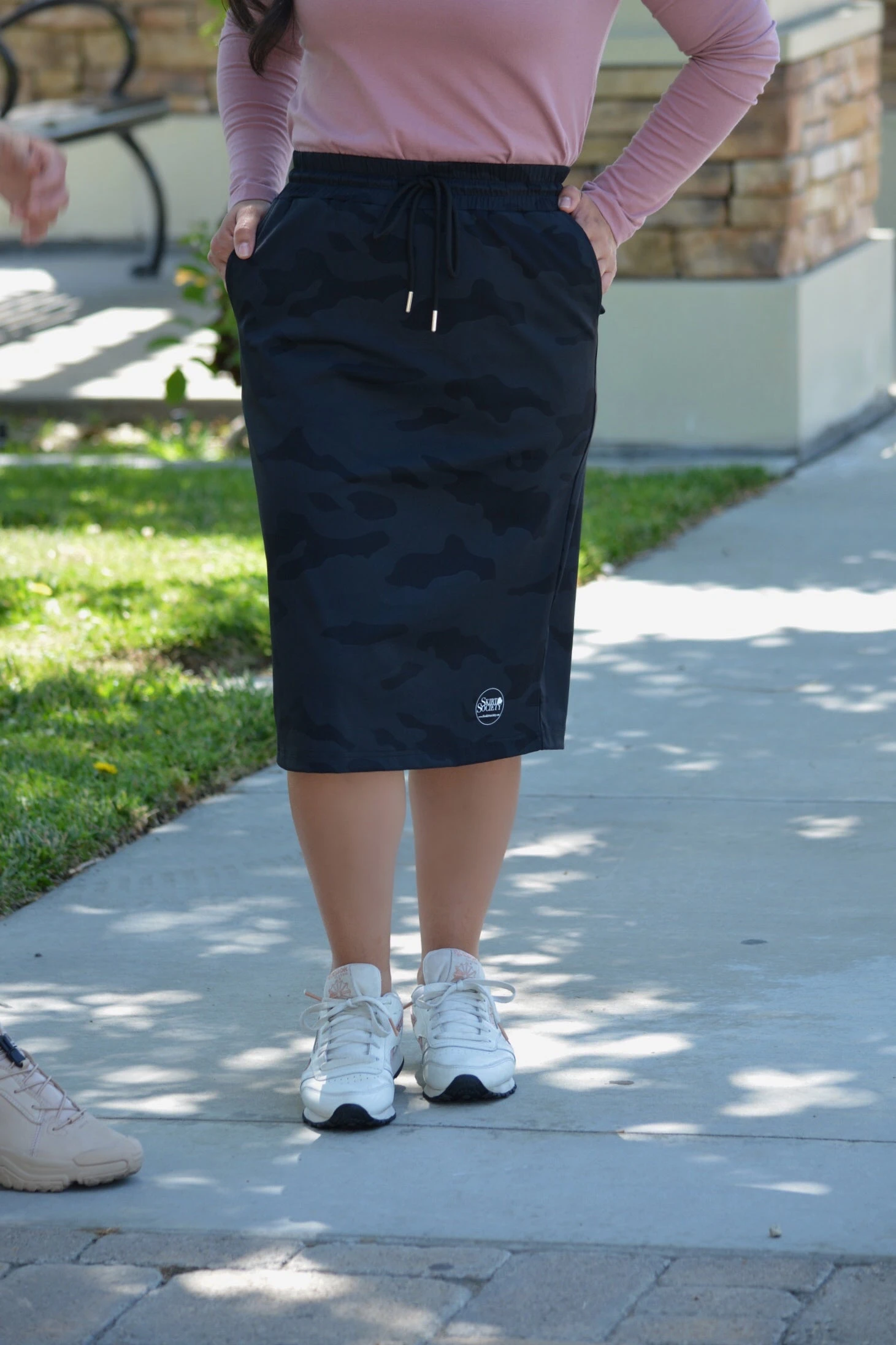 We are so excited about our new Pink Label Athletic Line! Our newest Palma skirts feature a camo fabric with hidden length attached leggings. Top quality and breathable stretch fabric, elastic plus drawstring waist with metal aglets, and POCKETS! Quick drying so perfect for swimming too! Modeled in medium 5’2”.