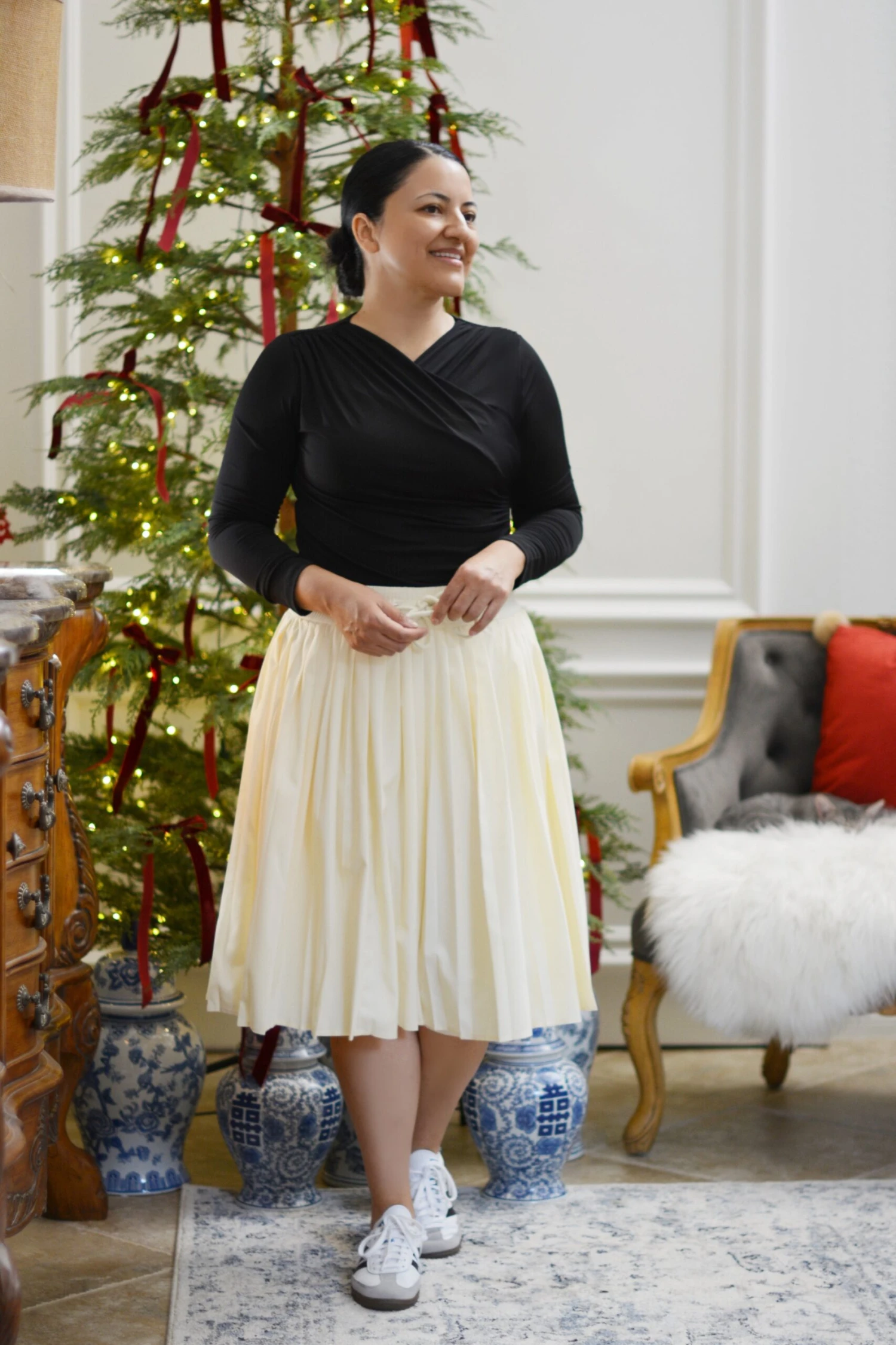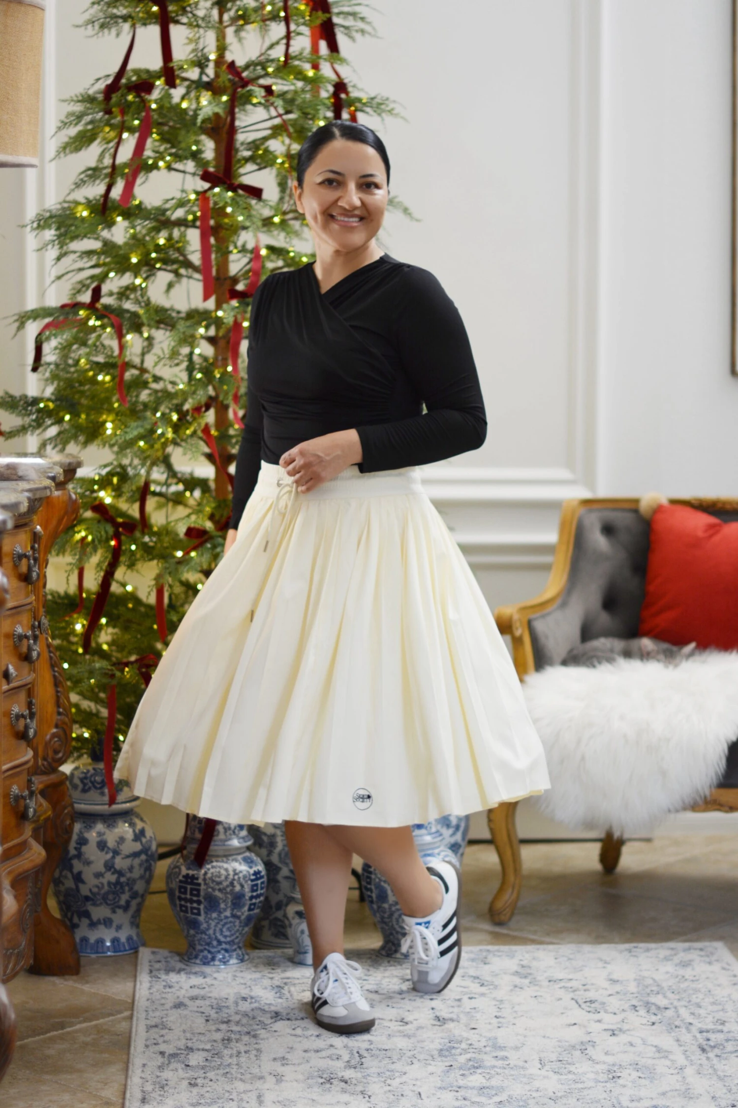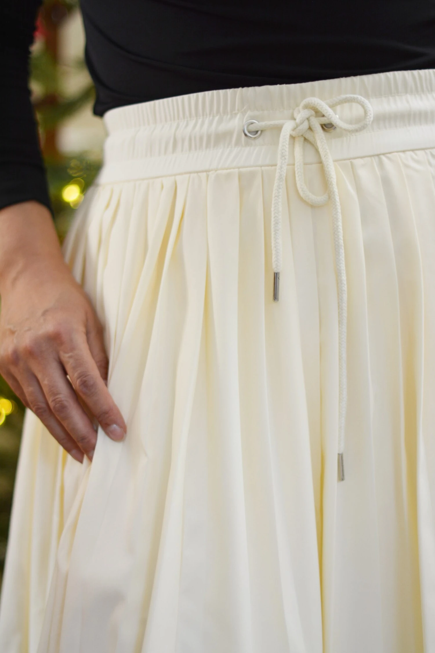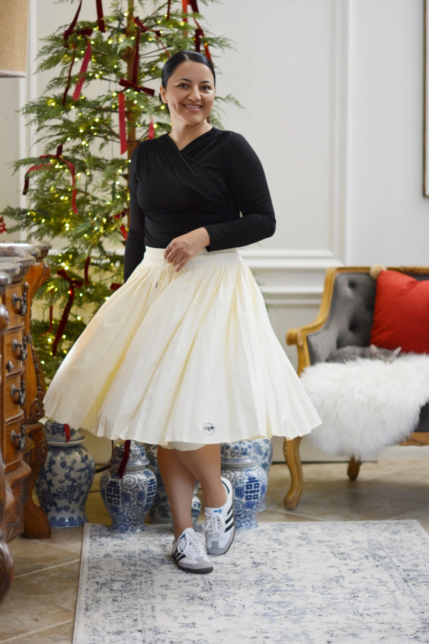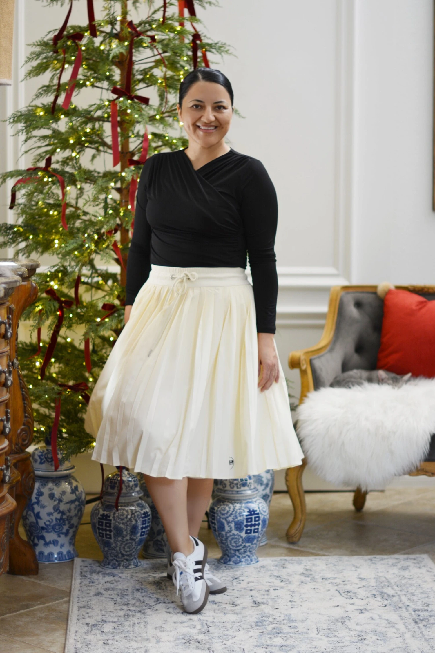 We did it! We created the most adorable full pleated athletic skirt around! After tirelessly looking for a modest pleated athletic skirt and not having any luck, we decided it was time to make one! Featuring midi length hidden leggings, elastic/drawstring waist, hidden pocket on leg and soft comfortable inner fabric. Legging fabric does have stretch.