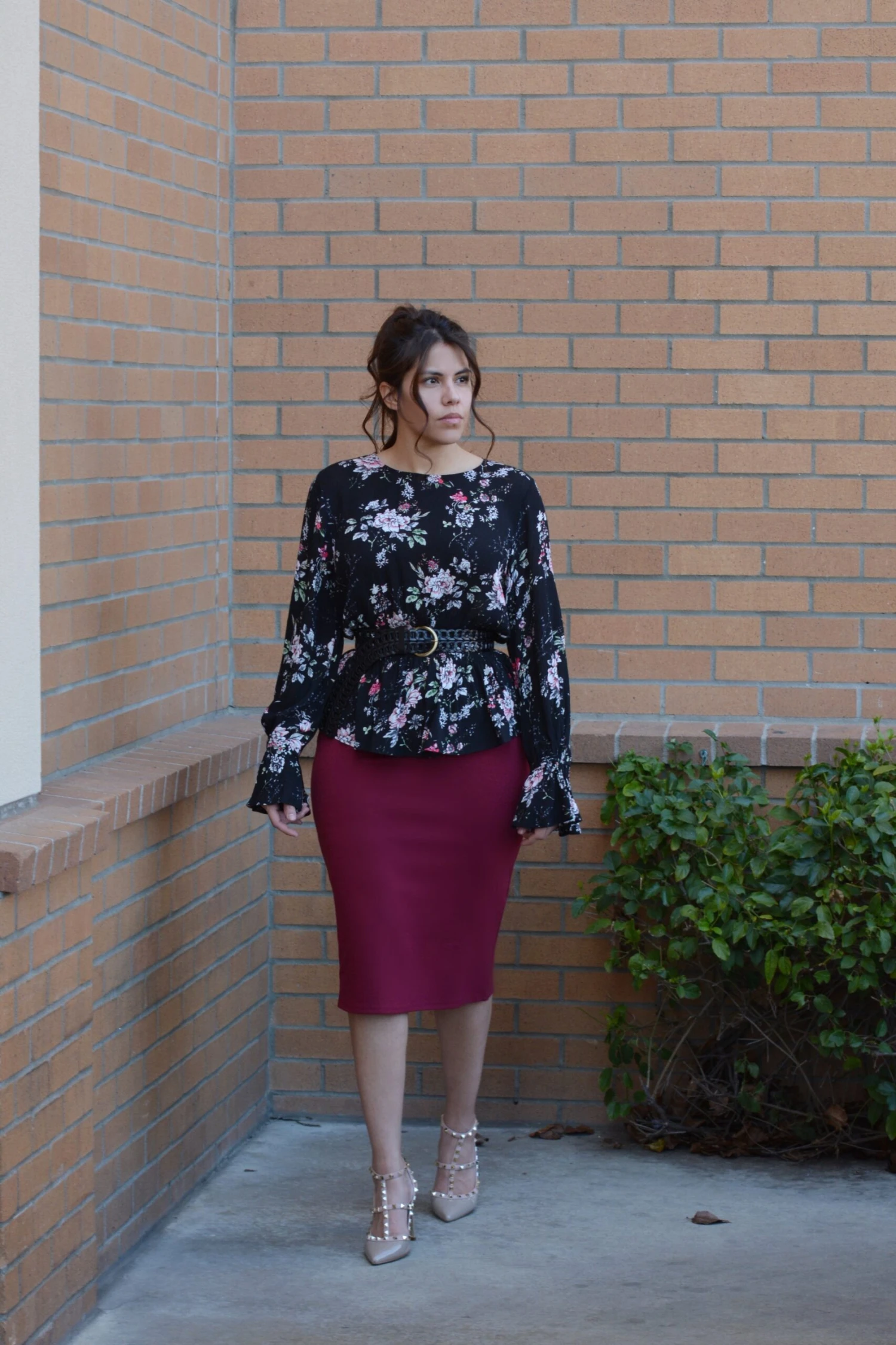 Our newest pencil skirt, Penelope is a thicker stretchy ponte fabric, with a thicker elastic waist. (no slit) Runs small, so definitely size up. Modeled in XLarge, 5’6″. Paired here with our Mariam top and Lisa belt.