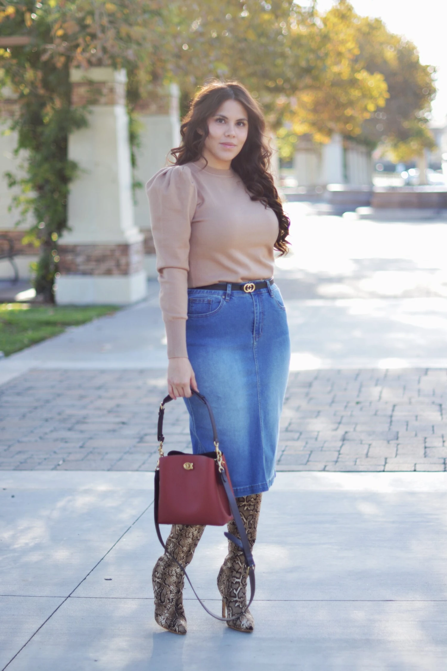 We are so excited to bring more exclusive pieces to our Pink Label. We love this classic style denim skirt! Pompeii features a light wash in a soft stretchy denim and typical 5 pocket design. And yes, it does not have a slit. This will be one of your most comfy denim skirts. Modeled in medium, 5’6”.