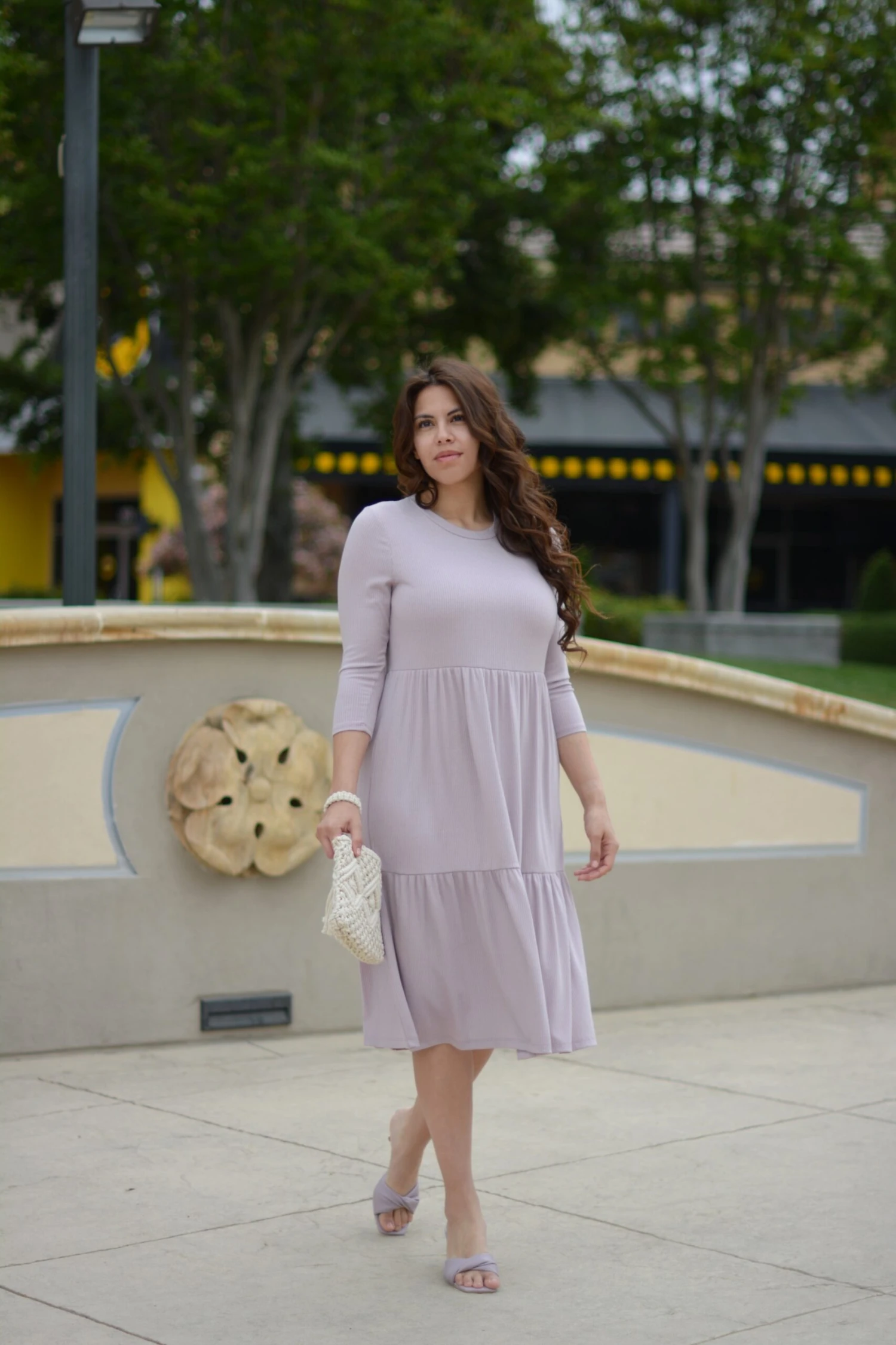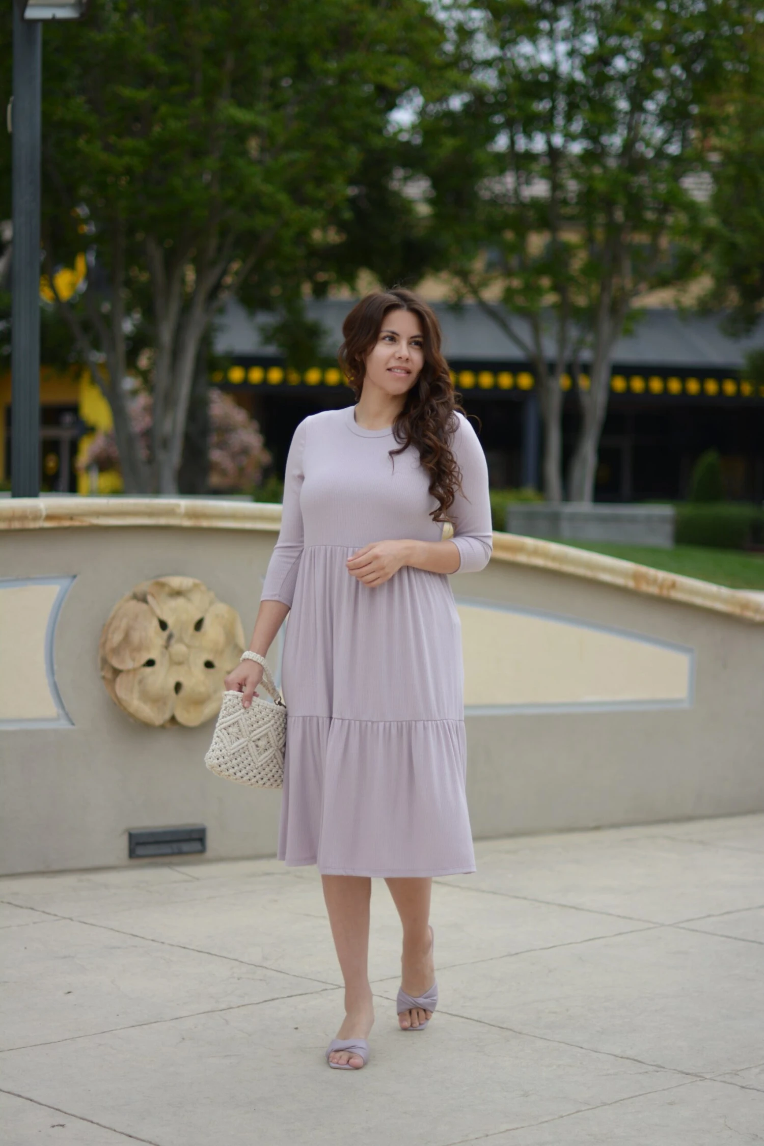 Lovely lavender, our Rowena dress features a ribbed fabric in a subtle lavender shade with 3/4 sleeves and tiered design. Fabric has a nice stretch and fit is true to size. Modeled in medium, 5’6″.