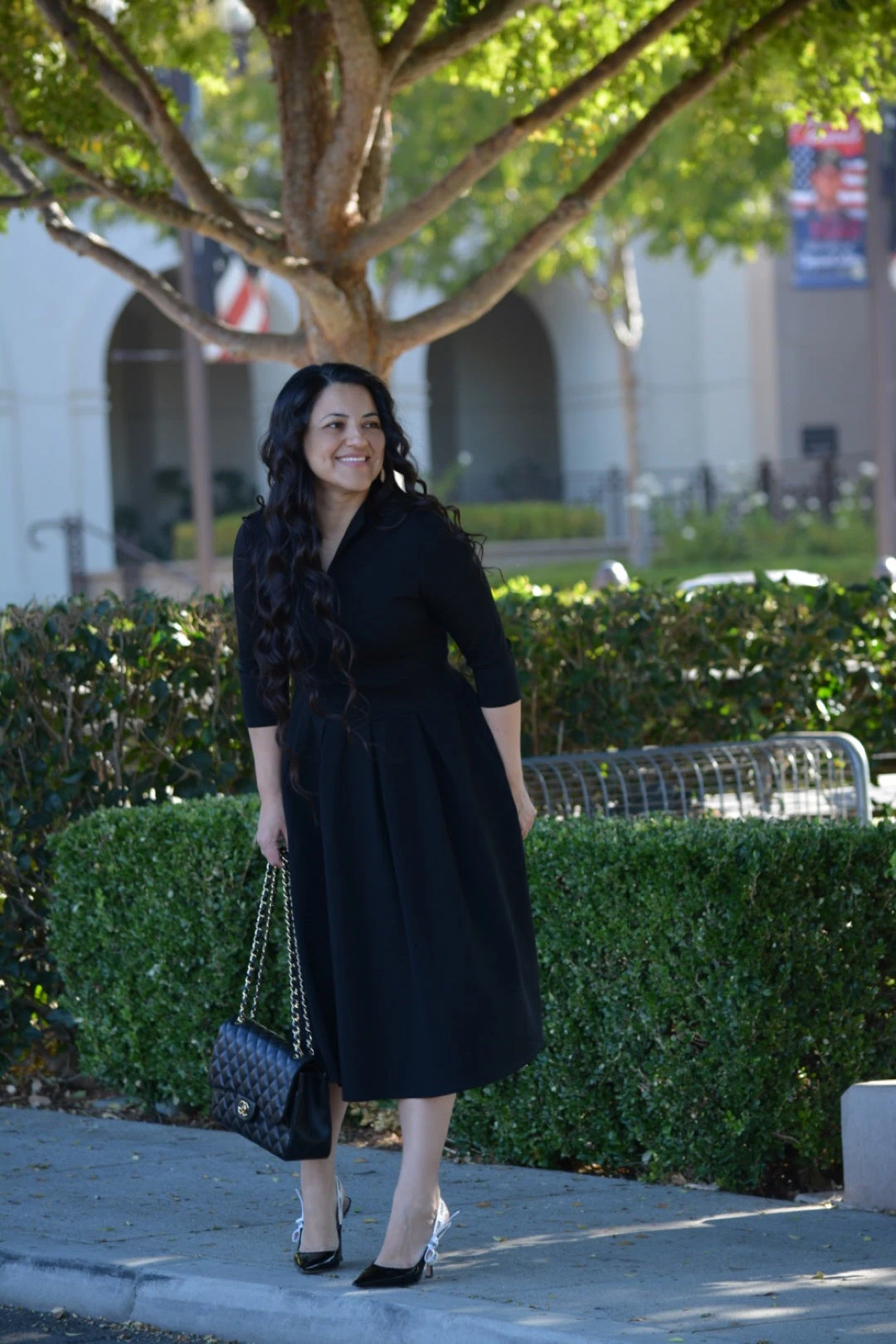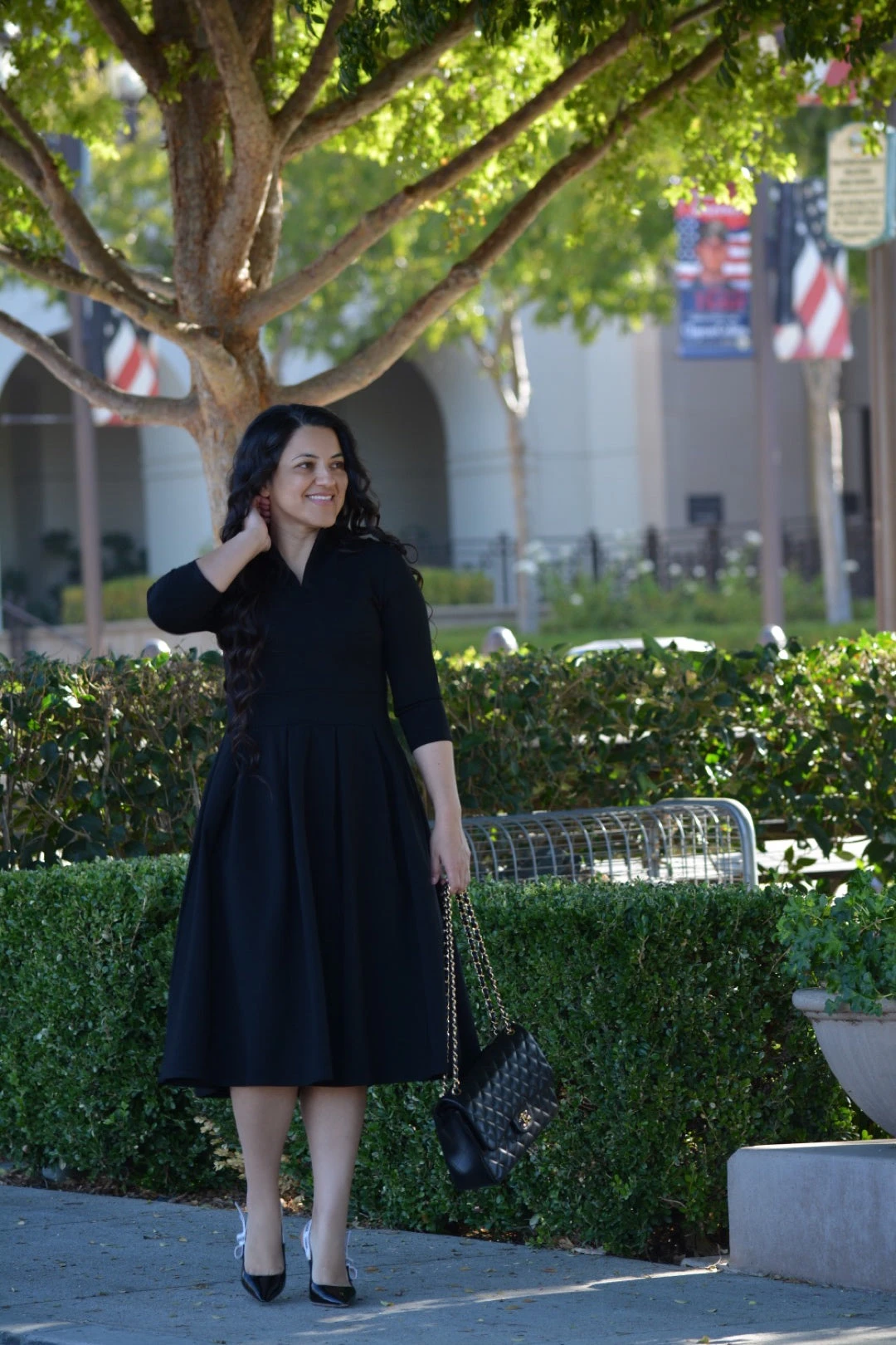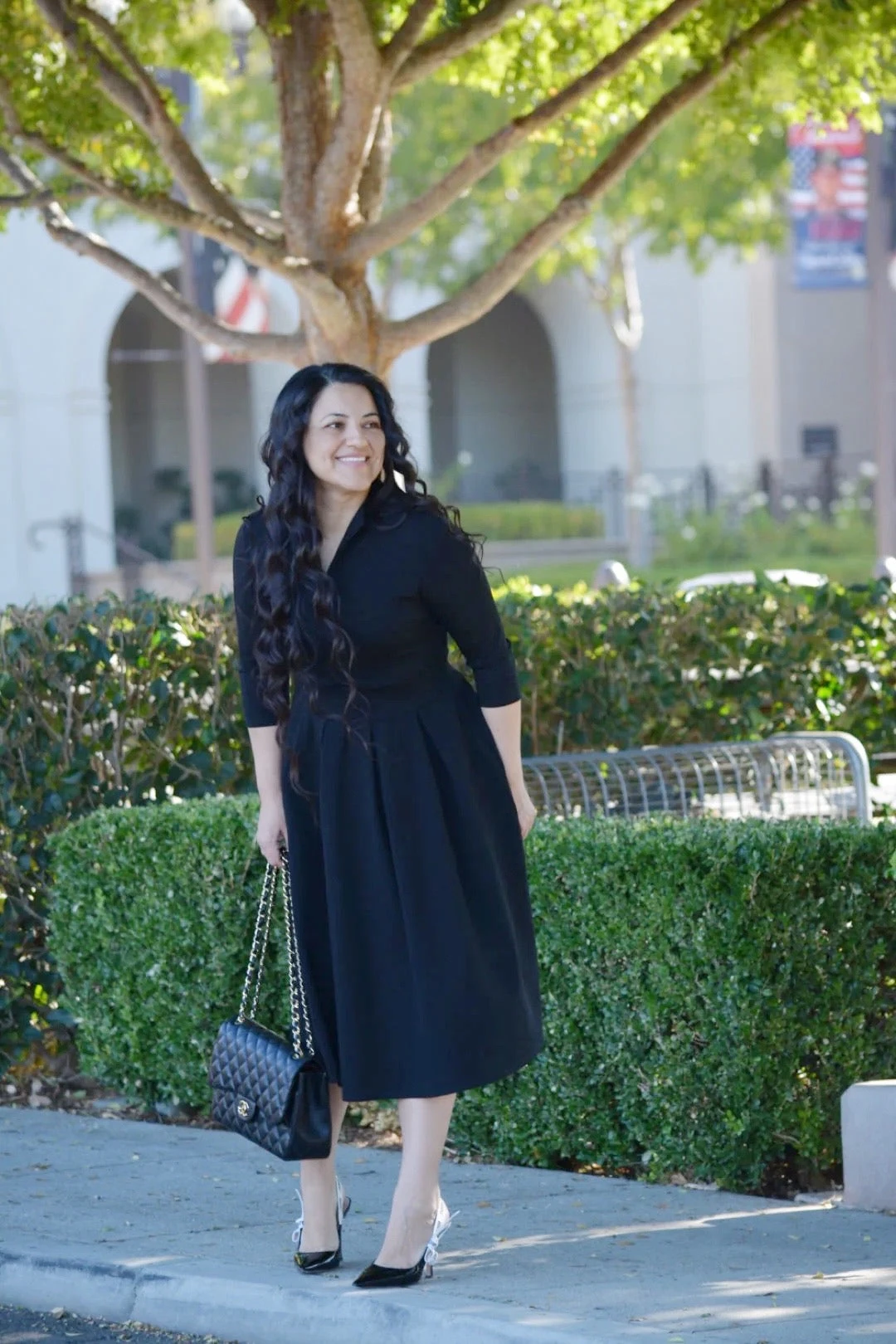 Santorini in black is here!! The newest addition to our Pink Label line, our Santorini dress, was an immediate favorite! Made in the most universally flattering cut there is, the Santorini dress features 3/4 sleeves and a beautifully cinched waist skirted in box pleats. A modest but super flattering “”V”” neckline adds a feminine touch and the the crisp collar adds a bit of fun to the look. The high quality material is somewhat structured (it holds you in nicely) but stretchy and oh, so comfy! The classic style of this dress is a definite nod to one of our customer favorites- the Jacqueline, but we are bringing it to you in a much higher quality fabric, with a perfect, higher neckline. Modeled in small 5’6″ (model with child), and large 5’5.5″.
