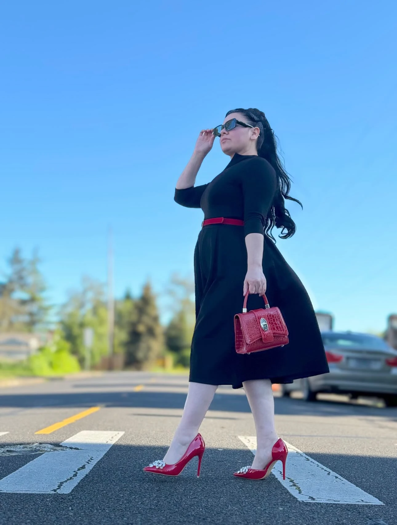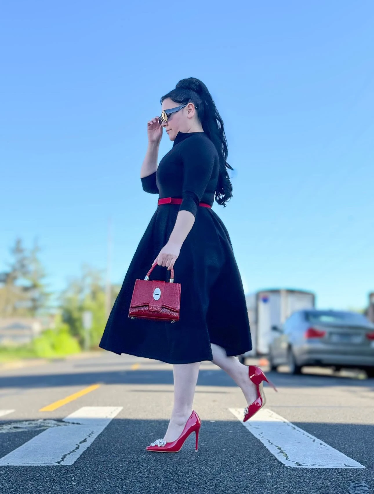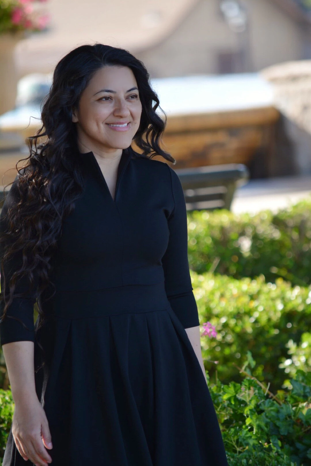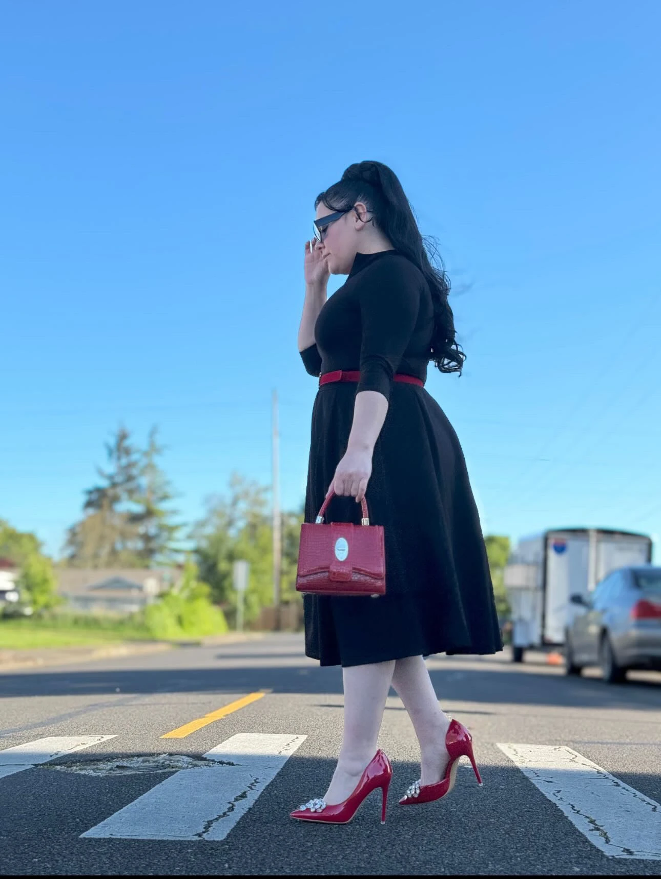 Santorini in black is here!! The newest addition to our Pink Label line, our Santorini dress, was an immediate favorite! Made in the most universally flattering cut there is, the Santorini dress features 3/4 sleeves and a beautifully cinched waist skirted in box pleats. A modest but super flattering “”V”” neckline adds a feminine touch and the the crisp collar adds a bit of fun to the look. The high quality material is somewhat structured (it holds you in nicely) but stretchy and oh, so comfy! The classic style of this dress is a definite nod to one of our customer favorites- the Jacqueline, but we are bringing it to you in a much higher quality fabric, with a perfect, higher neckline. Modeled in small 5’6″ (model with child), and large 5’5.5″.
