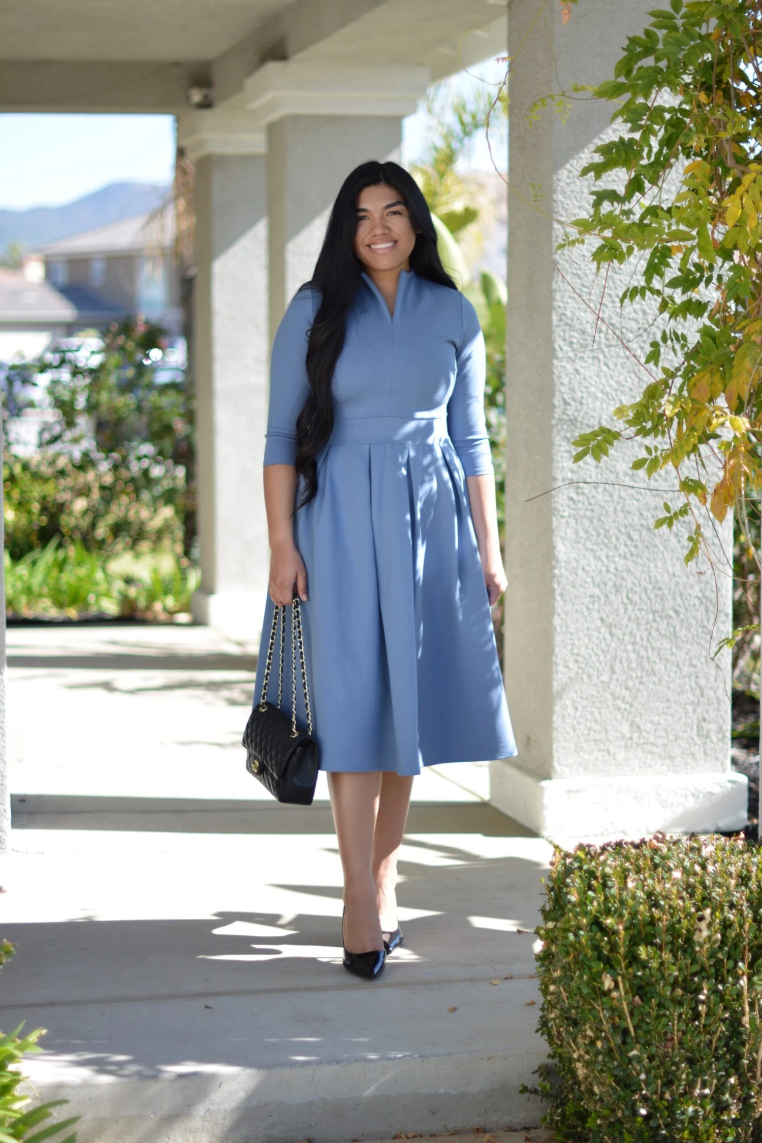 The newest addition to our Pink Label line, our Santorini dress, was an immediate favorite! Made in the most universally flattering cut there is, the Santorini dress features 3/4 sleeves and a beautifully cinched waist skirted in box pleats. A modest but super flattering “”V”” neckline adds a feminine touch and the the crisp collar adds a bit of fun to the look. The high quality material is somewhat structured (it holds you in nicely) but stretchy and oh, so comfy! The classic style of this dress is a definite nod to one of our customer favorites- the Jacqueline, but we are bringing it to you in a much higher quality fabric, with a perfect, higher neckline. Modeled in Small 5’6”.