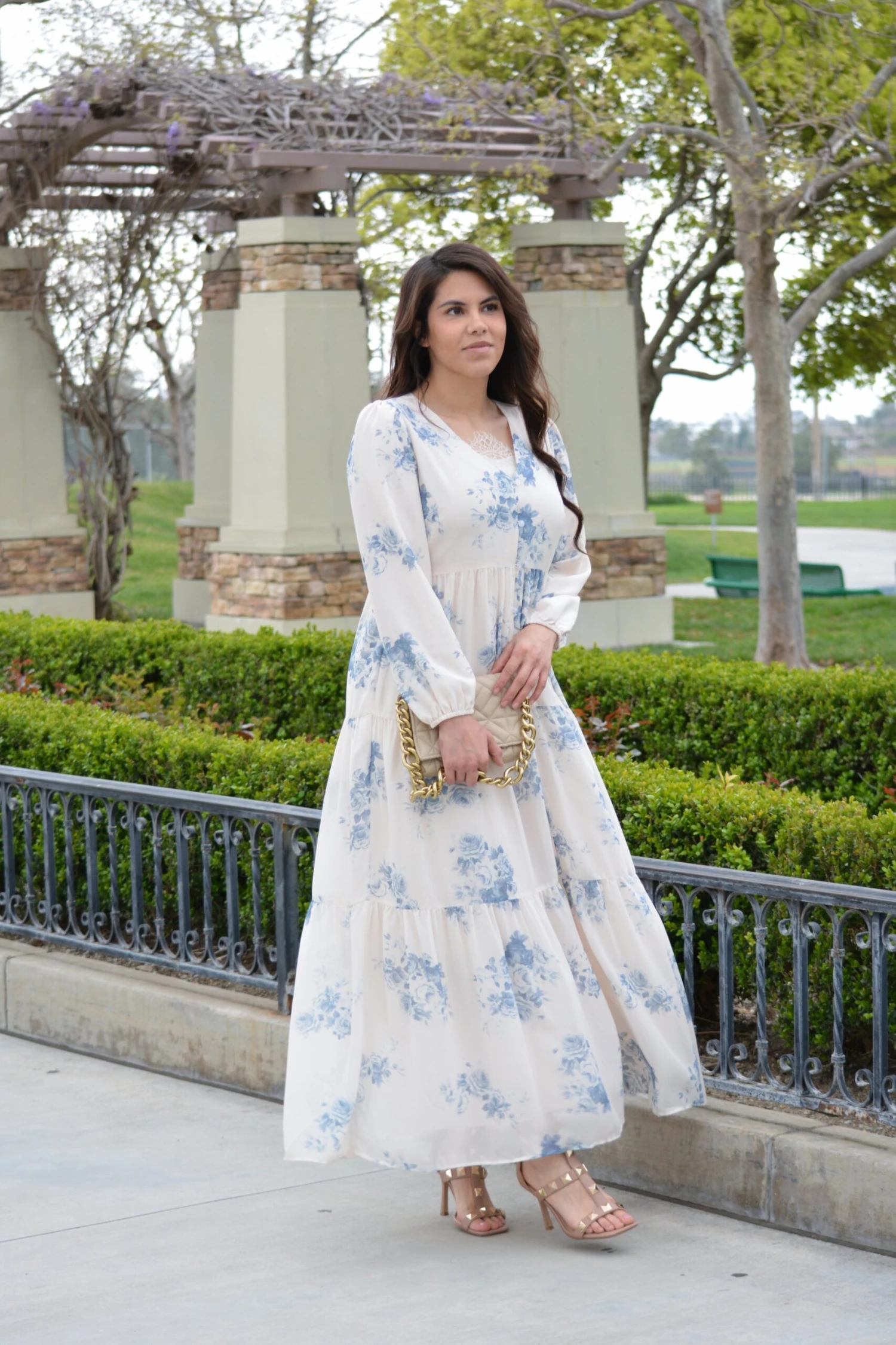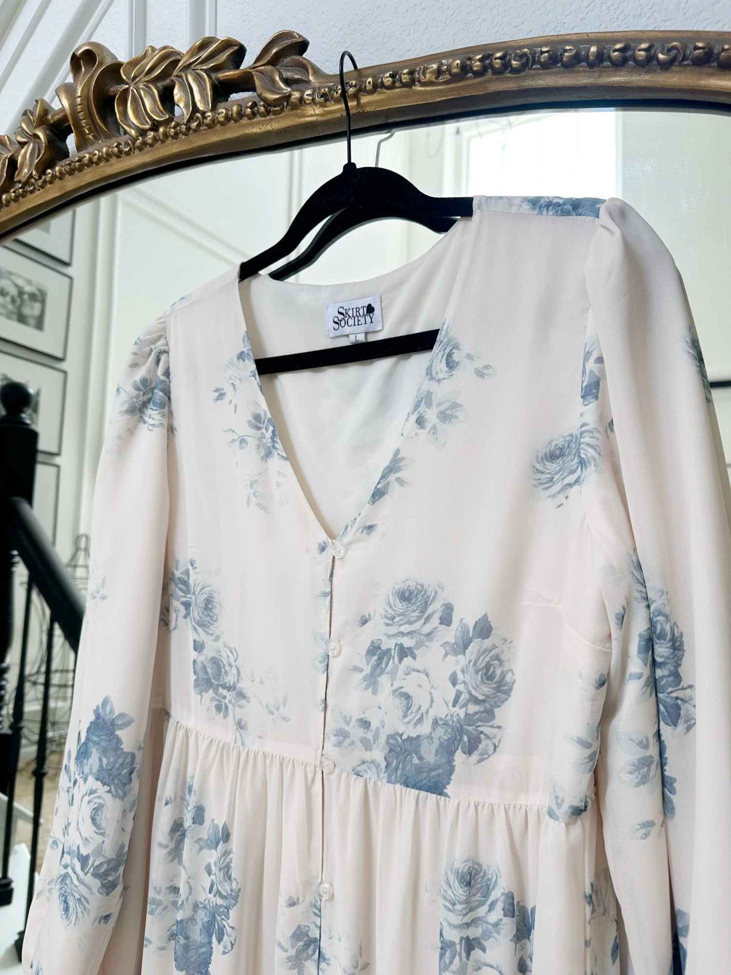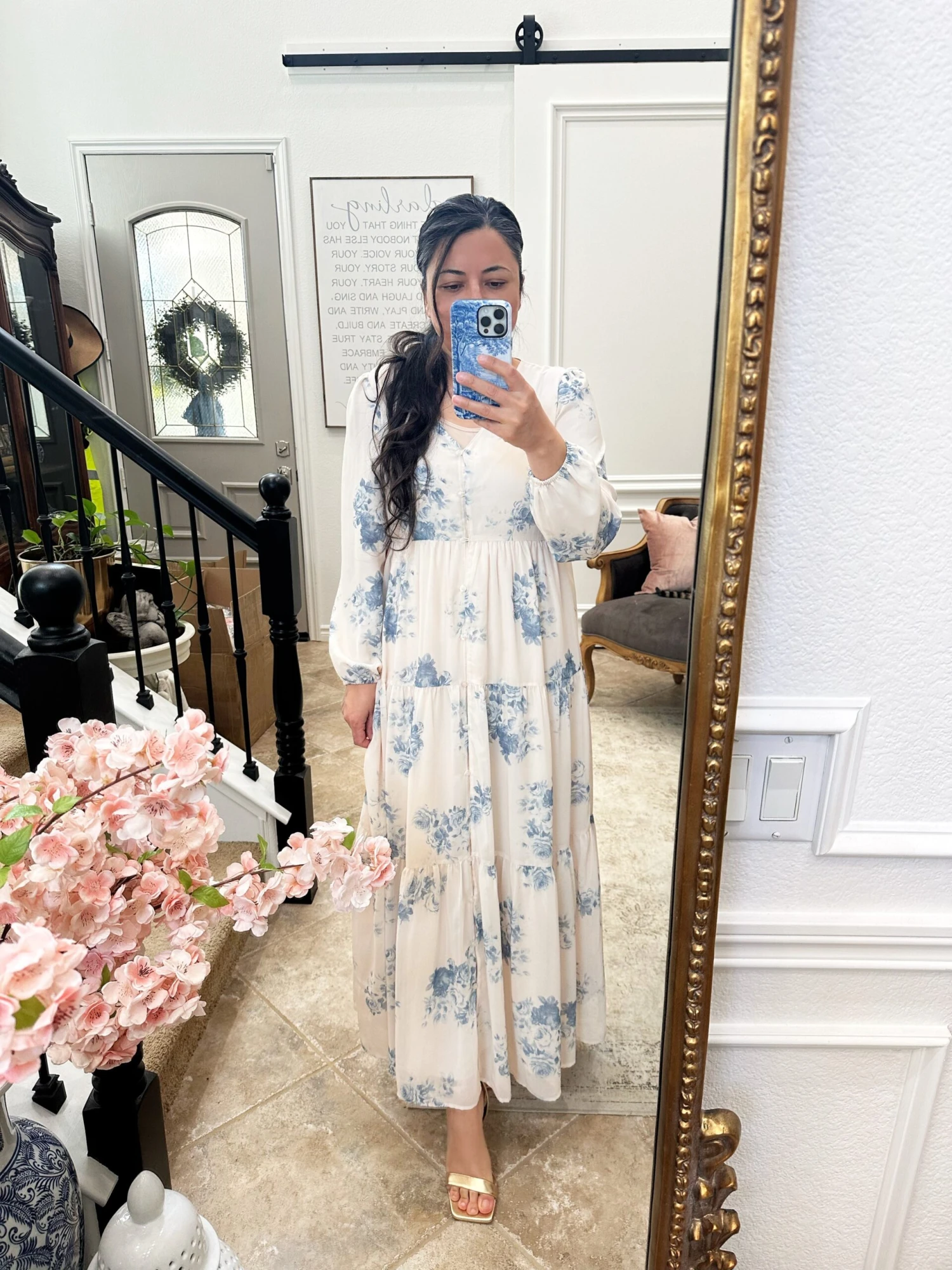 This dress is beautiful! So perfect for spring and summer. Sardinia features a buttoned front (great for nursing moms)with panel behind buttons, beautiful upgraded full lining to hem, elastic back waist and long sleeve in a tiered design. Florals consist of shades of blues. Fabric does not have stretch.