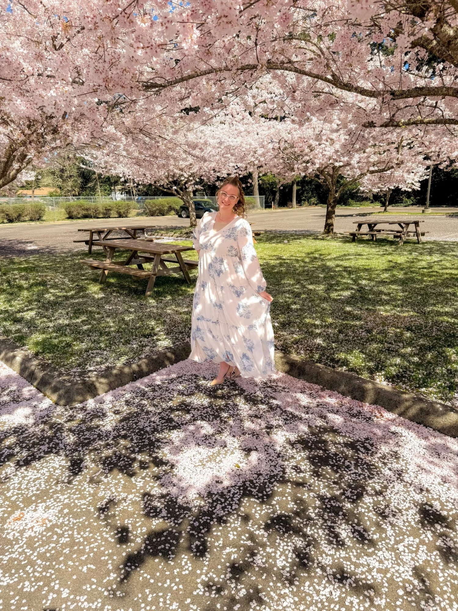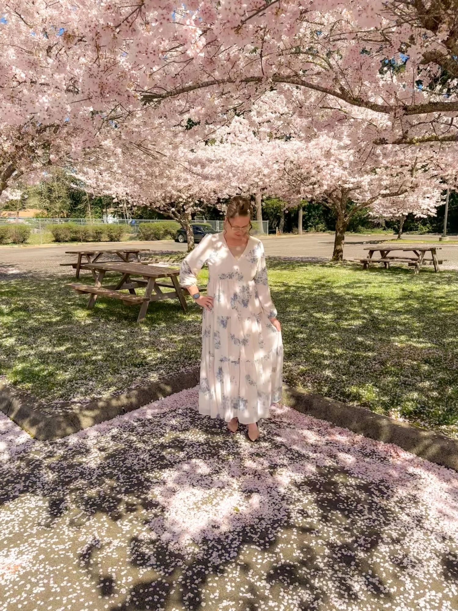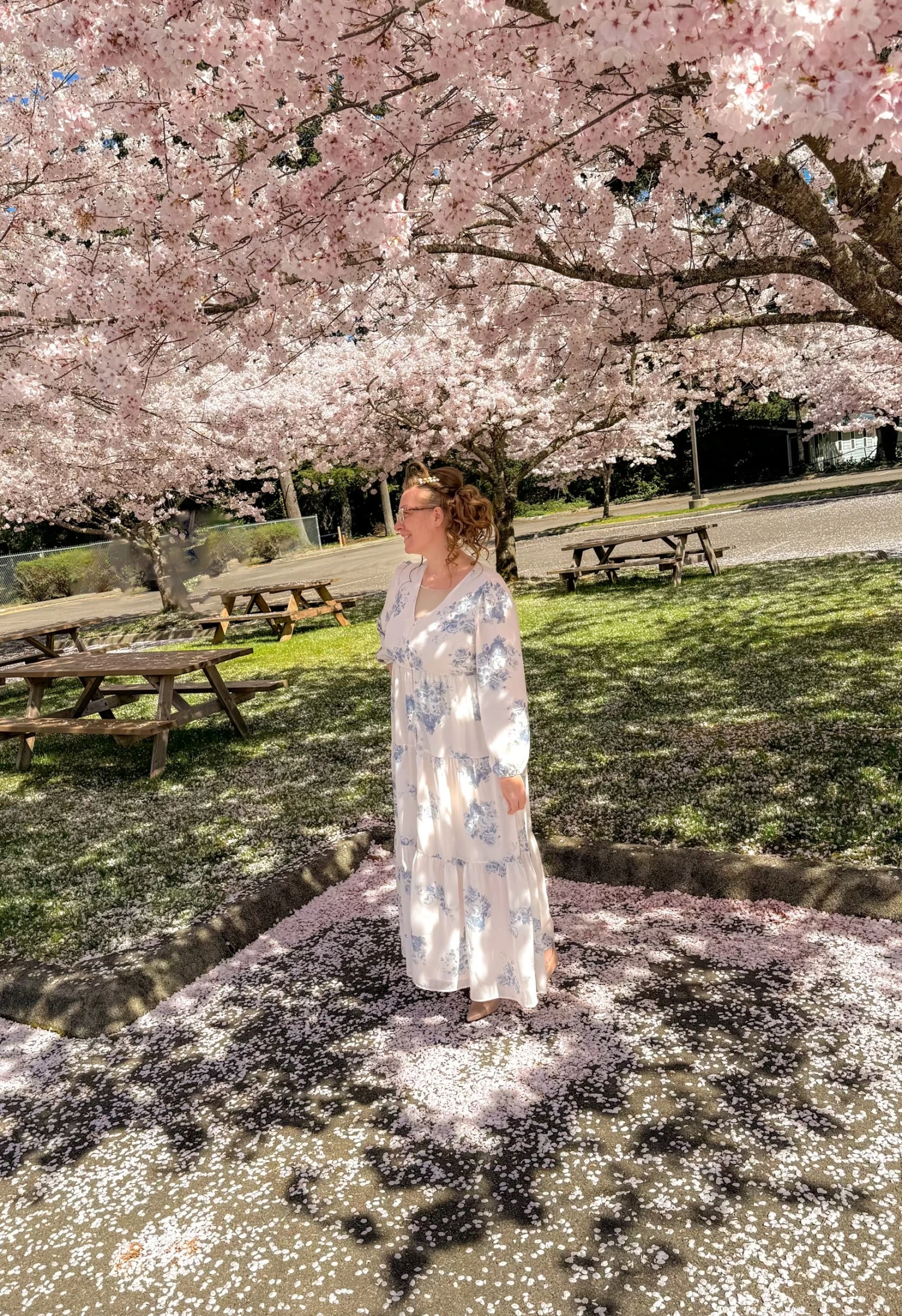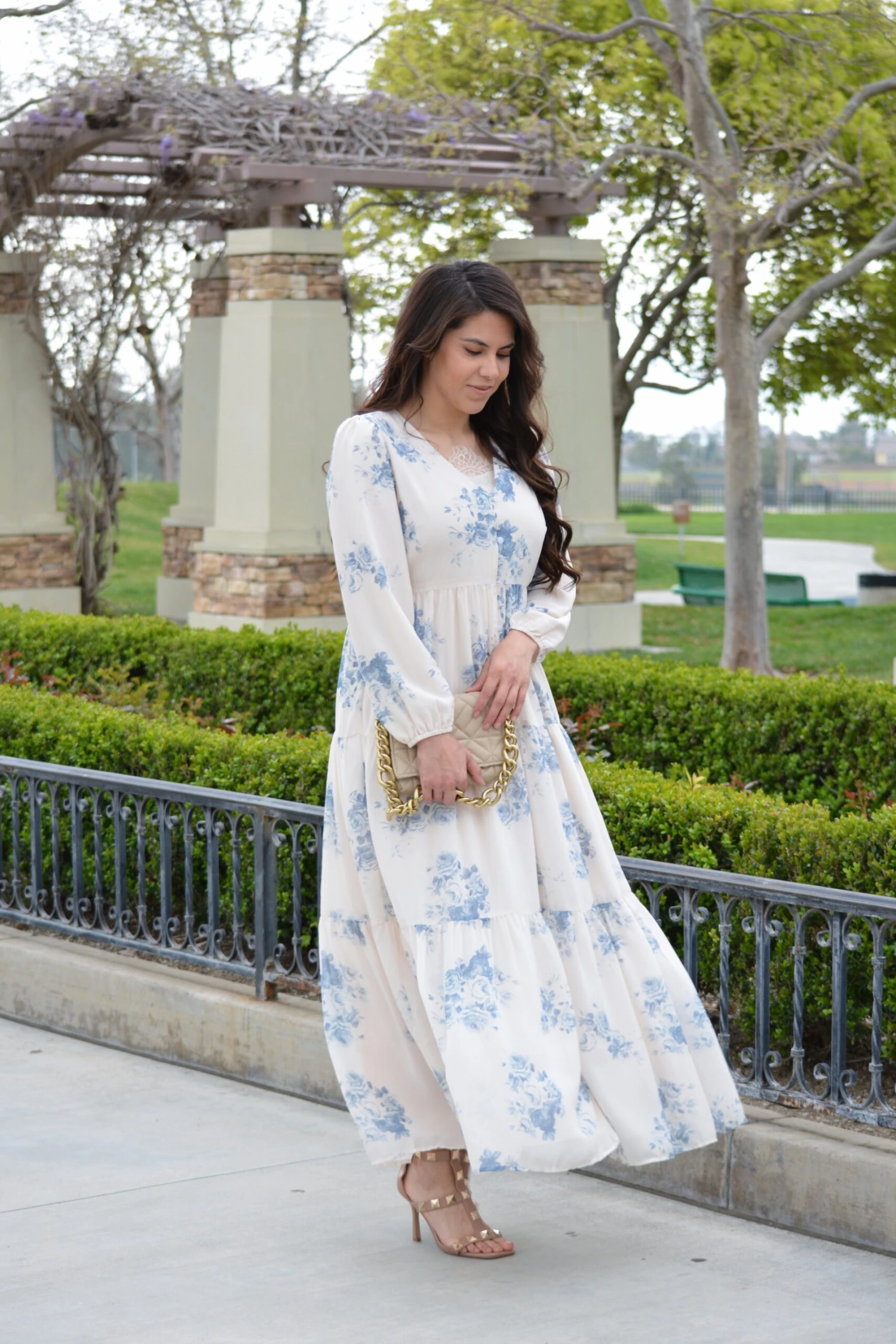This dress is beautiful! So perfect for spring and summer. Sardinia features a buttoned front (great for nursing moms)with panel behind buttons, beautiful upgraded full lining to hem, elastic back waist and long sleeve in a tiered design. Florals consist of shades of blues. Fabric does not have stretch.