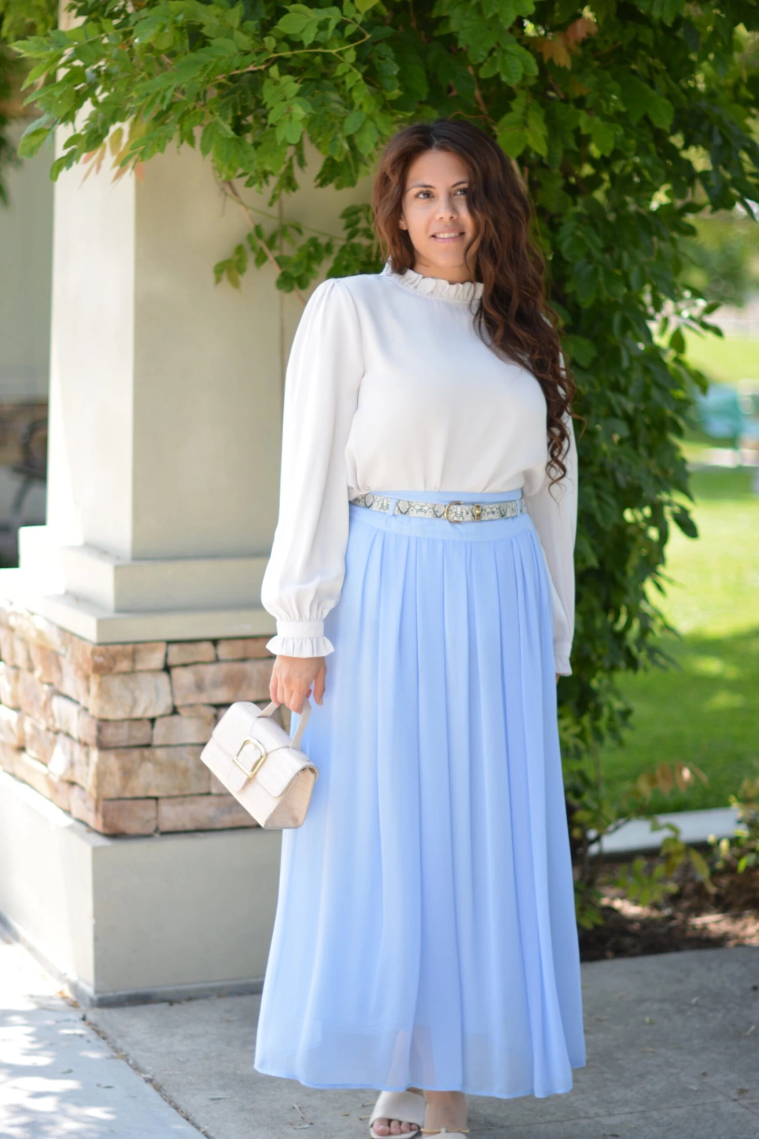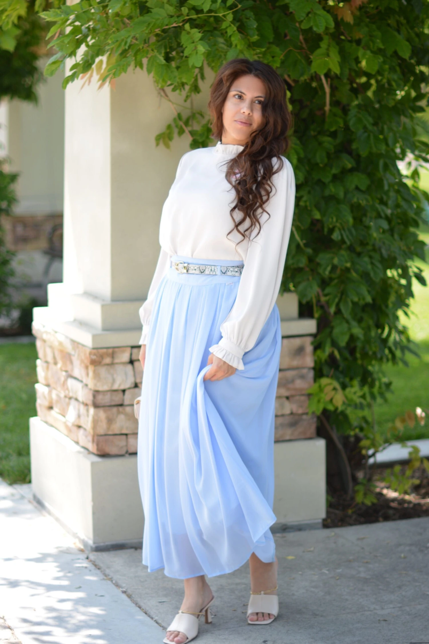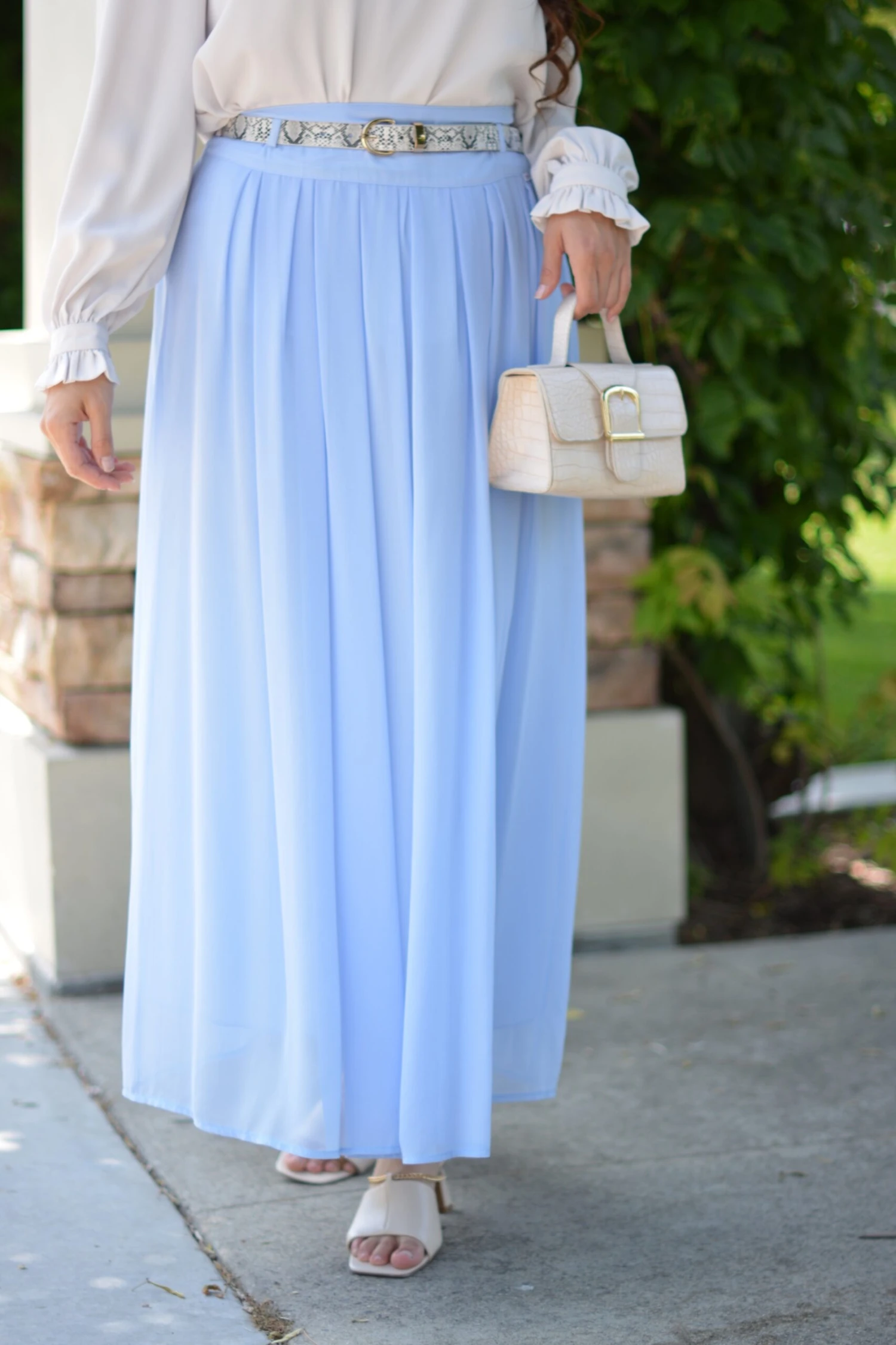 If this skirt isn’t spring perfection then please let us know! Solar features a full lining, side zipper, belt buckles, and a beautfiul pleat style. The waist does not have elastic, so please use the measurements provided. Fit is true to size, modeled in medium 5’6″. Paired here with our Monica top in bone and Lina snake print belt.
