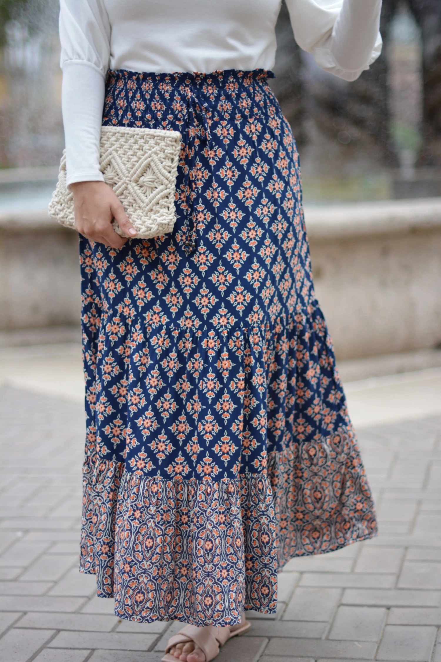 If you’re a fan of boho, this skirt needs you! Sylvie features an elastic waist and faux drawstring in a tiered style. Print includes navy, white, and orange. Paired here with our Chloe top.
