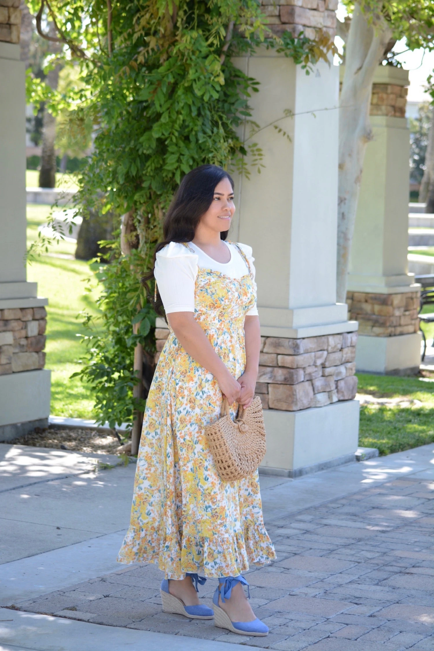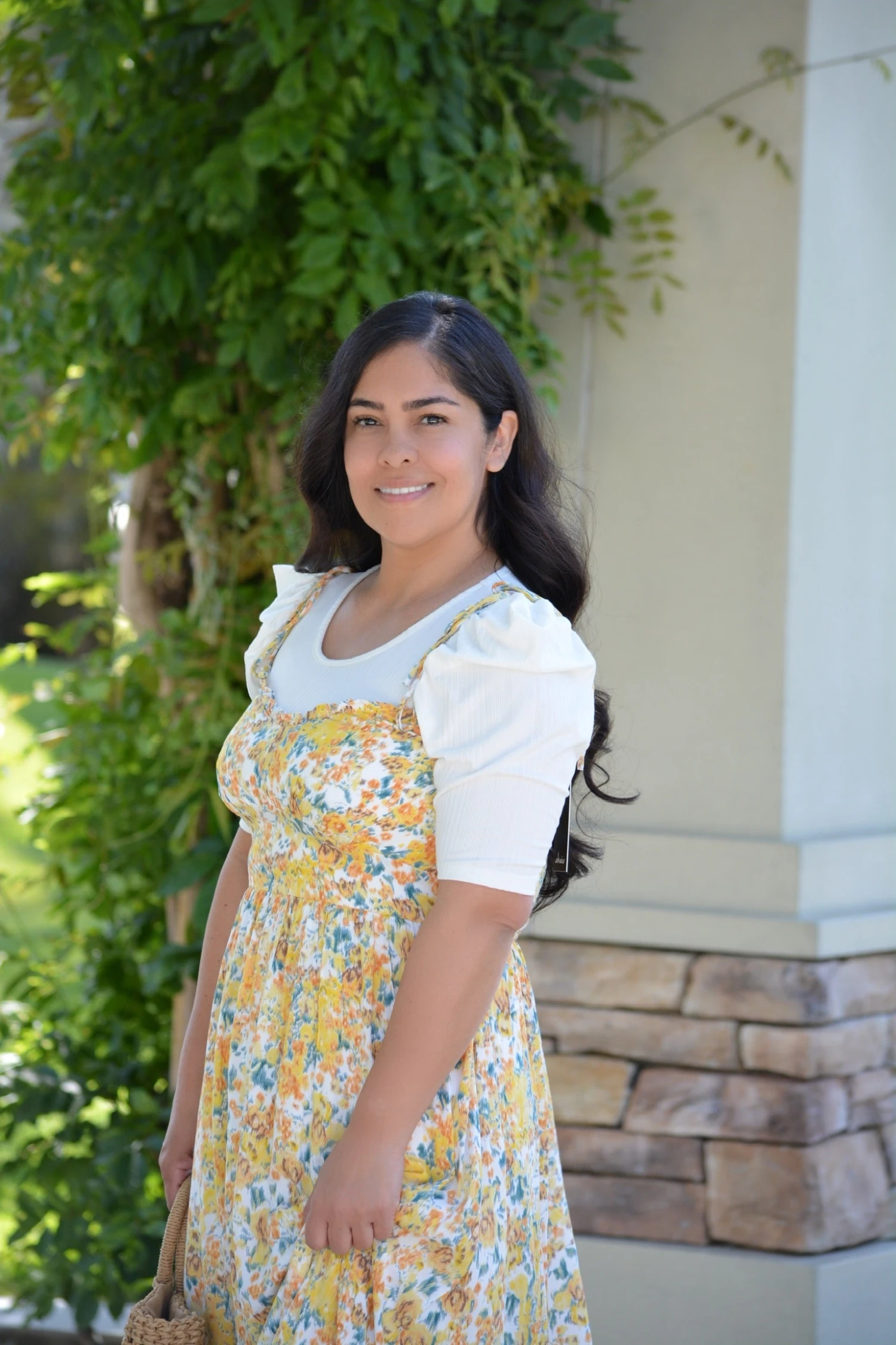 Another favorite for our spring line! This jumper is the most darling, and it just screams spring and summer. Tabitha features a beautiful yellow small floral, adjustable straps, lining, and a smocked elastic back. We paired it here with our Laurel white ribbed top and Marisa denim jacket. Modeled in medium 5’2”.