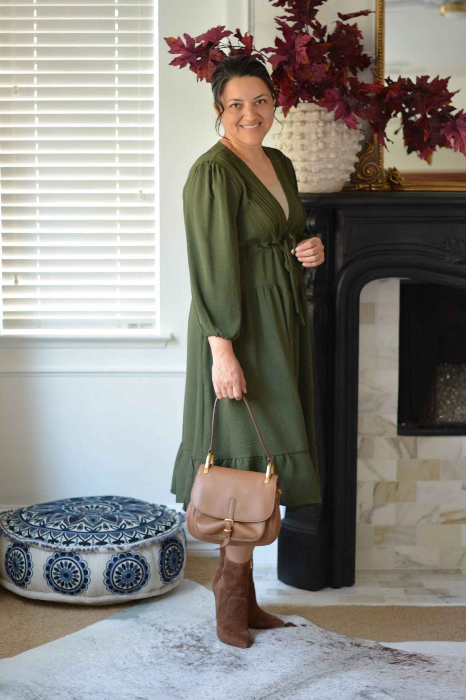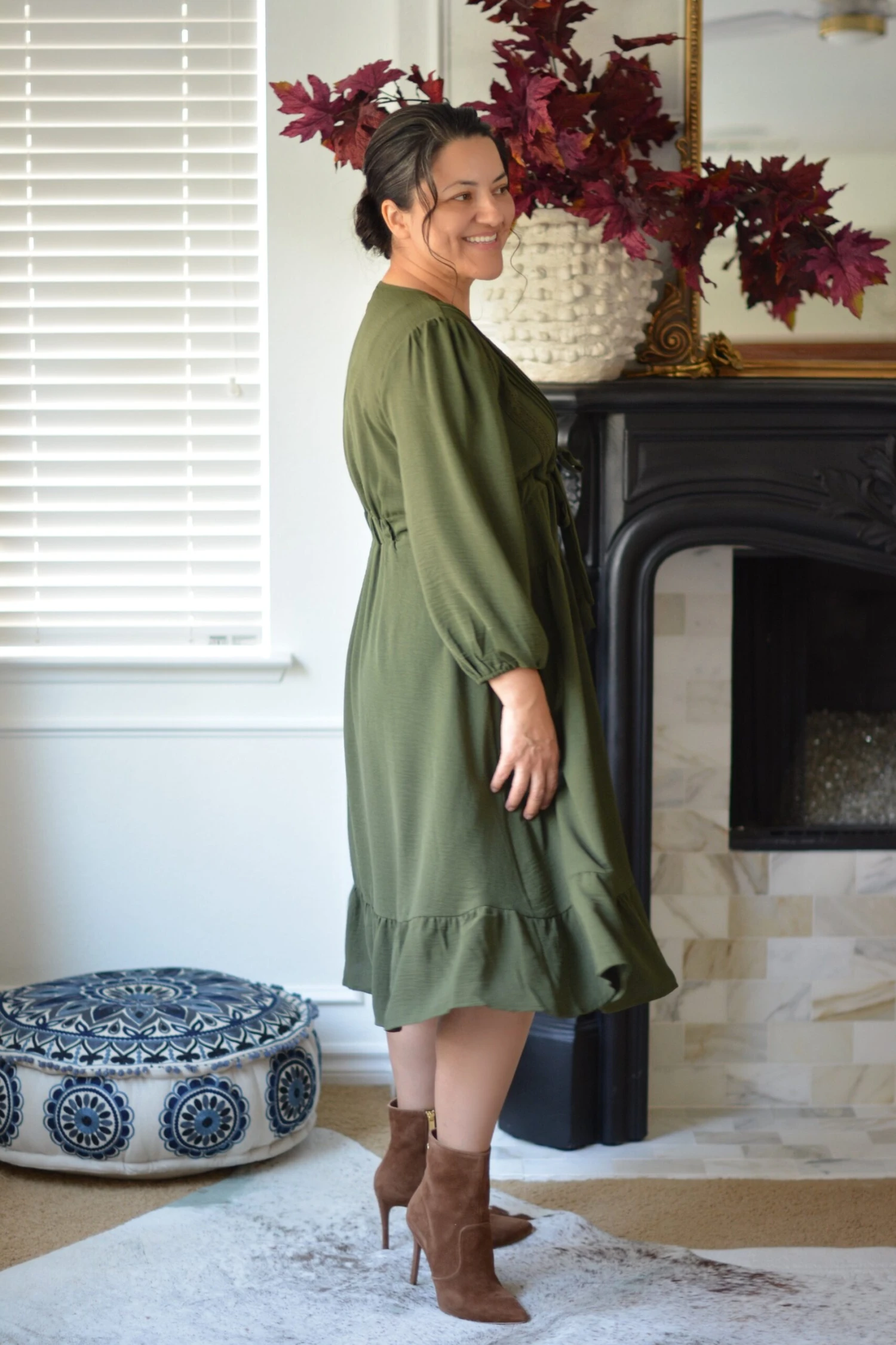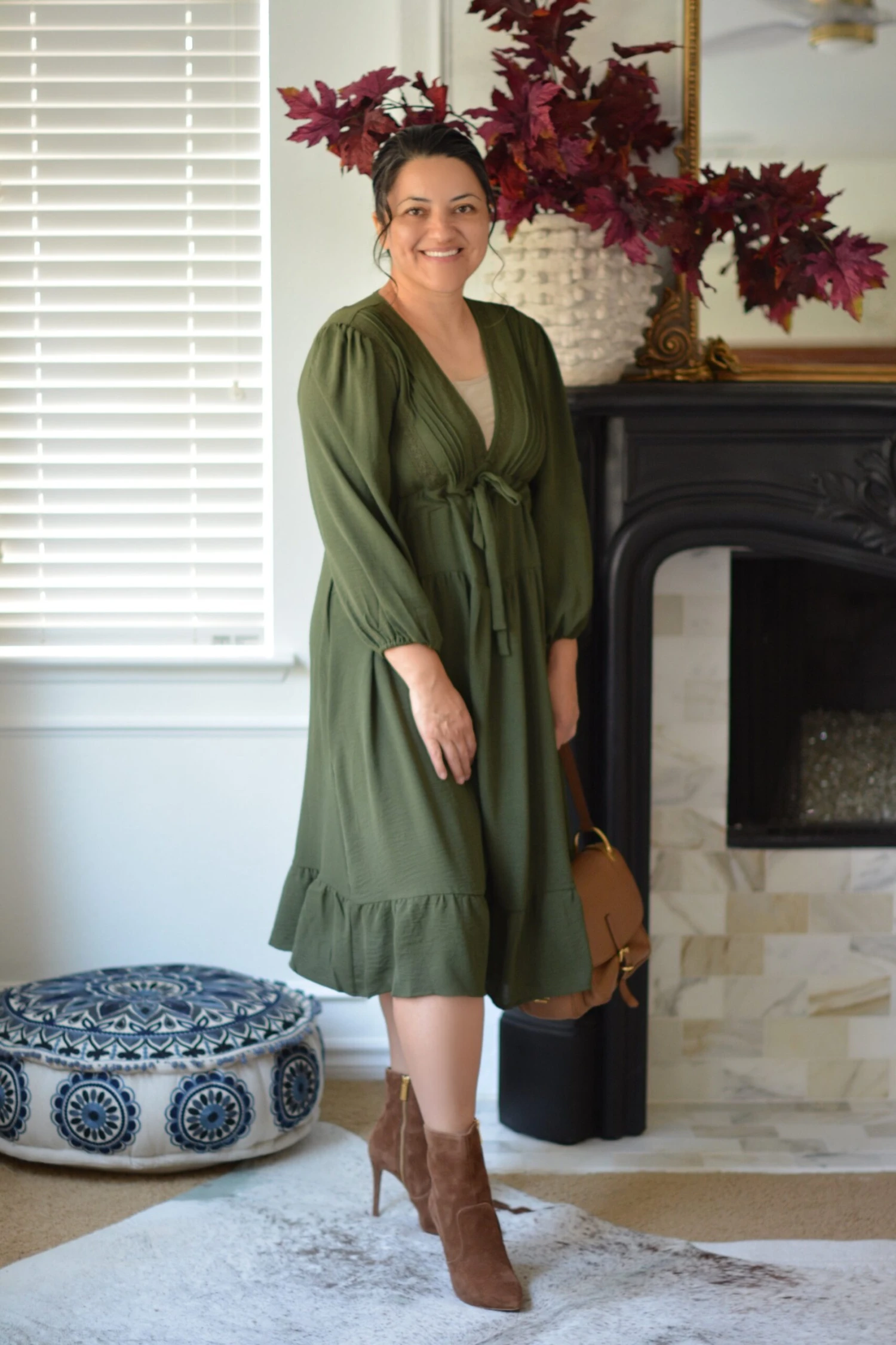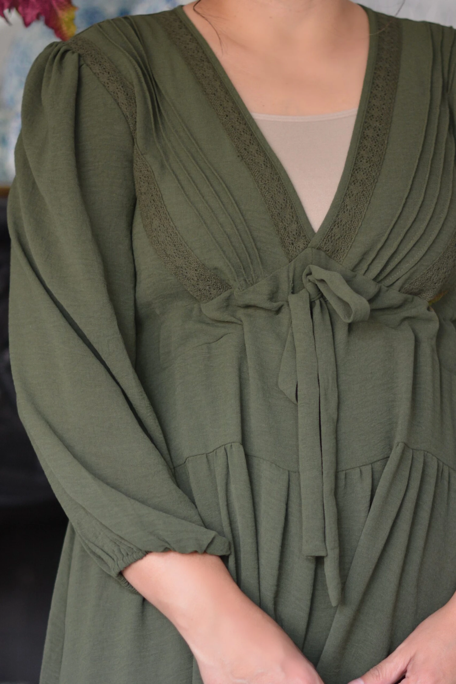 Tamara features a drawstring empire waist, crochet details, elastic back waist, and ruffled hem. Fabric has stretch. Modeled in large 5’5.5”.