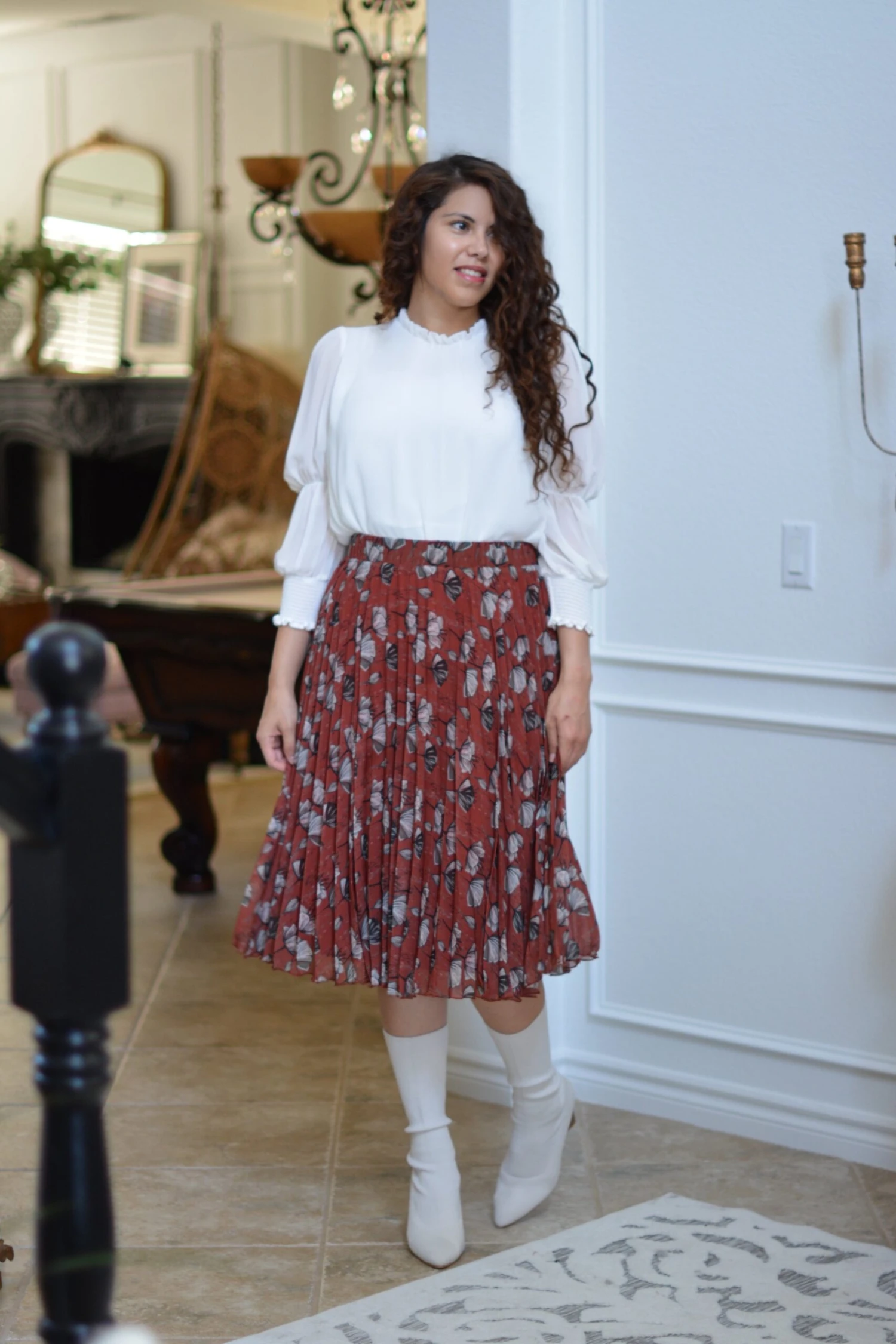 Stunning pleats and fully lined with an elastic waist. Our Tawny pleated skirt is both feminine and modest. Elastic has a nice stretch. Fit is true to size, modeled in medium 5’6″. Paired with our Kylie white top.