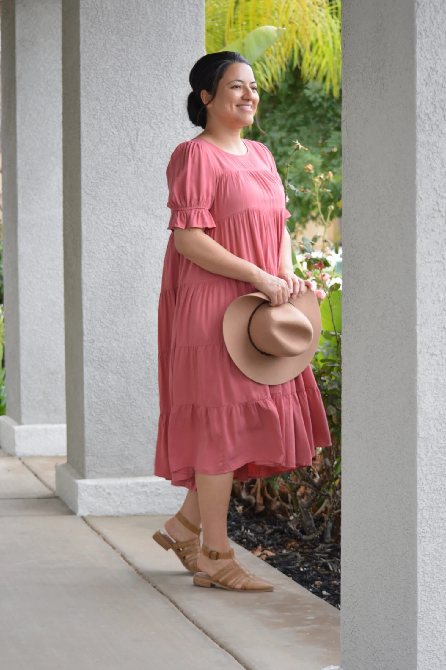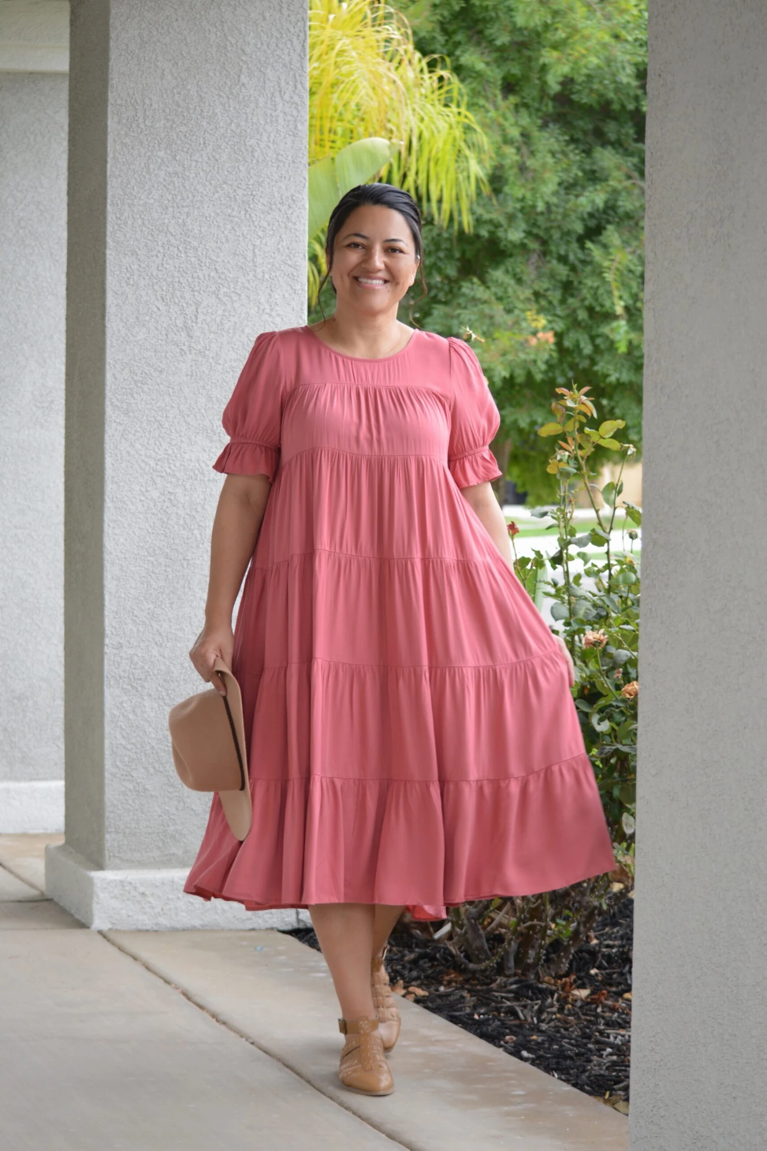 A lot like our past Arwen dresses but now in a thicker solid fabricl. This beauty features a tiered style, ruffled sleeves, lining, and POCKETS in a swing style dress. You can wear it loose or dress it up with a belt. Fabric has no stretch. Modeled in large 5’5.5″.