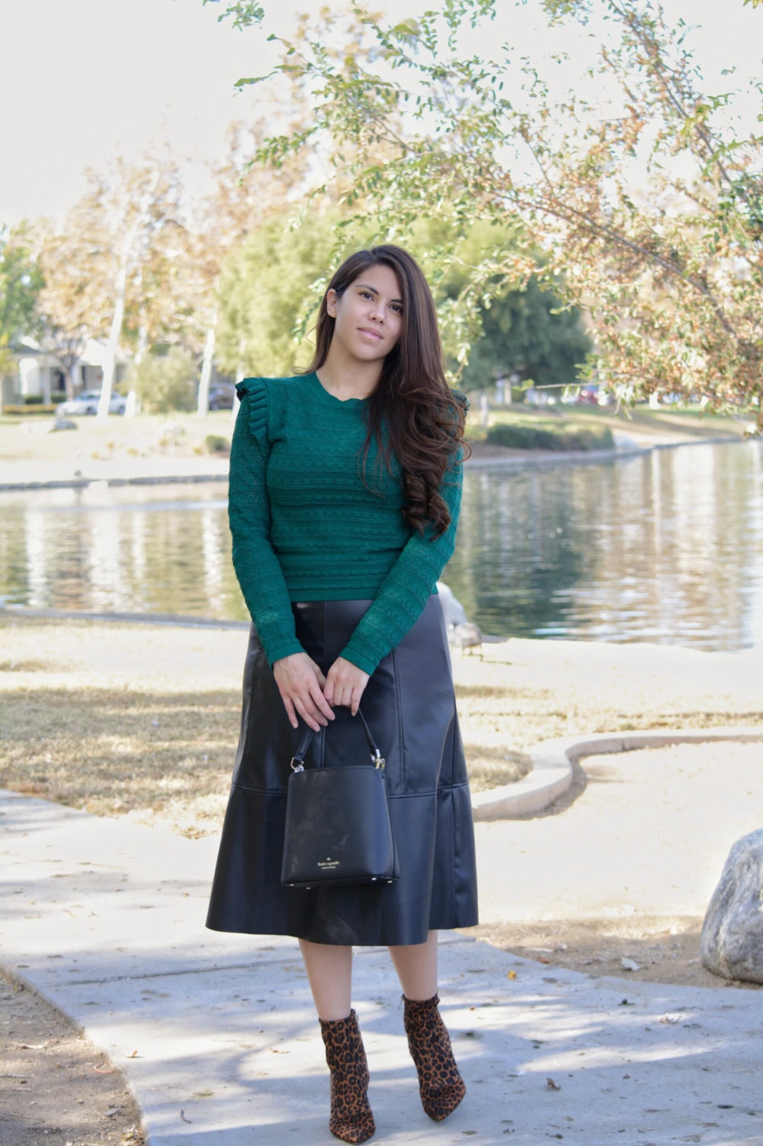 We searched high and low for a faux leather skirt and fell in love with this one. Tiana features accented seams throughout that make it look lux and like real leather! Back has a zipper and material has a slight stretch. Modeled in medium 5’5.5″. Paired with our new Sia knit top.